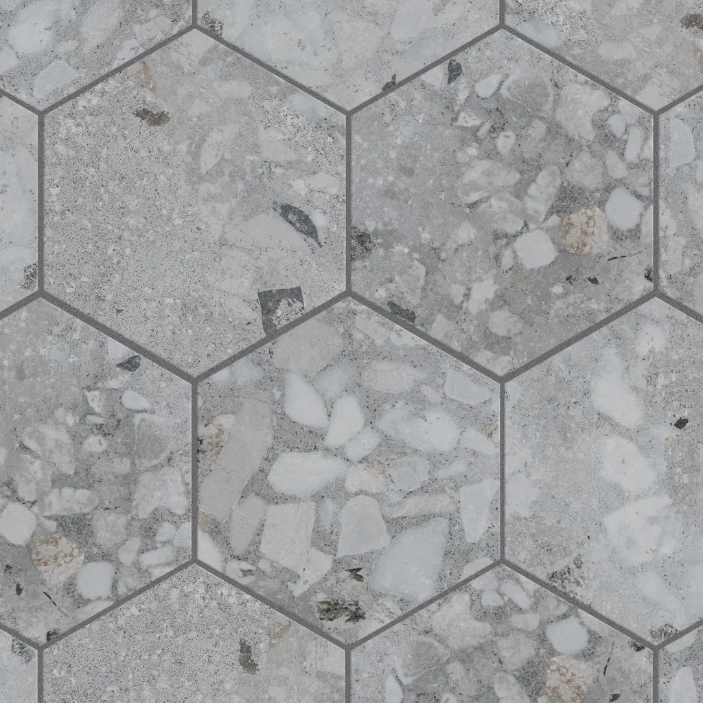 This tile radiates sophistication with its deep charcoal-gray tone and terrazzo-inspired pattern. The speckled design, blending natural stone-look fragments, adds just the right mix of texture and elegance to any setting. Its hexagonal shape? Pure geometry perfection, making it a trendy favorite for designers and DIY enthusiasts alike. Perfect for your most beloved spaces—think a chic shower wall, that jaw-dropping kitchen floor, or even a sleek poolside patio. The matte finish is subtle yet impactful, delivering a soft, tactile look that feels grounded and contemporary. With its slight V2 variation and 10 porcelain faces, every layout tells its own story, ensuring no two surfaces look the same. And it's not just a pretty face. This tile's pressed edges provide a flawless fit, while its stain and frost resistance make it as tough as it is beautiful. Slip-resistant and low water absorption? Bring on wet feet and steamy showers! It's perfect for high-traffic commercial spaces or cozy home updates. Durable, stylish, and oh-so-trendy—this tile truly has it all.
