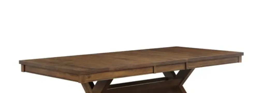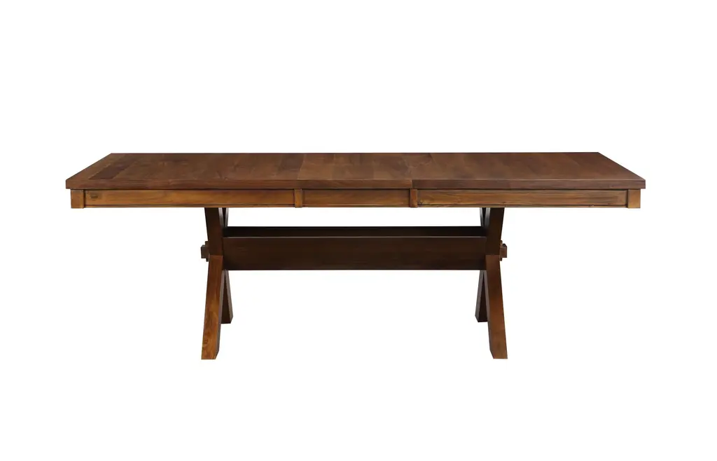 Rectangular Table with Trestle Pedestal, Included 1 x 18" Butterfly Leaf, Padded Seat: PU, Wooden "X" Shape Backrest, Matching Bench (No Storage). KD, Fixed Top: Walnut Finish, Wood Veneer & MDF, Plane Apron, Wooden Trestle Base w/ "X" Shape Leg: Walnut Finish, Rbw. Material: Wood, Veneer (Wood), Wood (Rubber Wood), Wood Veneer (Walnut Sap). Overall Dimension: 42"D x 72" ~ 90"W (Includes 1 x 18" Butterfly Leaf) x 30"H