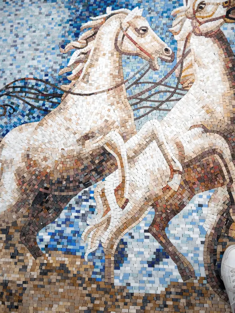 This striking Roman mosaic art depicts the god Apollo powerfully driving his four-horse chariot across the heavens. The dynamic composition and flowing lines capture the energy and majesty of the sun god's daily journey. A testament to ancient Roman mythology and mosaic artistry, this piece brings the iconic imagery of Apollo's celestial ride to life through intricate tile work. Explore the artistry and mythological significance within these mosaic art designs.