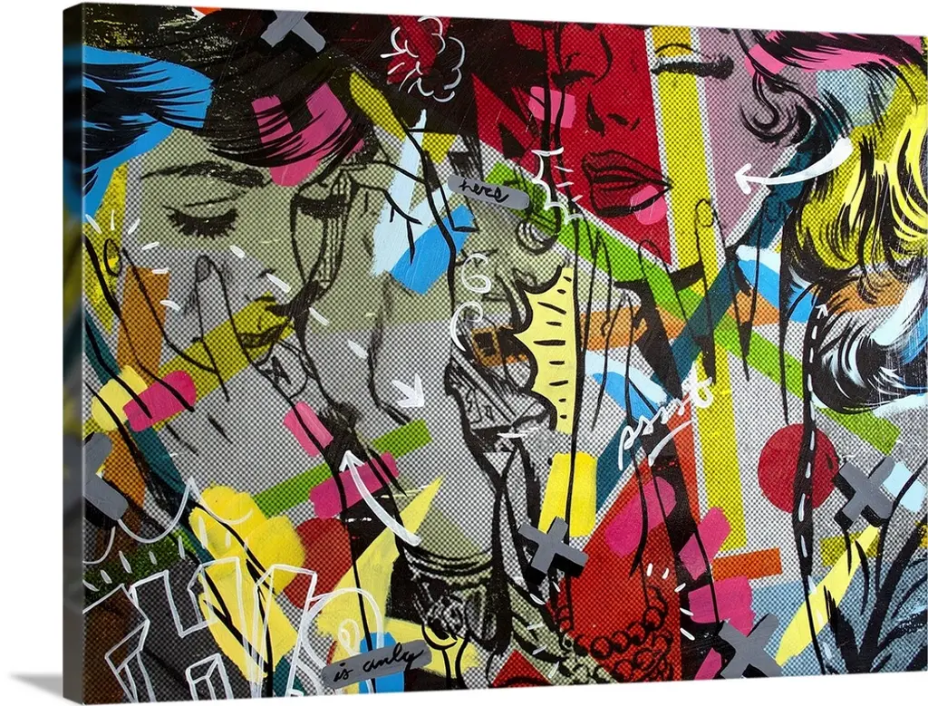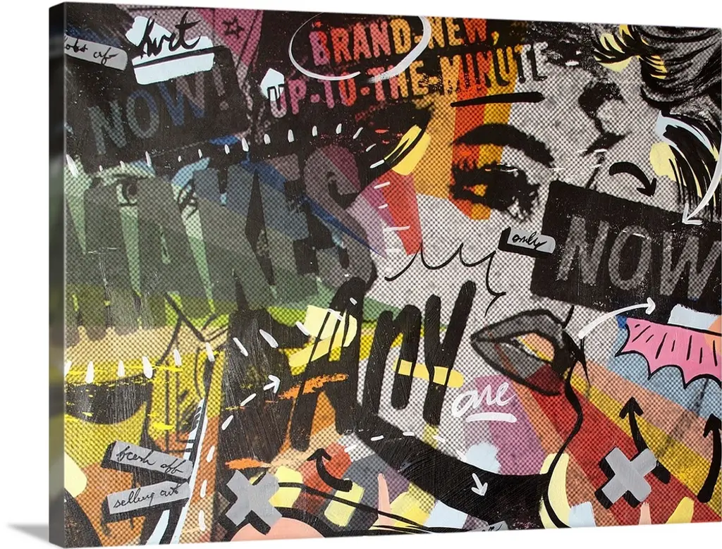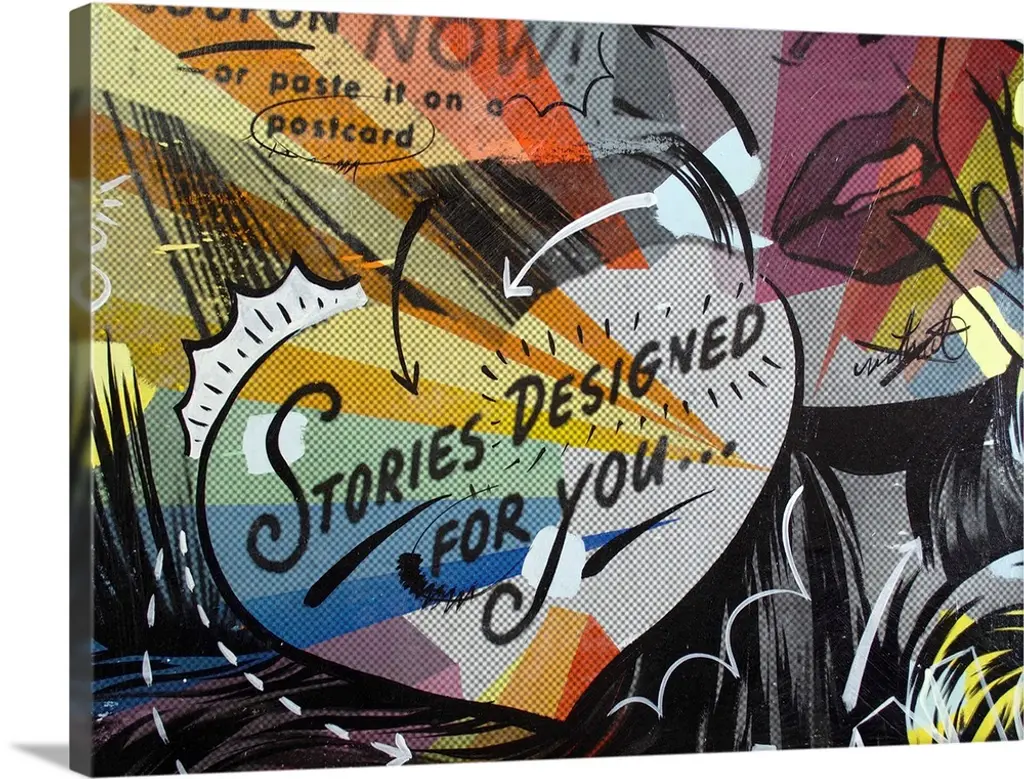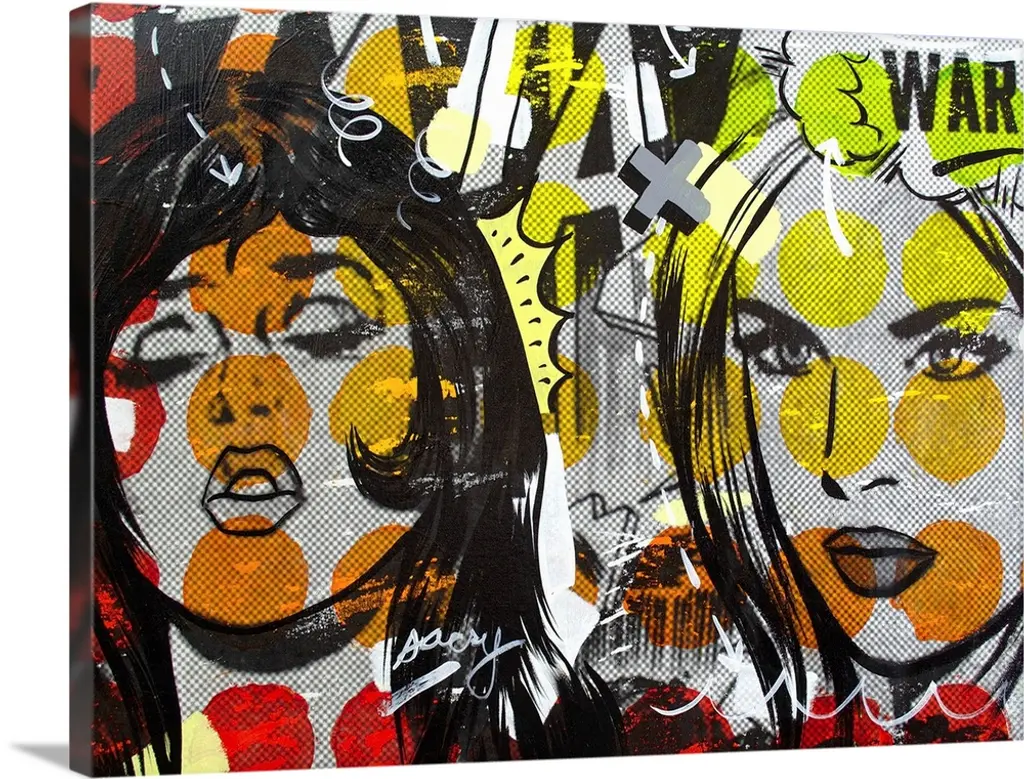 Pop art composed of comic illustrations and bold text, reminiscent of Lichtenstein, of two women having a conversation.