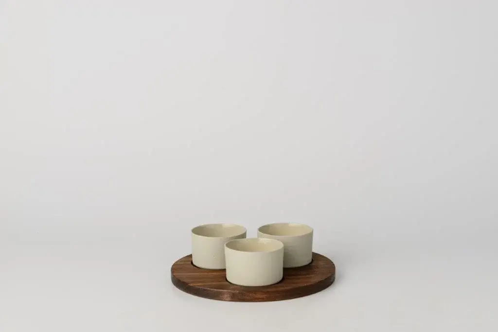 Appetable consisting of a set of three bowls positioned on a walnut wood tray. The cups are in porcelain stoneware made perfectly waterproof from high temperature cooking (1,200 °). Perfectly cleanable, it is unassailable from spots, it has a high hardness, equal to the glass, does not absorb, do not alter colors and shapes over time. The material component is strong and present, protagonist as Matt externally and with polished polish enamel internally and accentuated in its delicacy with non-perfect shapes.