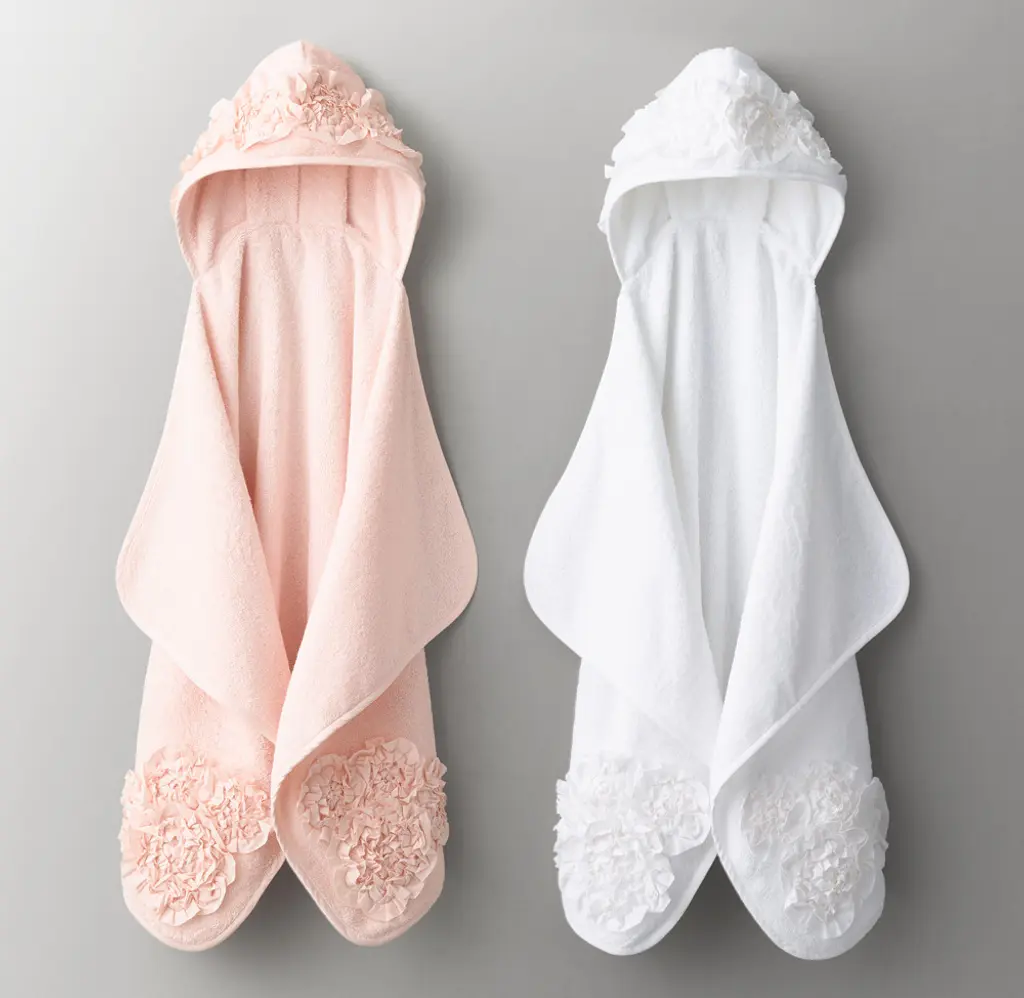 A sweetly sophisticated choice for the bath, this texture-rich composition of gathers and blooms combines ruching and appliqués on lush Turkish terry.