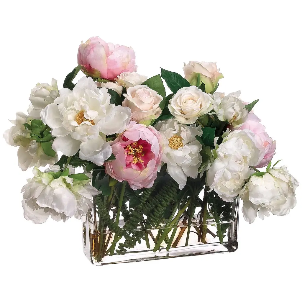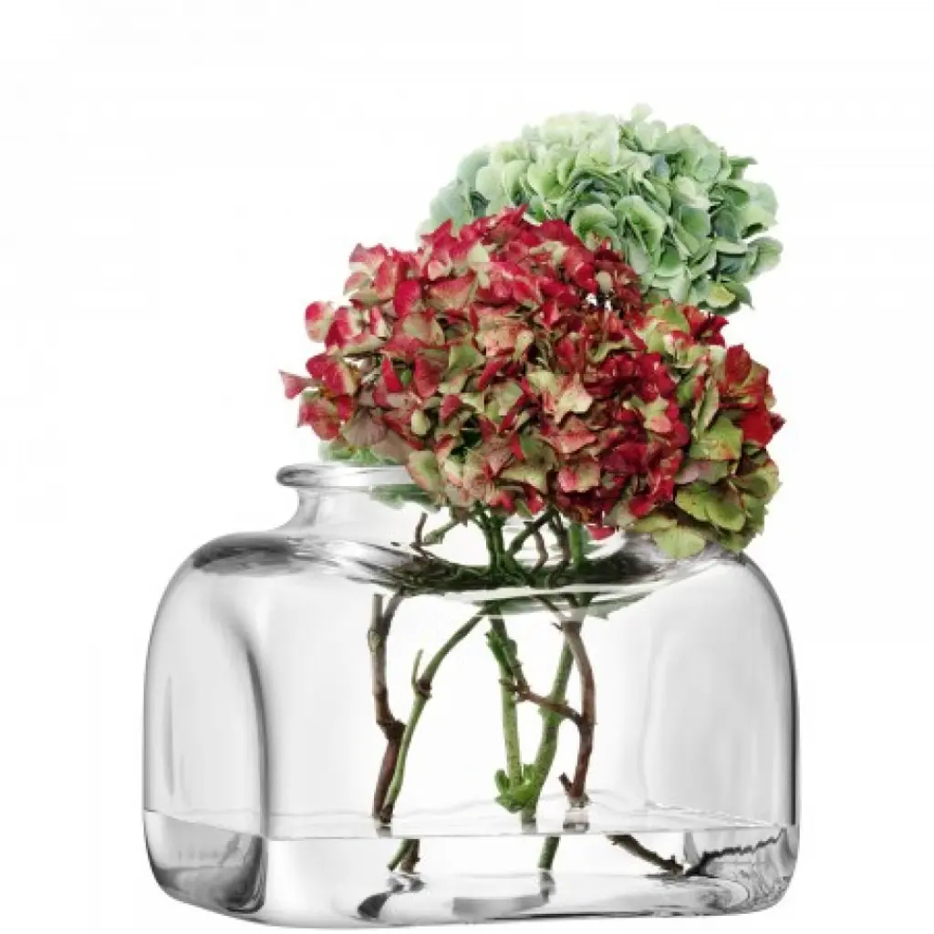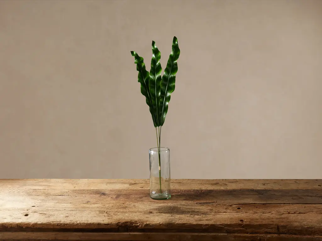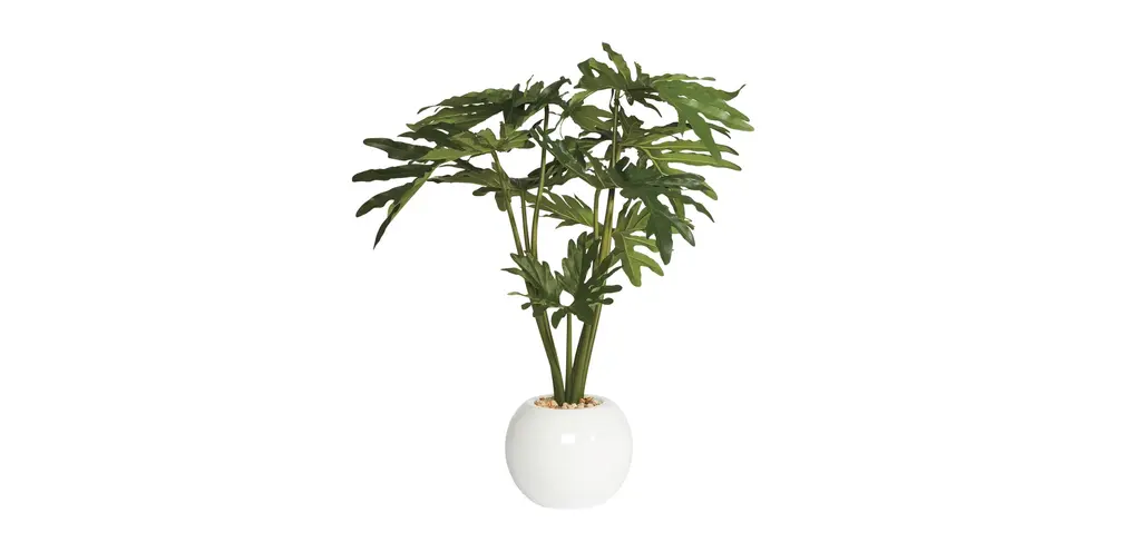Clear glass moon vase filled with large split leaf philodendron leaves in faux water.