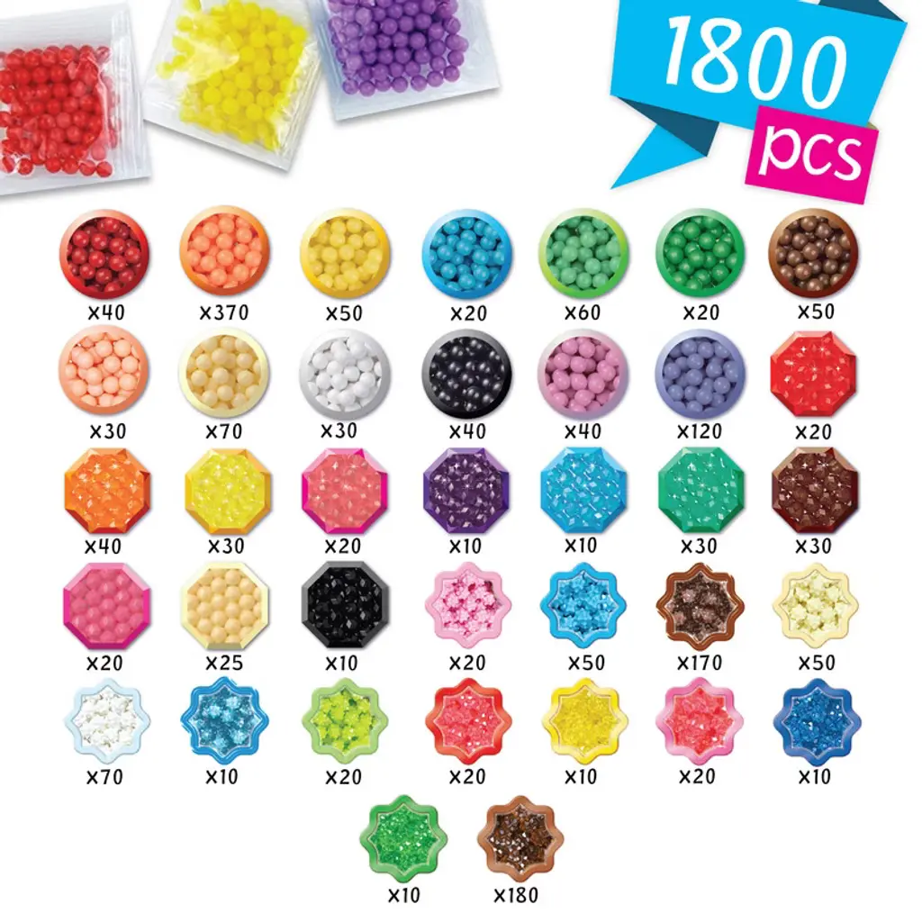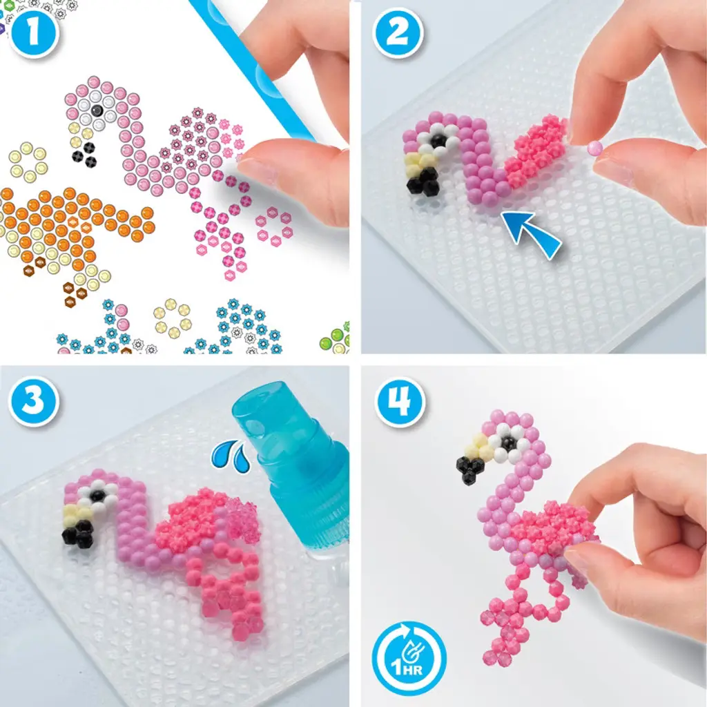 Create a wild safari scene with Aquabeads! Set includes over 1,8 solid, jewel and star shaped beads in a variety of vibrant colors. Also included are templates, layout tray, sprayer and 4 interlocking creation bases with design pegs to display your beadwork. Follow the templates to create bead designs. Once they dry, connect the 4 interlocking creation bases and fix your designs using the design pegs to create a safari scene! Bead designs are interchangeable on the design pegs, allowing you to create many unique wild safari scenes....