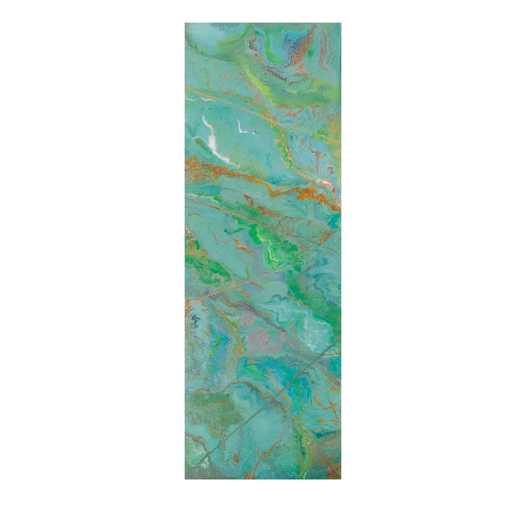 Minimal yet sophisticated, the geometric lines and luxurious texture of this console give it a glamorous appeal that will suit any dining room, living room, or foyer decor. The long, open frame is highlighted by the imposing aquamarine scagliola in superb gradients of blue and green complete with touches of golden yellow and pale pink to evoking the chromatic nuances of the sea. A large steel band in the front highlights the 9-cm thickness of the piece adding a shimmering allure. This masterful work is executed entirely by hand so each piece will exhibit unique variations.