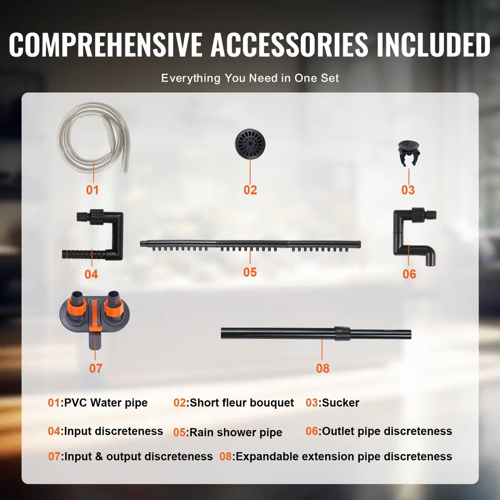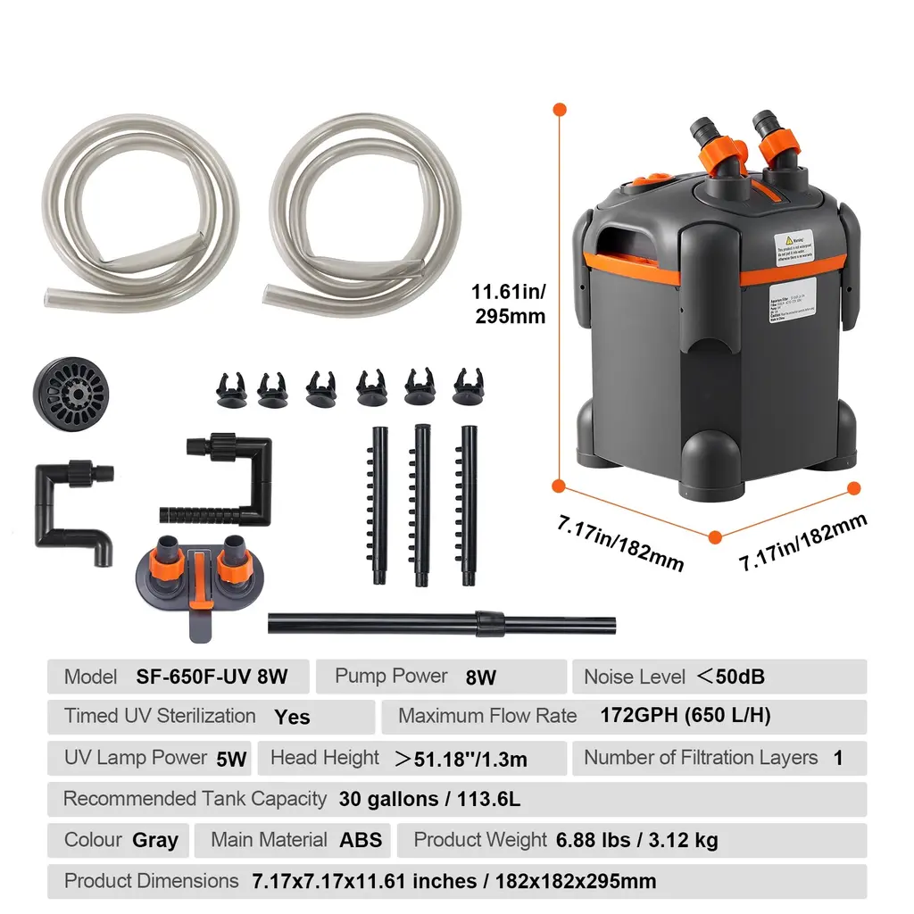 Efficient Filtration: The built-in pump has a maximum flow rate of 225GPH(850 L/H) with a power of 10W, recommended for use in 55-gallon freshwater aquariums, turtle tanks, and fish tanks. / The built-in pump has a maximum flow rate of 172GPH( 650 L/H) with a power of 8W, recommended for use in 30-gallon freshwater aquariums, turtle tanks, and fish tanks. / The built-in pump has a maximum flow rate of 660GPH(2500 L/H) with a power of 25W, recommended for use in 235-gallon freshwater aquariums, turtle tanks, and fish tanks. / The built-in pump has a maximum flow rate of 528GPH(2000 L/H) with a power of 20W, recommended for use in 200-gallon freshwater aquariums, turtle tanks, and fish tanks. / The built-in pump has a maximum flow rate of 396GPH(1500 L/H) with a power of 15W, recommended for use in 120-gallon freshwater aquariums, turtle tanks, and fish tanks. / The built-in pump has a maximum flow rate of 317GPH (1200 L/H) with a power of 12W, recommended for use in 100-gallon freshwater aquariums, turtle tanks, and fish tanks. The water flows through the media layers to filter water and ensure a clean aquatic condition. Each layer has a sponge to hold it in place, and it comes with ceramic rings and bio-balls. Silent Operation: Equipped with pure copper brushless motor, the filter operates extremely quietly. There is no air inside the filter, ensuring low power consumption and high flow rate without any noise. The sound level is less than 50 decibels, so your home life won't be disturbed, while still achieving effective water purification. User-Friendly: The UV lamp has a timer upgrade, allowing for automatic on/off settings at 4/8/24-hour intervals. It also features a flow adjustment valve to regulate water flow from maximum to minimum, and even shut it off completely if desired. The dual quick-release head design makes cleaning and maintenance a breeze, and the inlet has an oil film removal feature to ensure ample oxygen in the fish tank. High Sealing: The quick-release joint design enhances the sealing of the ports, greatly improving the convenience of disassembly and cleaning, and optimizing the leak-proof design. The thickened and tightened silicone ring design reinforces leak prevention. The rotor structure has been optimized to extend its lifespan, with both ends of the rotor becoming an integrated unit. Versatile Application: This aquarium filter is primarily designed to remove remain and waste from fish and turtles in aquariums, keeping the water clear, oxygenated. It is suitable for fish growth and can be used in various settings, including home aquariums, aquarium exhibition tanks, and flower and bird market tanks. It is one of the most essential purchases for aquarium enthusiasts. Friendly Note: Tested flow rates are under no-load conditions and will decrease with filter use and height differences. Package Content 1 x Aquarium Filter 2 x Inlet/Outlet Components 2 x PVC Hoses 47.24''/1.2m 1 x Inlet Hose 1 x Inlet Adjustment Switch 1 x New Oil Film Remover 1 x Oil Film Remover Adjustment Switch 1 x Float Head 1 x Extension Tube 1 x Telescopic Tube 1 x Basket 1 1 x Outlet Hose 1 x Outlet Adjustment Switch 1 x Elbow Tube 1 x Air Flow Regulator 1 x Air Tube 1 x Outlet Nozzle 1 x Basket 2 1 x Plug 5 Suction Cups 2 x Rainfall Pipes 1 x UV Lamp Glass Tube 1 x User Manual 172GPH option Package Content 1 x Aquarium Filter 1 x Inlet/Outlet Components 2 x PVC Hoses 47.24''/1.2m 1 x Inlet Hose 1 x Extension Tube 1 x Basket 1 x Elbow Tube 1 x Outlet Hose 6 x Suction Cups 3 x Rainfall Pipes 2 x Sealing Rings 1 x User Manual