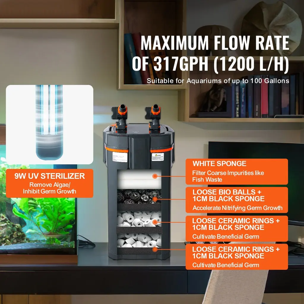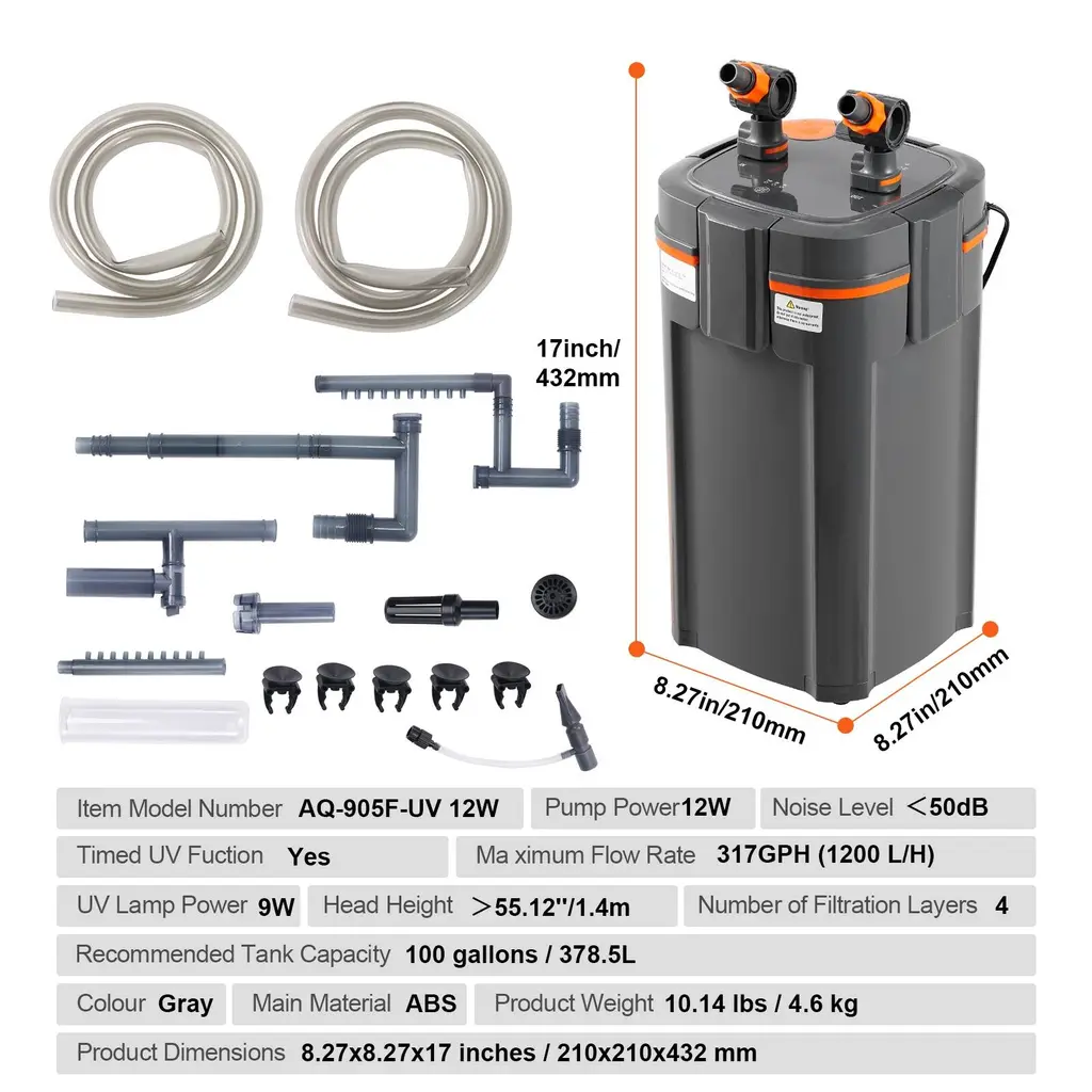 Efficient Filtration: The built-in pump has a maximum flow rate of 225GPH(850 L/H) with a power of 10W, recommended for use in 55-gallon freshwater aquariums, turtle tanks, and fish tanks. / The built-in pump has a maximum flow rate of 172GPH( 650 L/H) with a power of 8W, recommended for use in 30-gallon freshwater aquariums, turtle tanks, and fish tanks. / The built-in pump has a maximum flow rate of 660GPH(2500 L/H) with a power of 25W, recommended for use in 235-gallon freshwater aquariums, turtle tanks, and fish tanks. / The built-in pump has a maximum flow rate of 528GPH(2000 L/H) with a power of 20W, recommended for use in 200-gallon freshwater aquariums, turtle tanks, and fish tanks. / The built-in pump has a maximum flow rate of 396GPH(1500 L/H) with a power of 15W, recommended for use in 120-gallon freshwater aquariums, turtle tanks, and fish tanks. / The built-in pump has a maximum flow rate of 317GPH (1200 L/H) with a power of 12W, recommended for use in 100-gallon freshwater aquariums, turtle tanks, and fish tanks. The water flows through the media layers to filter water and ensure a clean aquatic condition. Each layer has a sponge to hold it in place, and it comes with ceramic rings and bio-balls. Silent Operation: Equipped with pure copper brushless motor, the filter operates extremely quietly. There is no air inside the filter, ensuring low power consumption and high flow rate without any noise. The sound level is less than 50 decibels, so your home life won't be disturbed, while still achieving effective water purification. User-Friendly: The UV lamp has a timer upgrade, allowing for automatic on/off settings at 4/8/24-hour intervals. It also features a flow adjustment valve to regulate water flow from maximum to minimum, and even shut it off completely if desired. The dual quick-release head design makes cleaning and maintenance a breeze, and the inlet has an oil film removal feature to ensure ample oxygen in the fish tank. High Sealing: The quick-release joint design enhances the sealing of the ports, greatly improving the convenience of disassembly and cleaning, and optimizing the leak-proof design. The thickened and tightened silicone ring design reinforces leak prevention. The rotor structure has been optimized to extend its lifespan, with both ends of the rotor becoming an integrated unit. Versatile Application: This aquarium filter is primarily designed to remove remain and waste from fish and turtles in aquariums, keeping the water clear, oxygenated. It is suitable for fish growth and can be used in various settings, including home aquariums, aquarium exhibition tanks, and flower and bird market tanks. It is one of the most essential purchases for aquarium enthusiasts. Friendly Note: Tested flow rates are under no-load conditions and will decrease with filter use and height differences. Package Content 1 x Aquarium Filter 2 x Inlet/Outlet Components 2 x PVC Hoses 47.24''/1.2m 1 x Inlet Hose 1 x Inlet Adjustment Switch 1 x New Oil Film Remover 1 x Oil Film Remover Adjustment Switch 1 x Float Head 1 x Extension Tube 1 x Telescopic Tube 1 x Basket 1 1 x Outlet Hose 1 x Outlet Adjustment Switch 1 x Elbow Tube 1 x Air Flow Regulator 1 x Air Tube 1 x Outlet Nozzle 1 x Basket 2 1 x Plug 5 Suction Cups 2 x Rainfall Pipes 1 x UV Lamp Glass Tube 1 x User Manual 172GPH option Package Content 1 x Aquarium Filter 1 x Inlet/Outlet Components 2 x PVC Hoses 47.24''/1.2m 1 x Inlet Hose 1 x Extension Tube 1 x Basket 1 x Elbow Tube 1 x Outlet Hose 6 x Suction Cups 3 x Rainfall Pipes 2 x Sealing Rings 1 x User Manual