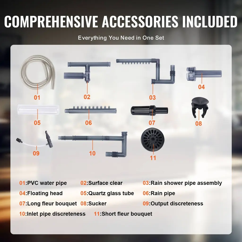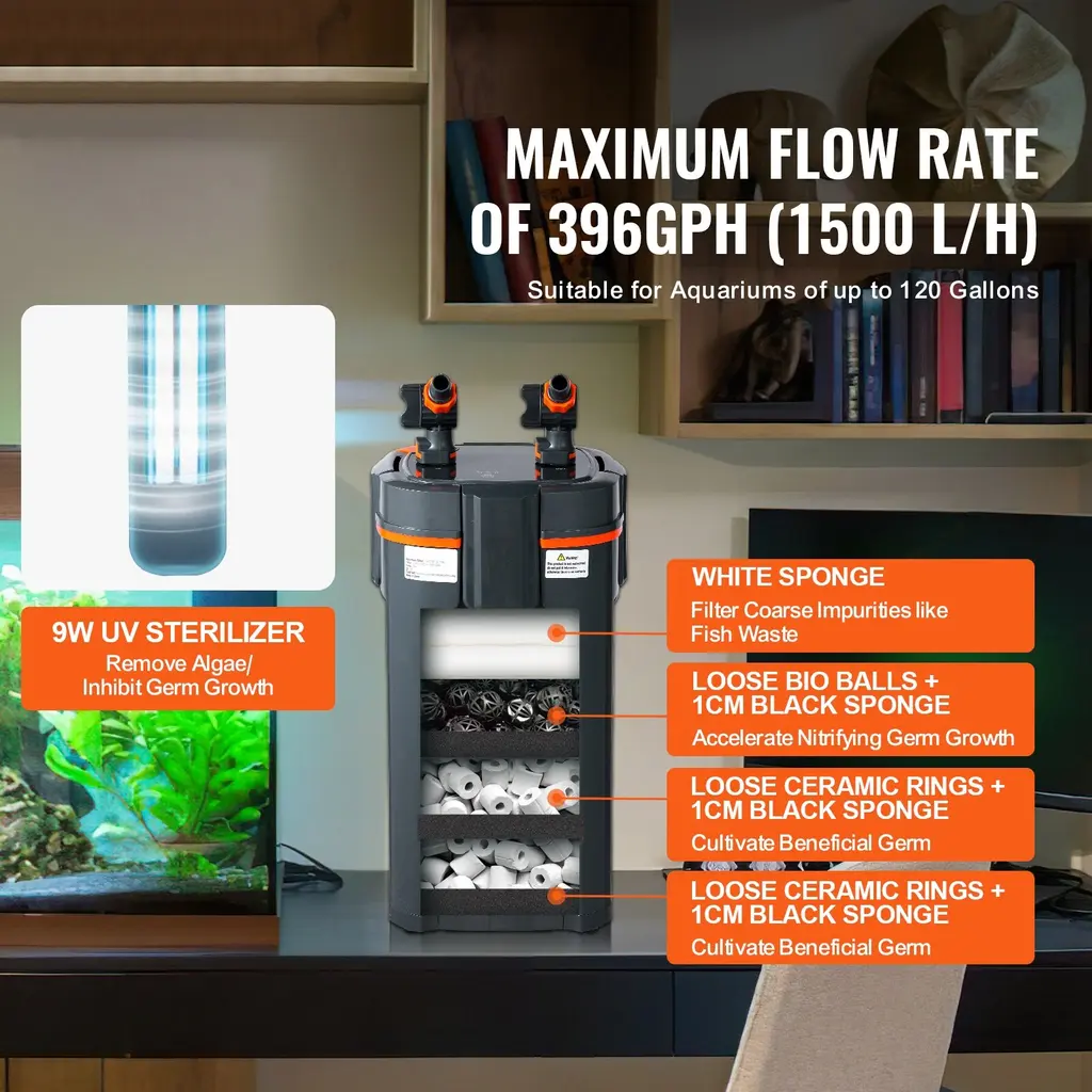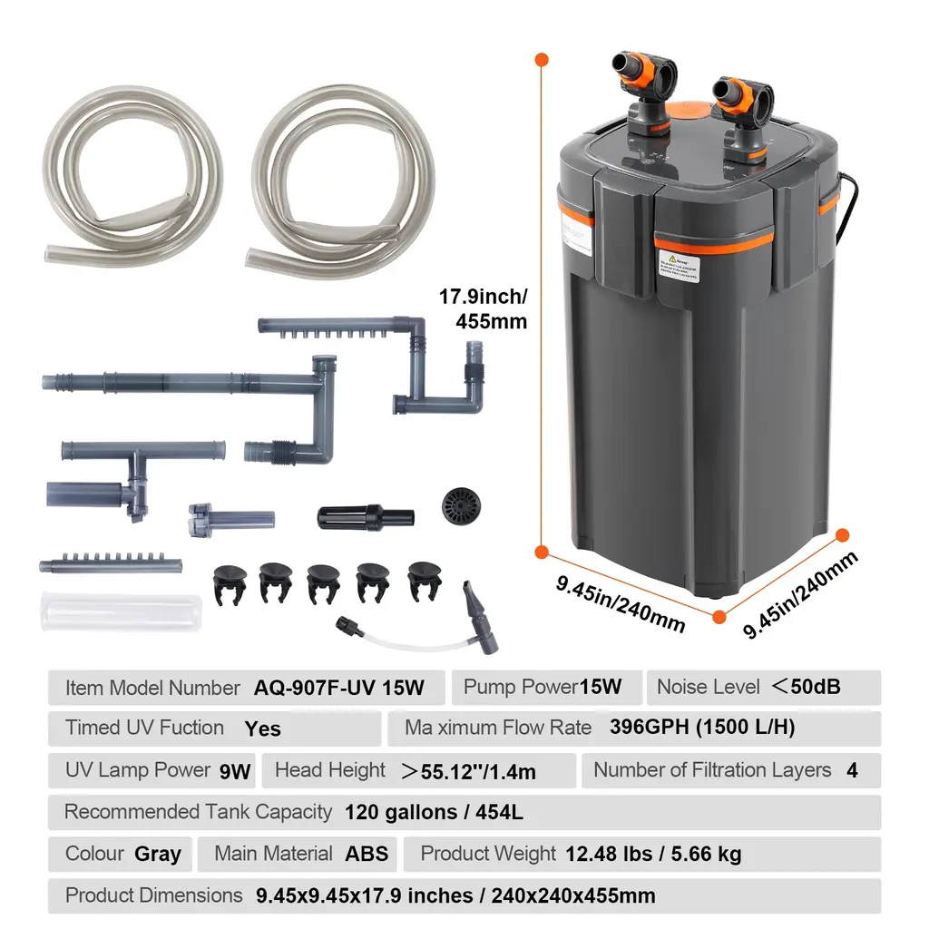 Efficient Filtration: The built-in pump has a maximum flow rate of 225GPH(850 L/H) with a power of 10W, recommended for use in 55-gallon freshwater aquariums, turtle tanks, and fish tanks. / The built-in pump has a maximum flow rate of 172GPH( 650 L/H) with a power of 8W, recommended for use in 30-gallon freshwater aquariums, turtle tanks, and fish tanks. / The built-in pump has a maximum flow rate of 660GPH(2500 L/H) with a power of 25W, recommended for use in 235-gallon freshwater aquariums, turtle tanks, and fish tanks. / The built-in pump has a maximum flow rate of 528GPH(2000 L/H) with a power of 20W, recommended for use in 200-gallon freshwater aquariums, turtle tanks, and fish tanks. / The built-in pump has a maximum flow rate of 396GPH(1500 L/H) with a power of 15W, recommended for use in 120-gallon freshwater aquariums, turtle tanks, and fish tanks. / The built-in pump has a maximum flow rate of 317GPH (1200 L/H) with a power of 12W, recommended for use in 100-gallon freshwater aquariums, turtle tanks, and fish tanks. The water flows through the media layers to filter water and ensure a clean aquatic condition. Each layer has a sponge to hold it in place, and it comes with ceramic rings and bio-balls. Silent Operation: Equipped with pure copper brushless motor, the filter operates extremely quietly. There is no air inside the filter, ensuring low power consumption and high flow rate without any noise. The sound level is less than 50 decibels, so your home life won't be disturbed, while still achieving effective water purification. User-Friendly: The UV lamp has a timer upgrade, allowing for automatic on/off settings at 4/8/24-hour intervals. It also features a flow adjustment valve to regulate water flow from maximum to minimum, and even shut it off completely if desired. The dual quick-release head design makes cleaning and maintenance a breeze, and the inlet has an oil film removal feature to ensure ample oxygen in the fish tank. High Sealing: The quick-release joint design enhances the sealing of the ports, greatly improving the convenience of disassembly and cleaning, and optimizing the leak-proof design. The thickened and tightened silicone ring design reinforces leak prevention. The rotor structure has been optimized to extend its lifespan, with both ends of the rotor becoming an integrated unit. Versatile Application: This aquarium filter is primarily designed to remove remain and waste from fish and turtles in aquariums, keeping the water clear, oxygenated. It is suitable for fish growth and can be used in various settings, including home aquariums, aquarium exhibition tanks, and flower and bird market tanks. It is one of the most essential purchases for aquarium enthusiasts. Friendly Note: Tested flow rates are under no-load conditions and will decrease with filter use and height differences. Package Content 1 x Aquarium Filter 2 x Inlet/Outlet Components 2 x PVC Hoses 47.24''/1.2m 1 x Inlet Hose 1 x Inlet Adjustment Switch 1 x New Oil Film Remover 1 x Oil Film Remover Adjustment Switch 1 x Float Head 1 x Extension Tube 1 x Telescopic Tube 1 x Basket 1 1 x Outlet Hose 1 x Outlet Adjustment Switch 1 x Elbow Tube 1 x Air Flow Regulator 1 x Air Tube 1 x Outlet Nozzle 1 x Basket 2 1 x Plug 5 Suction Cups 2 x Rainfall Pipes 1 x UV Lamp Glass Tube 1 x User Manual 172GPH option Package Content 1 x Aquarium Filter 1 x Inlet/Outlet Components 2 x PVC Hoses 47.24''/1.2m 1 x Inlet Hose 1 x Extension Tube 1 x Basket 1 x Elbow Tube 1 x Outlet Hose 6 x Suction Cups 3 x Rainfall Pipes 2 x Sealing Rings 1 x User Manual