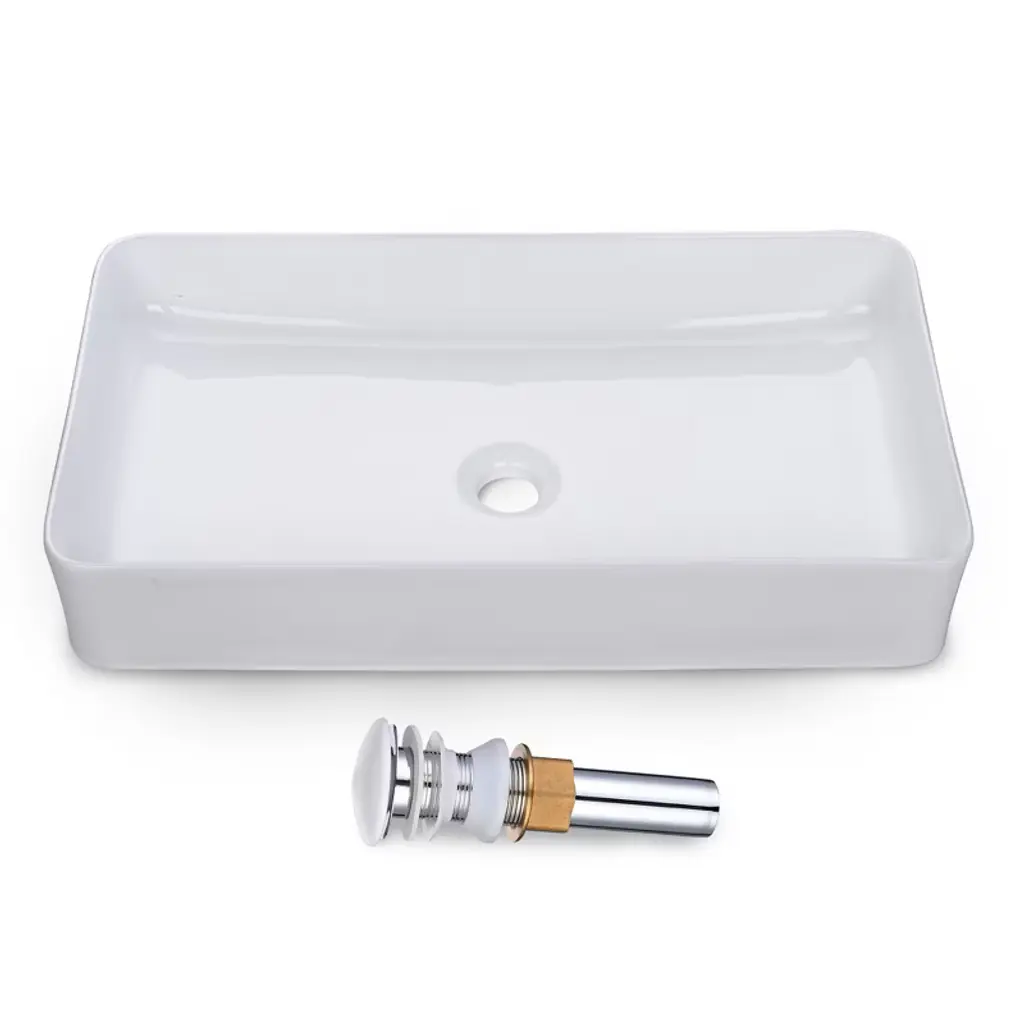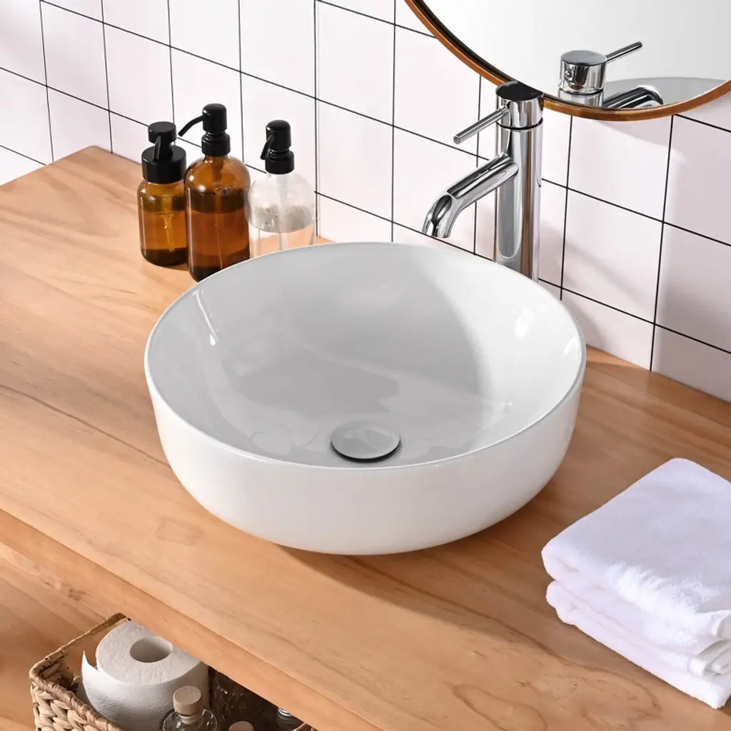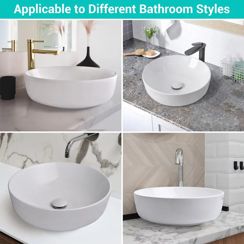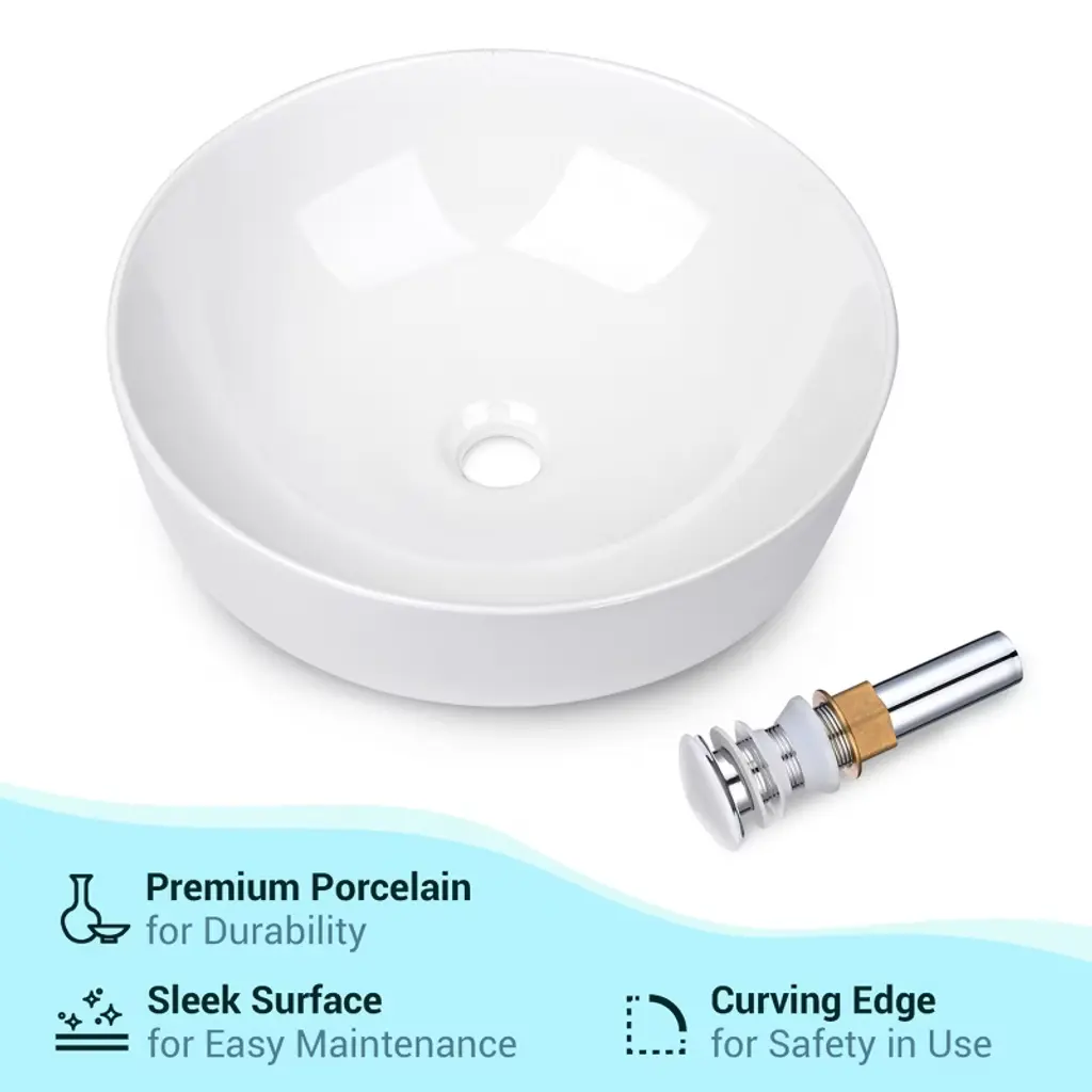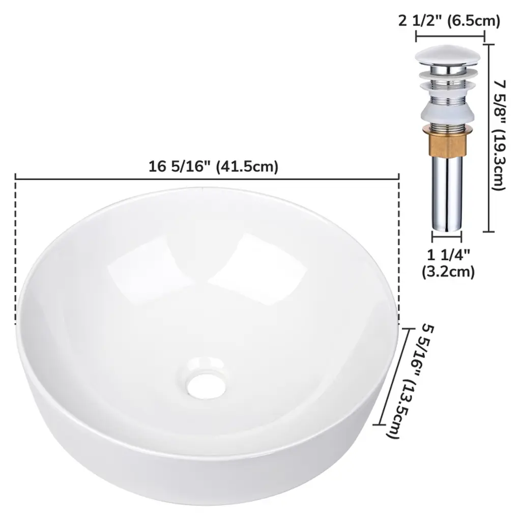 Features:- Simplistic Bathroom Sink - Aquaterior 16" Farmhouse Bathroom Countertop Sink features chic circular design and sleek curves which avoid impact and scratch, perfectly matches with farmhouse faucets & decorations to add simple rustic appeal and suitable for different home & commercial bathroom styles such as farm-house style & modern style- Durable - Made of high-grade ceramics and molded under a high temperature of 1380 degrees Celsius, the porcelain sink with high glossy glazed surface ensures mold resistance, leak proofness and long-lasting beauty, easy to be cleaned and maintained- Pop-up Drain - Features a white porcelain cap for matching well with the sink to create an integrative and simple look; Chrome plated brass drain provides durability and along with a strainer for collecting debris and hair to avoid clogging- Simple Installation - Compatible with American Standard Drainage Hole, just drill a suitable hole on counter for draining without replacing the vanity; Drain with long hex nut allows for manual screwing, offering fast DIY installation within 30 mins to save installation expenses- Brand Service - We provide 5-year warranty & after-sale service for quality assurance, on-line customer service via e-mail and phone is always available, please feel free to keep in touch with us when you have any problemsSpecifications:- Overall Dimension(Dia.xH): 16 5/16" x 5 5/16" (41.5 x 13.5 cm)- Sink Inner Dimension(Dia.xH): 15 9/16" x 4 5/16" (39.5 x 11 cm)- Drain Hole Diameter: 1 3/4" (4.5 cm)- Material: Porcelain, brass- Net Weight: 14 Lbs (6.35 kg)Package Contents:- 1x Porcelain Sink- 1x Pop up Drain- 1x Manual- Package Content:- 1x Porcelain Sink- 1x Pop up Drain- 1x ManualNotice: - Please note that the faucet is not included.