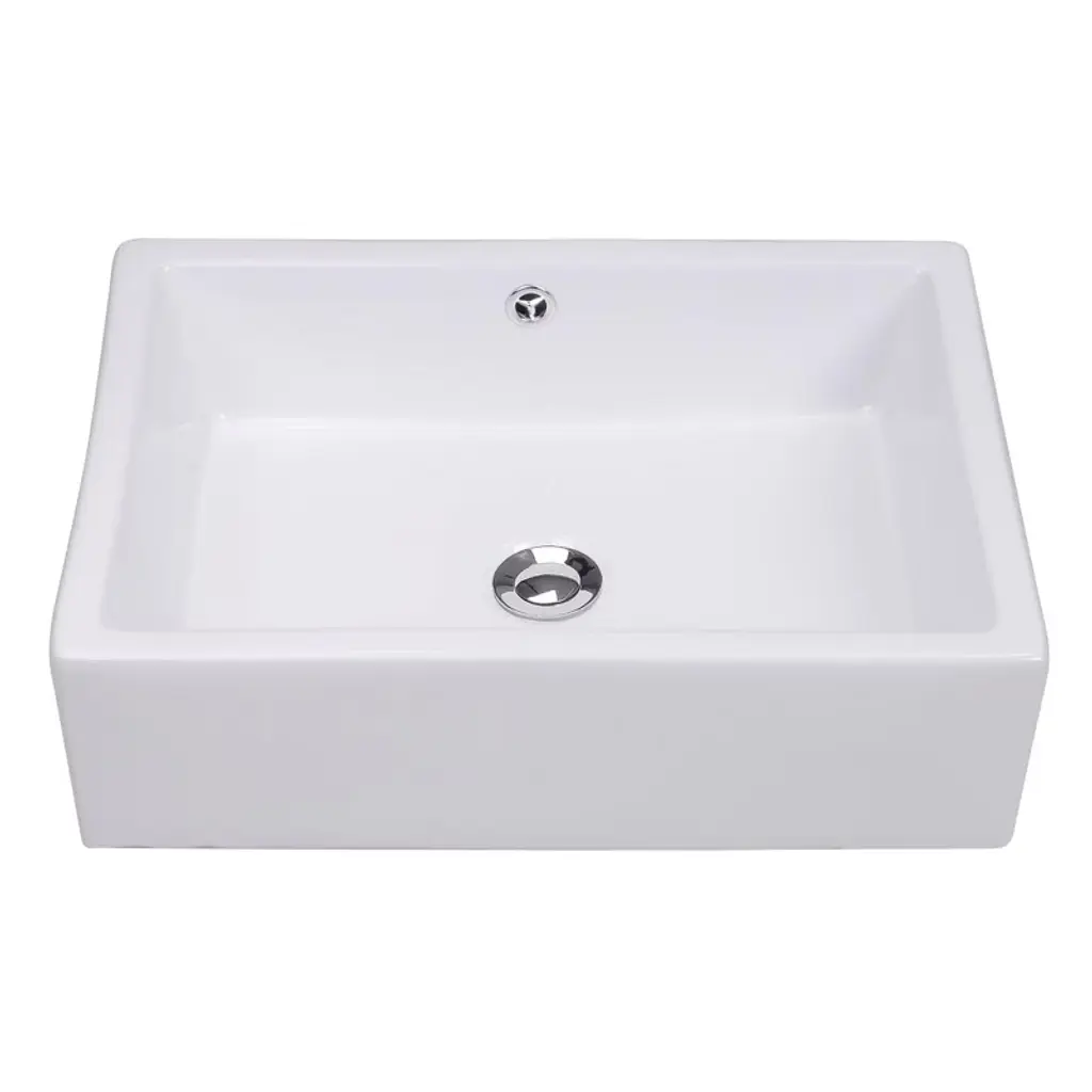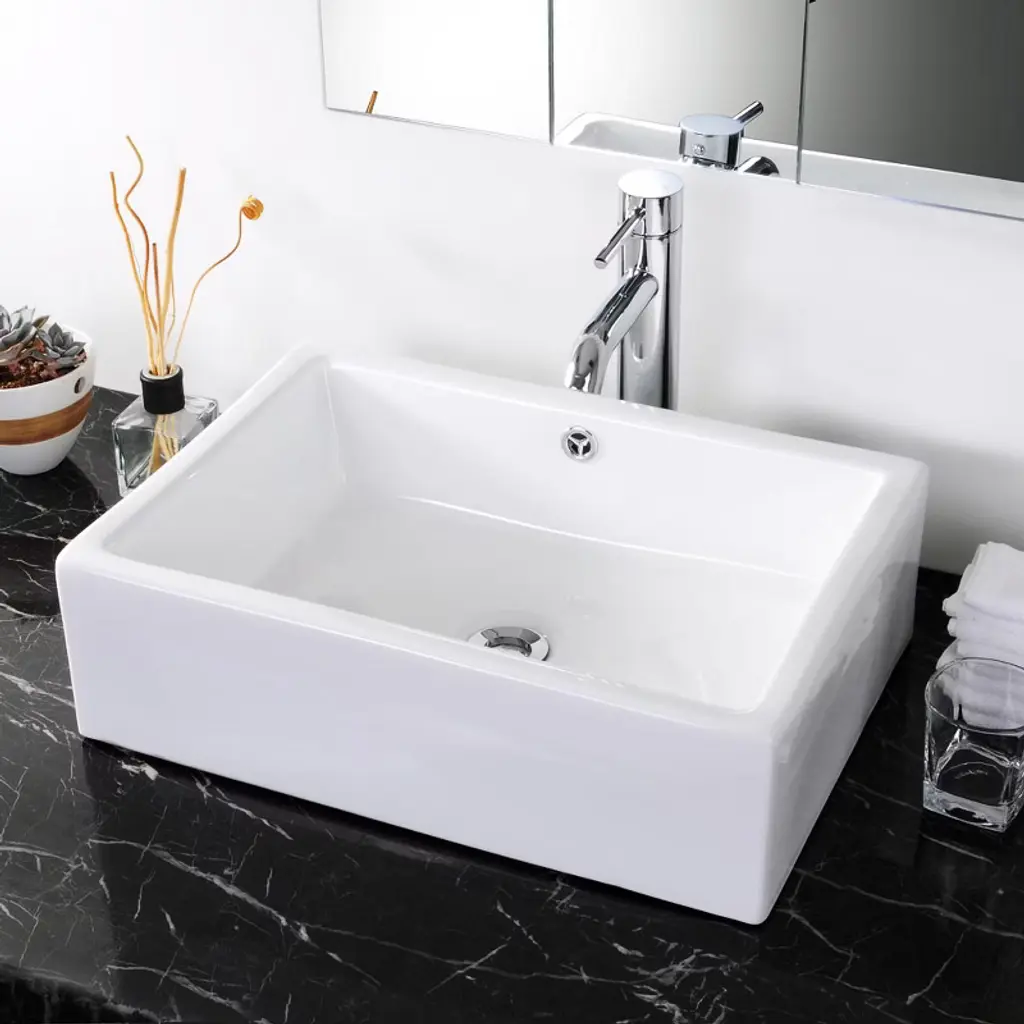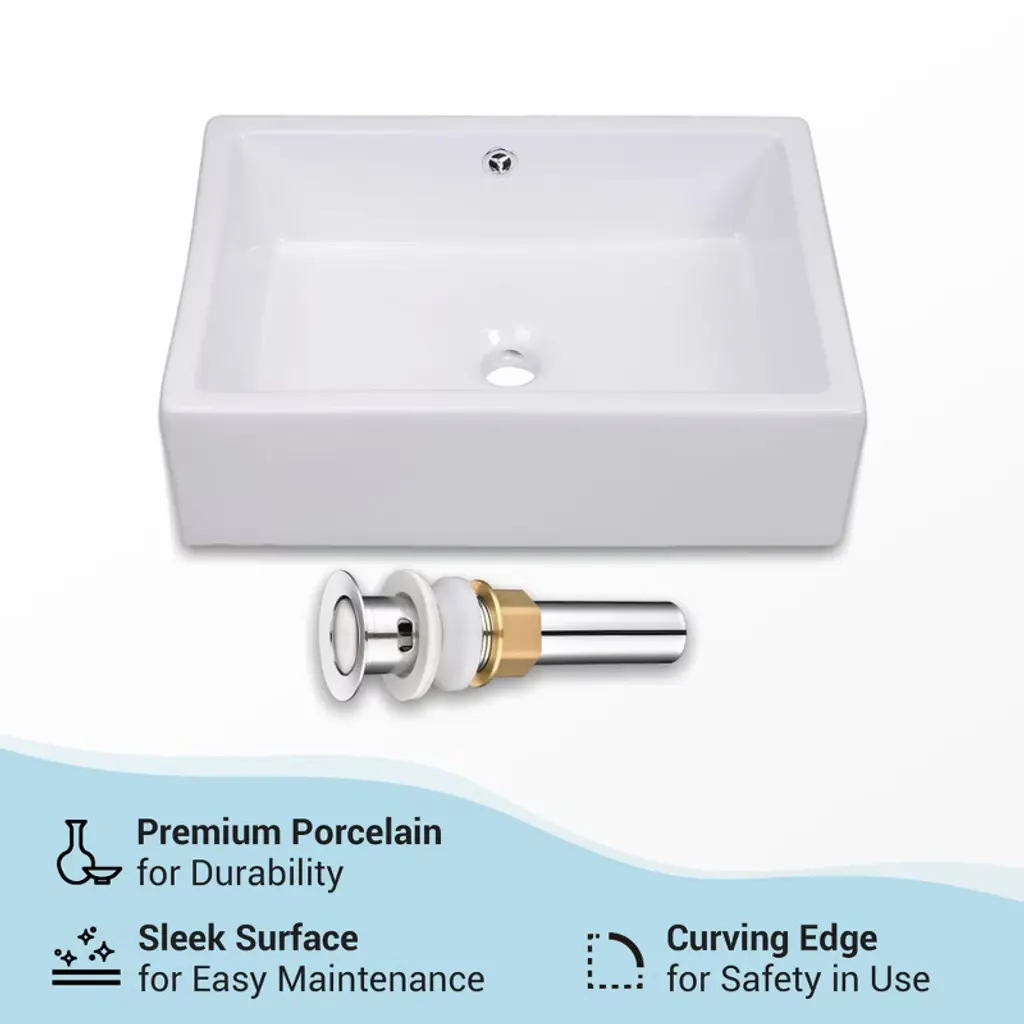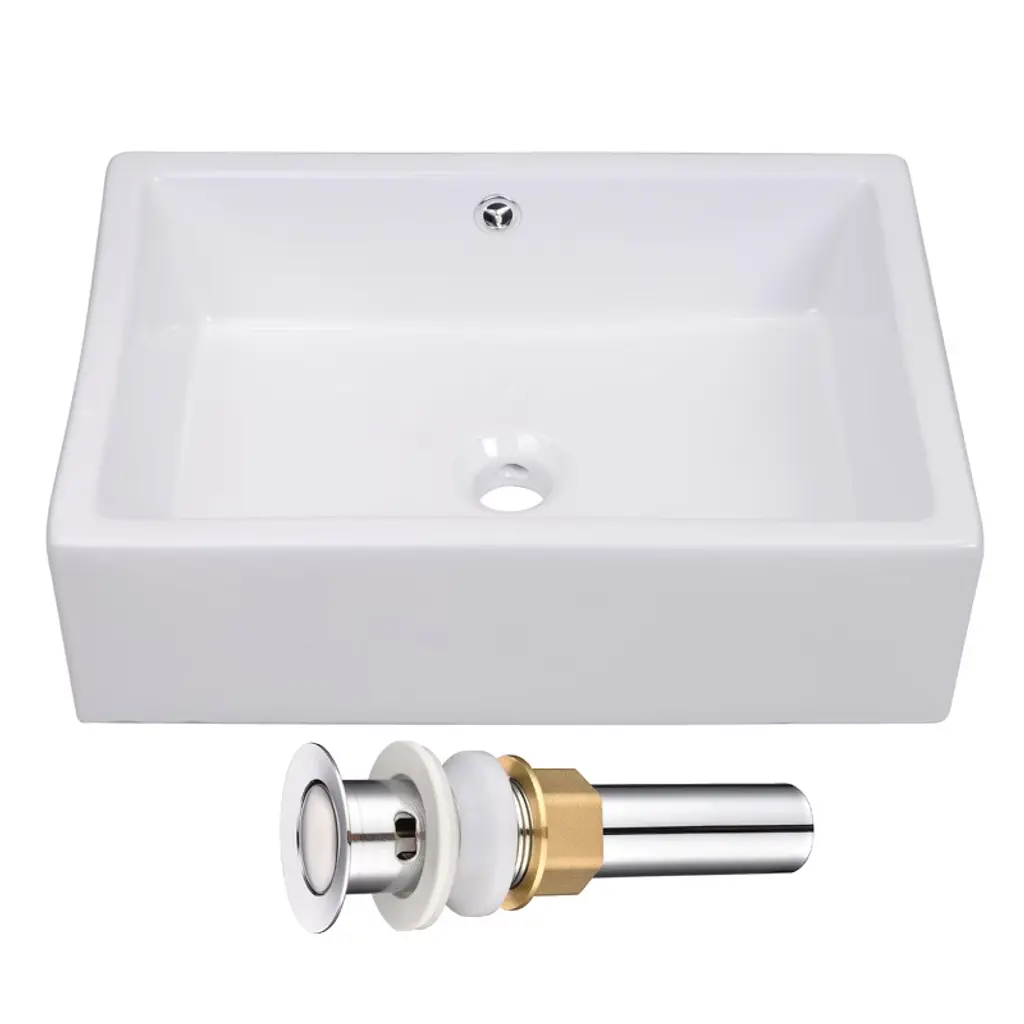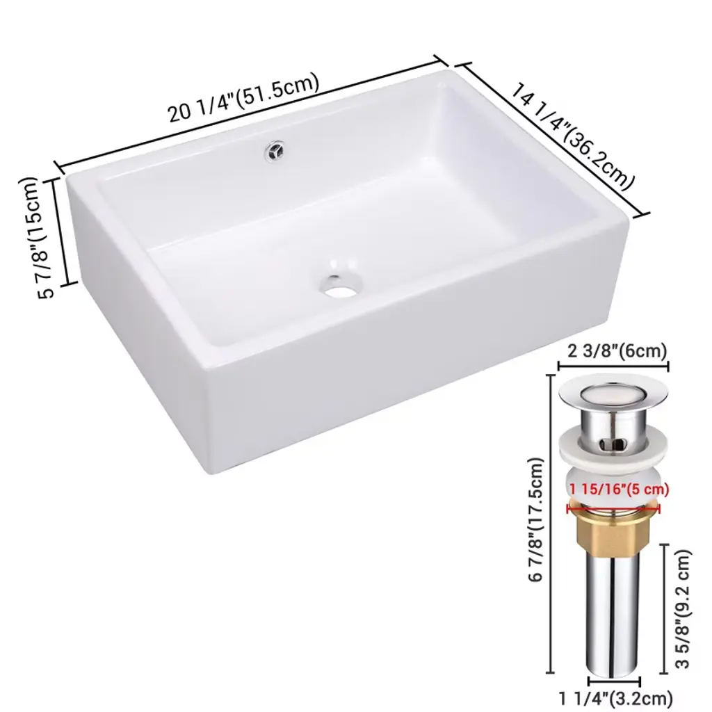 Features:- Modern & Simple Design - This Aquaterior Rectangular Ceramic Above Counter Basin features a contemporary design with clean and smooth contour, making it versatile for most bathrooms; Compatible with both wall-mounted and above-counter faucets, it is perfect for bathrooms, lavatories, washstands, and half-baths- Durable - Constructed of premium quality ceramic for great resistance against rust, corrosion, scratches, and wear-and-tear, ensuring a long service life along with easy cleaning and maintenance; Features a one-hole overflow system enabling efficient drainage and overflow prevention- Pop-up Drain - Comes with a free one-piece chromium alloy drain with a longer hex nut for easy manual screwing, and an upgraded double gasket on the drain to prevent leakage, along with a drain basket to trap debris, hair, and particles, allowing for easy cleaning and preventing blockage with frequent usage- DIY Installation - Easy to install by simply drilling a suitable draining hole on the counter top and you will be able to install it easily and quickly without removing the vanity or using external manpower- Quality Assurance - Comes with 30-day return policy and 1-year warranty as a safety and quality assurance, providing peace of mind with long-term usageSpecifications:- Overall Dimension(LxWxH): 20 1/4" x 14 1/4" x 5 7/8" (51.5 x 36.2 x 15 cm)- Inner Dimension(LxWxH): 17 15/16" x 12 3/16" x 4 1/2" (45.5 x 31 x 11.5 cm) - Drain Cap Dia.: 2 3/8" (6 cm)- Drain Height (when Closed): 6 7/8" (17.5 cm)- Tailpiece Outer Dia.: 1 1/4" (3.2 cm) - Installation Types: Above Counter- Material: Ceramic- Net Weight: 27.5 Lbs (12.5 kg)Package Contents:- 1x Ceramic Sink- 1x Drain- 2x Rubber Rings- 1x Nut- 1x Rubber Cover- 1x Overflow Ring- 1x ManualNotice: - Please note that the faucet is not included.