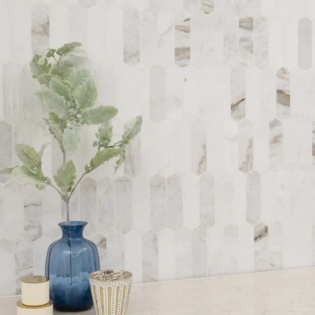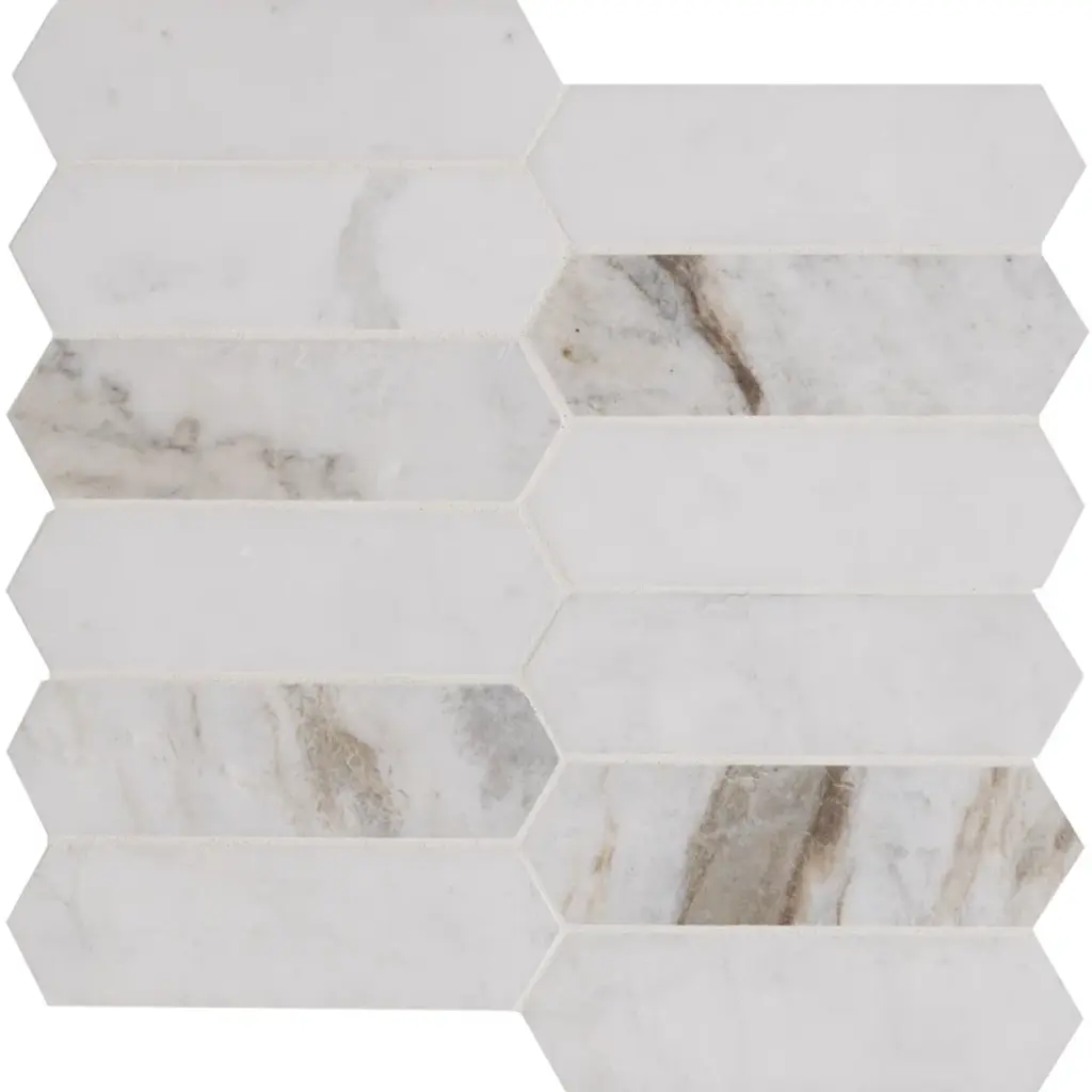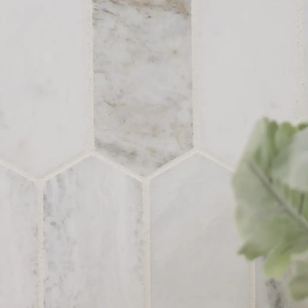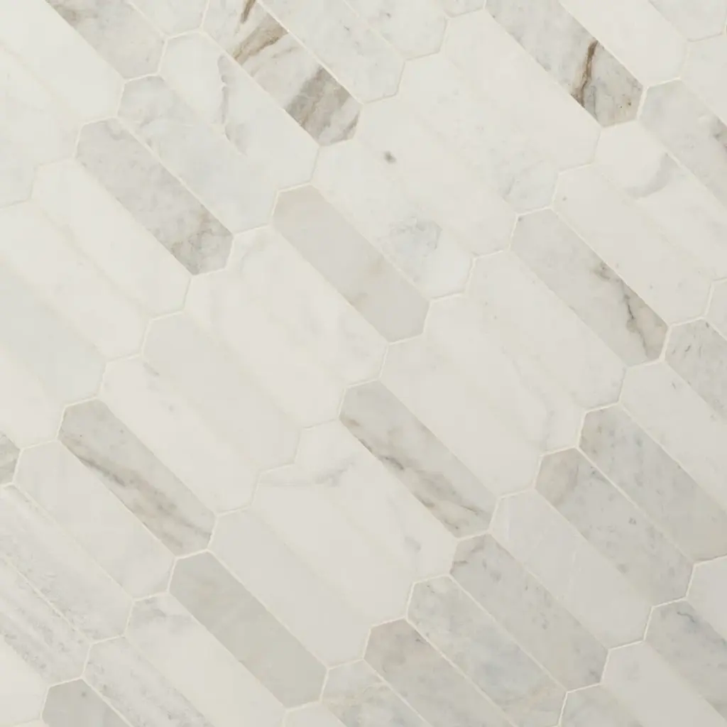 Arabescato Venato white picket tiles feature natural marble in warm white, creamy taupe, and dusky grey hues. The eye-catching picket shape offers a modern twist on the classic hexagon tile for a unique aesthetic. The tiles’ honed finish enhances the beauty of the marble. Durable and easy to care for, these mosaic tiles are perfect for use as an accent wall or backsplash tile, countertop surface, or even as flooring tile in residential applications.