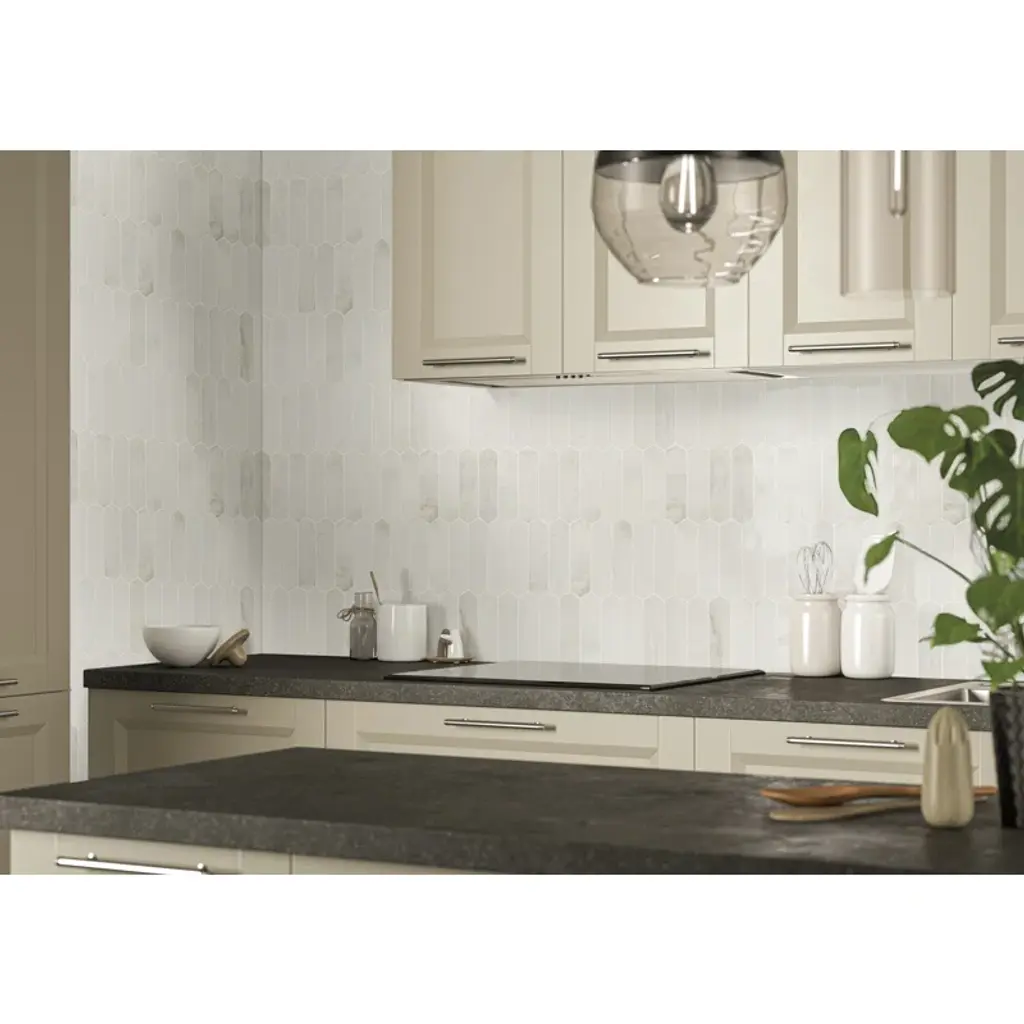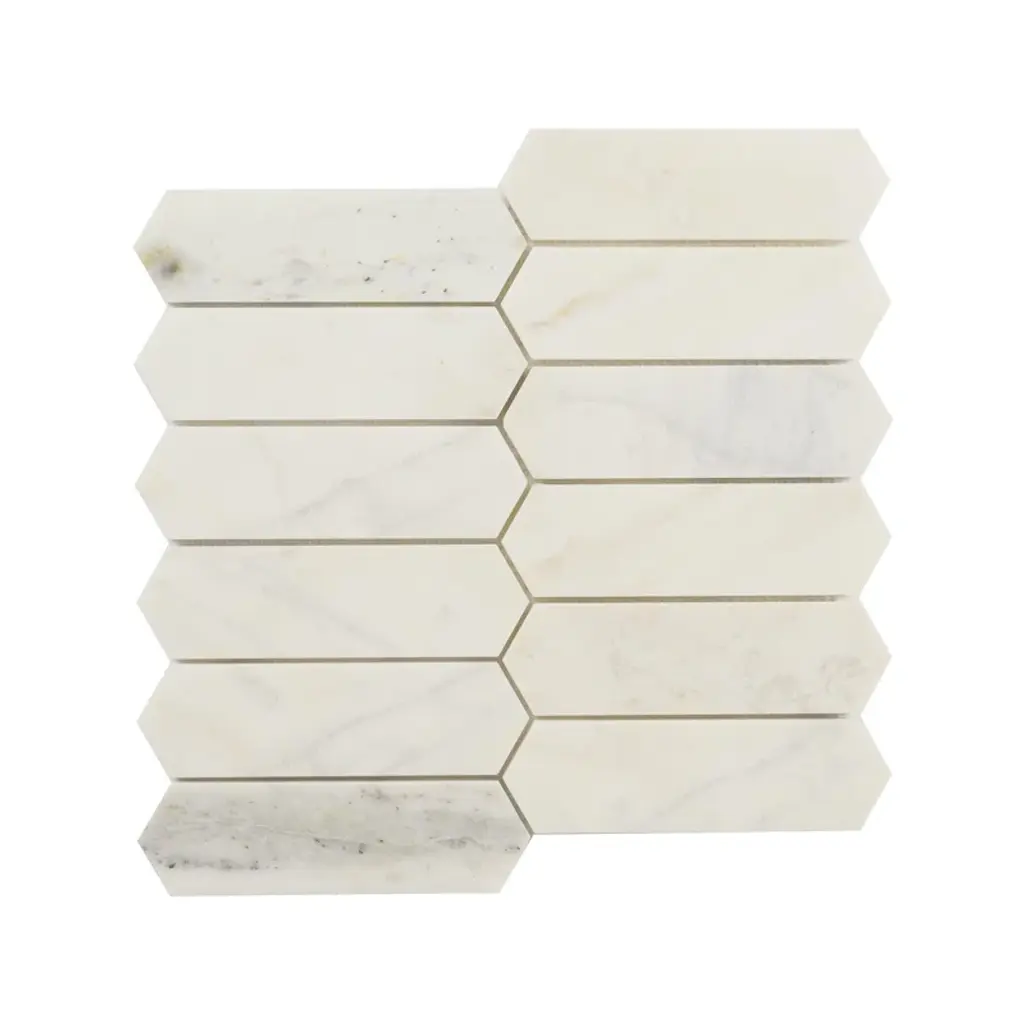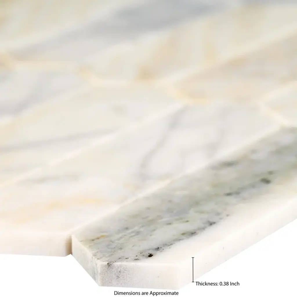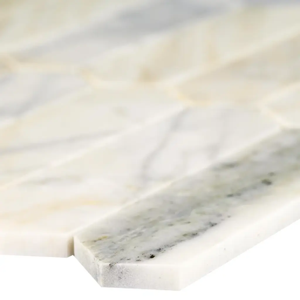 Arabescato Venato white picket tiles feature natural marble in warm white, creamy taupe, and dusky grey hues. The eye-catching picket shape offers a modern twist on the classic hexagon tile for a unique aesthetic. The tiles’ honed finish enhances the beauty of the marble. Durable and easy to care for, these mosaic tiles are perfect for use as an accent wall or backsplash tile, countertop surface, or even as flooring tile in residential applications.