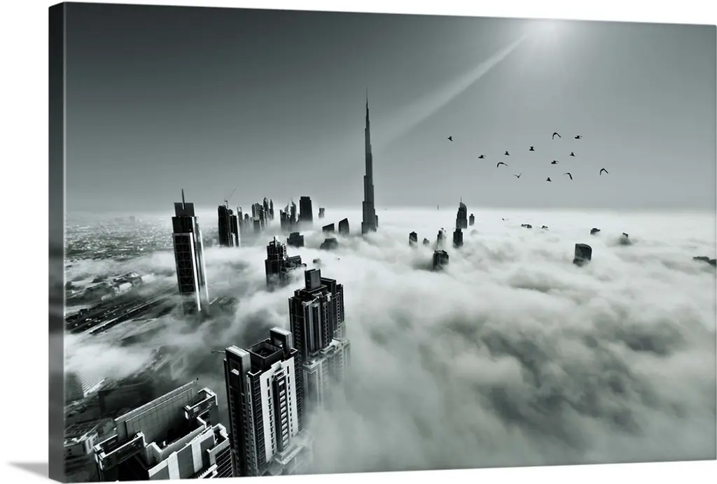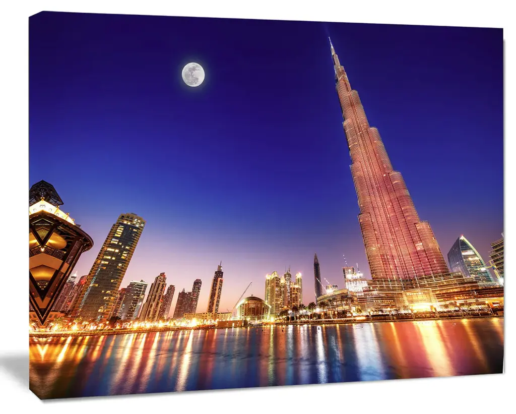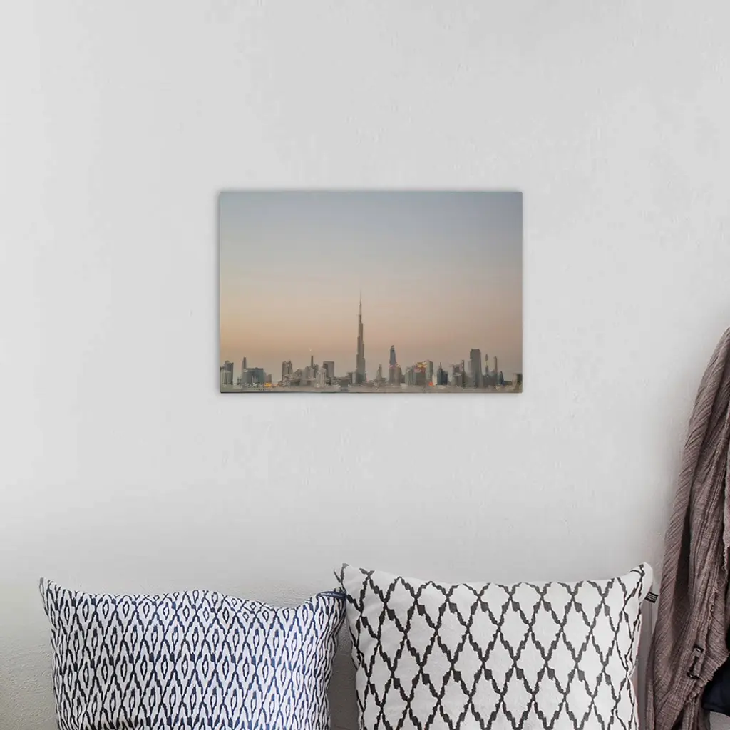 Photograph of a blurred Dubai skyline created with multiple exposures, at dusk.