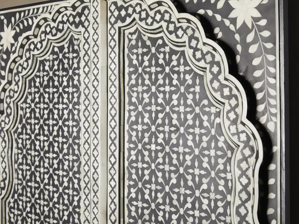 In collaboration with expert Indian artisans, our Arvali Inlay Door is inspired by traditional designs and authentic artistry passed down from generation to generation. Each handcrafted piece features a mosaic of bone inlay—each having been handpicked and hand-shaped before being carefully placed, one at a time, and sealed with resin. As our artisans are non-violent and strict vegetarians, our bone is humanely sourced from naturally deceased water buffalo that roam the streets and countryside of India.