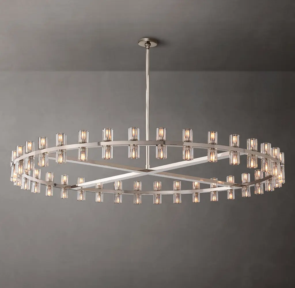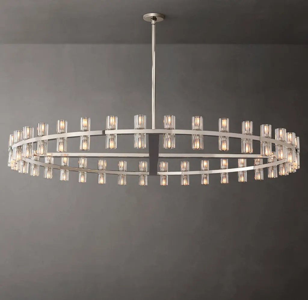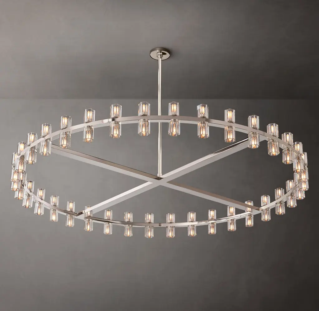 Jonathan Browning's rhythmic design for the Arcachon collection is inspired by the shape and scale of industrial gears, where spokes intersperse with negative space in order to interlock with other gears. Here, the spokes are hexagonal forms juxtaposed with rounded interiors, beautifully crafted of crystal glass, running along a simple, solid metal frame. SHOP THE ENTIRE COLLECTION