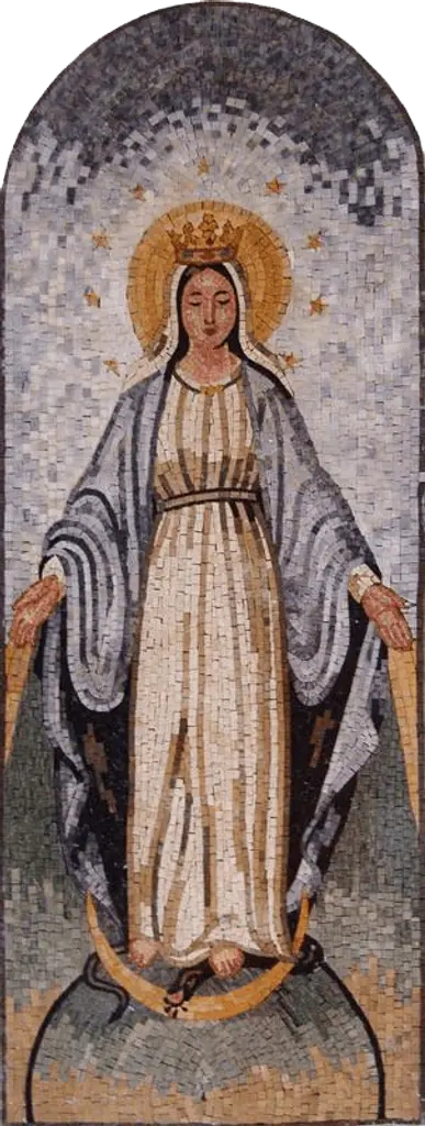 Introducing the Arched Mural Mosaic Virgin Mary, a stunning piece of art that beautifully combines craftsmanship and spirituality. This exquisite handmade mosaic features the revered image of Mary Queen of Peace, gracefully designed in an elegant arched form. Each piece of this captivating mosaic is meticulously crafted from all-natural marble, ensuring durability and a timeless appeal that will enhance any space.The Arched Mural Mosaic Virgin Mary is perfect for those looking to add a touch of sacred beauty to their home. Whether displayed in your living room as a focal point or adorning the entrance corridors, this masterpiece serves as a constant reminder of peace and grace. The rich textures and colors of the natural marble create a visually striking effect that draws the eye and invites contemplation.Ideal for both religious settings and personal sanctuaries, this mosaic not only symbolizes faith but also showcases exceptional artistry. Its arched design allows it to fit seamlessly into various interior styles, making it a versatile addition to your decor. Each mosaic is unique, with its own natural variations, making your piece truly one-of-a-kind.Elevate your home's ambiance and express your devotion with the Arched Mural Mosaic Virgin Mary. This artistic representation of the Virgin Mary brings warmth and spiritual significance to any room, making it an ideal gift for loved ones or a cherished item for your own collection. Embrace the serene presence of Mary Queen of Peace in your everyday life and let this beautiful mosaic inspire peace and tranquility within your home.