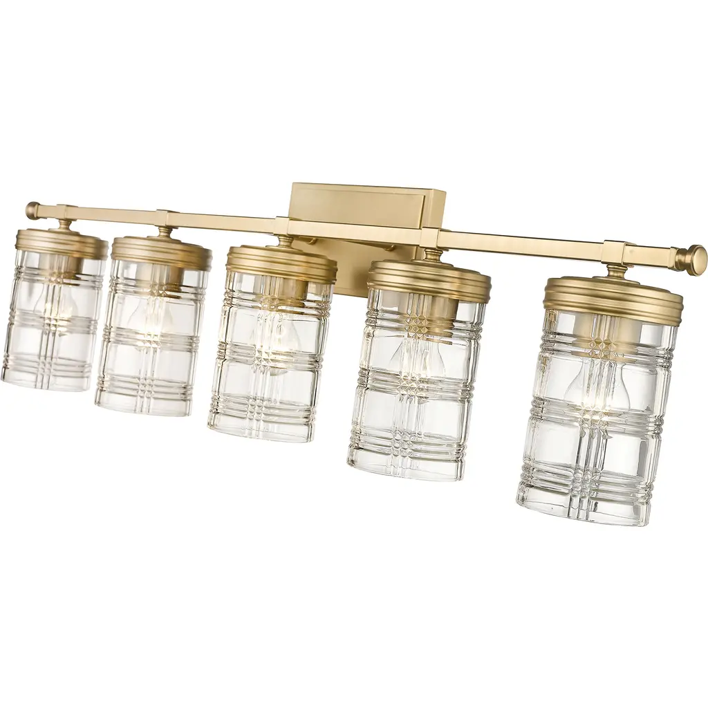 Transform a traditional master bathroom into a classical interior space with this elegant transitional five-light vanity wall sconce. Five cut crystal-inspired cylinder glass shades offer up all the illumination you need with their old-world restoration-inspired design and timeless Glen plaid pattern lanterns. The steel plate and capped ends offer up a lustrous and warm heirloom gold finish, pushing a luxe metallic touch designed to tie together existing hardware and fixtures that give a metropolitan glam feel to a spacious bathroom interior.