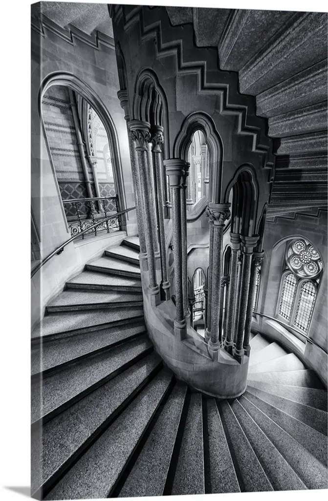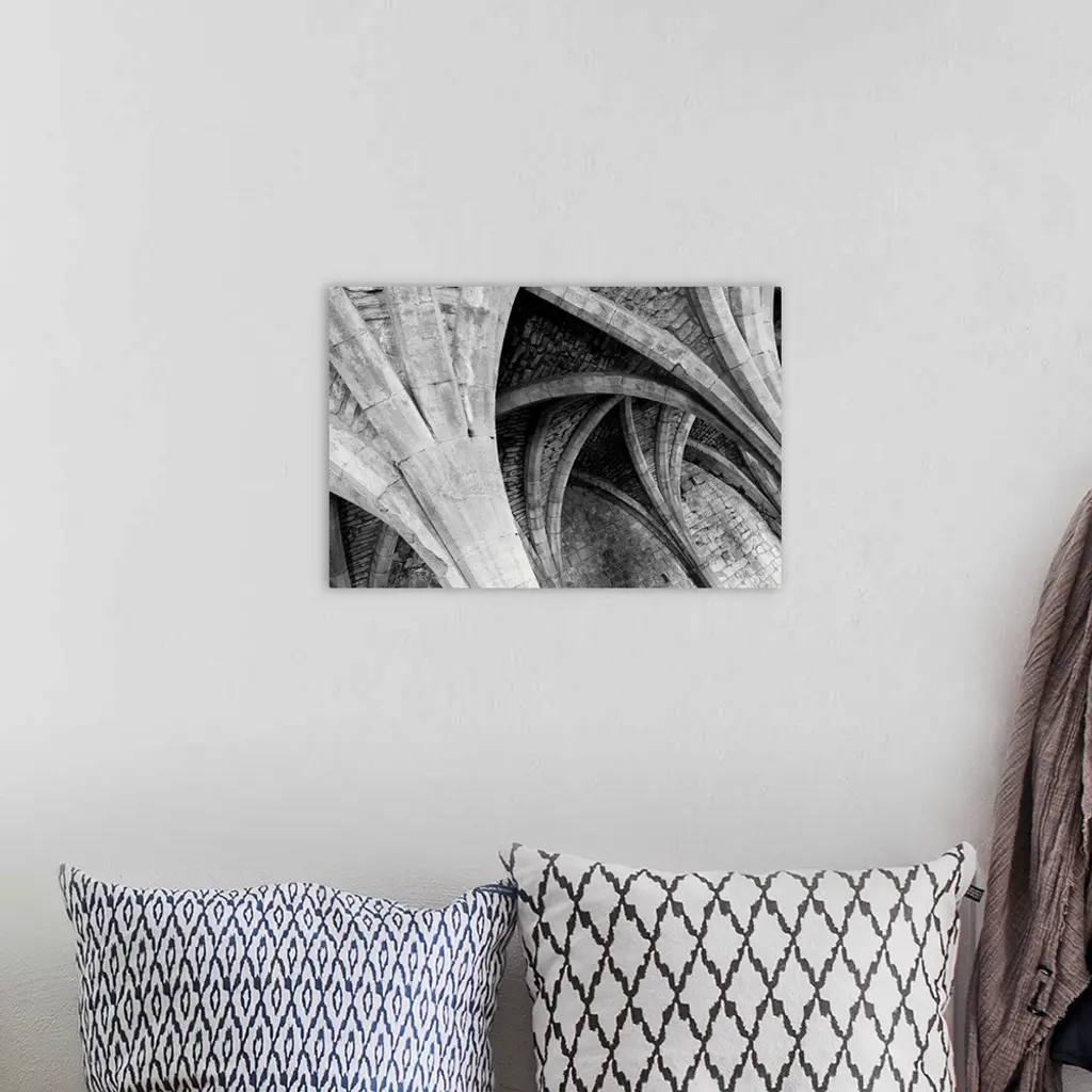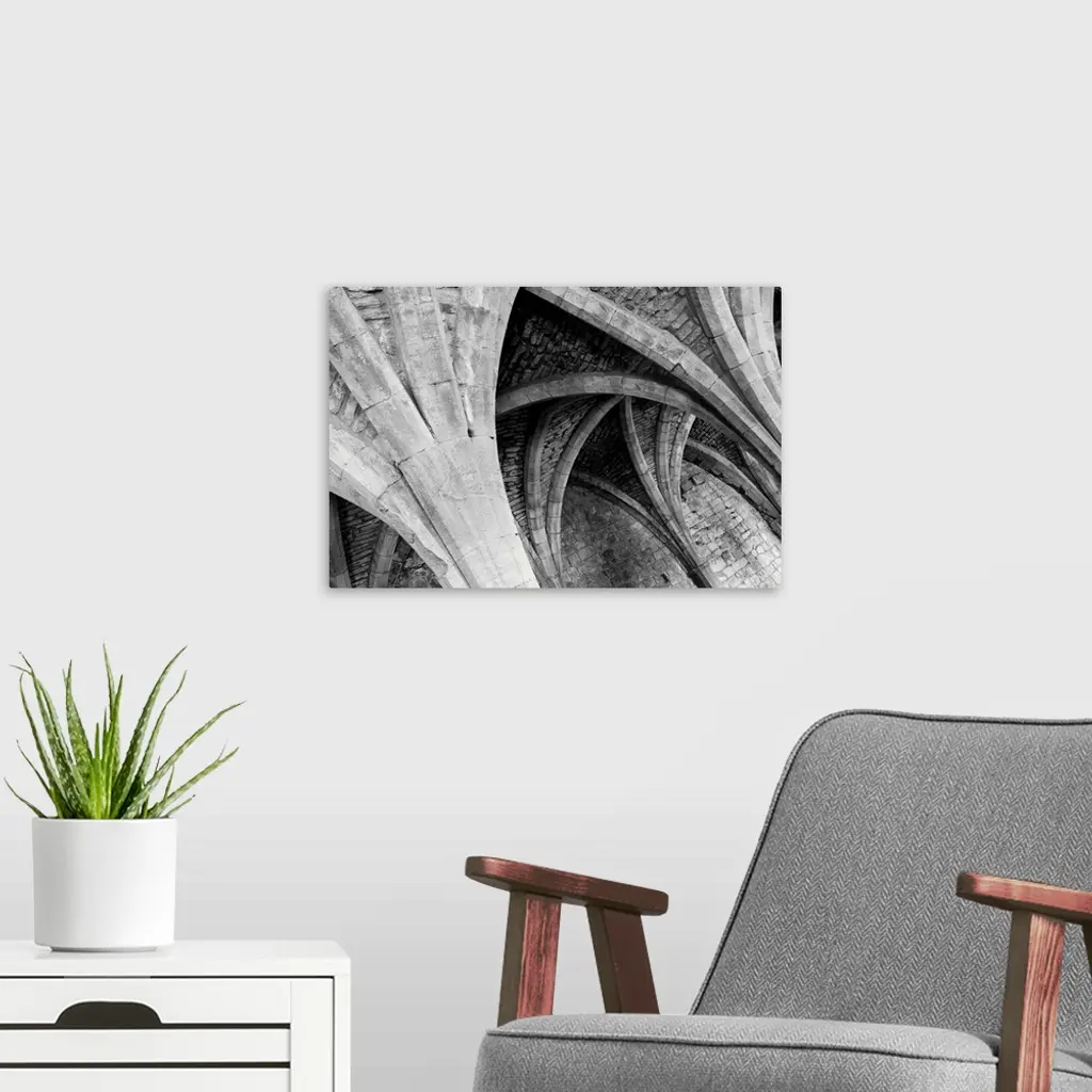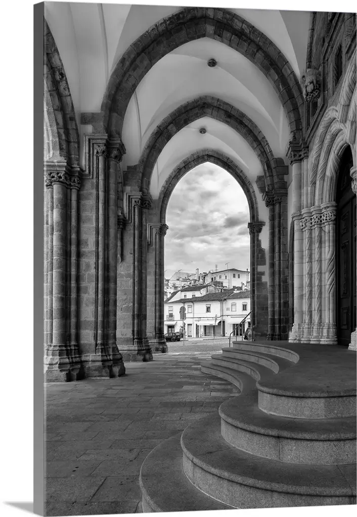 A receeding passage through gothic arches in monochrome black and white.