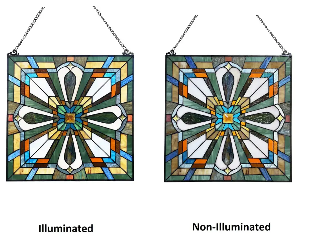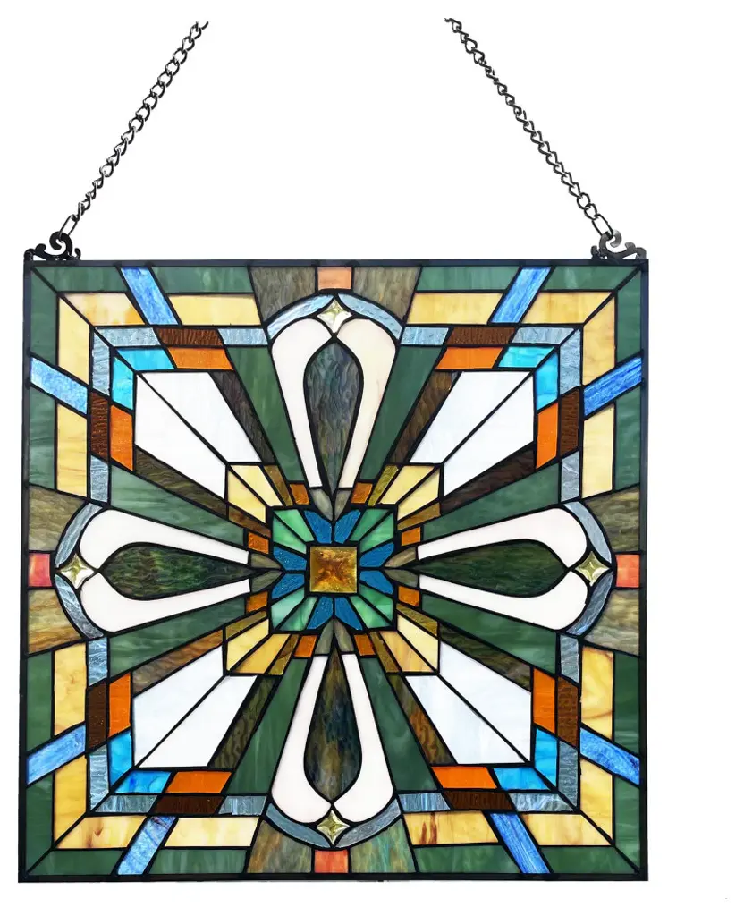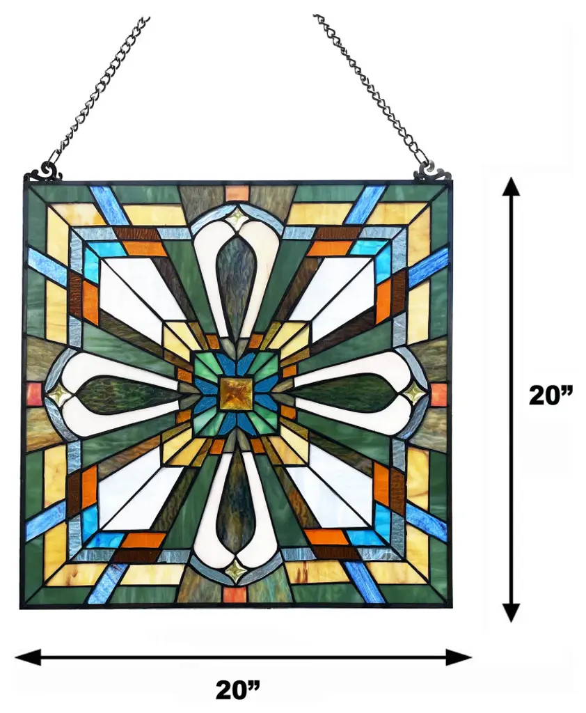 Archie is a beautifully designed mission style window panel using tiffany stained glass. This piece is made up of 190 pieces of hand cut, stained art glass and 5 glass beads, expertly pieced and soldered together to create each panel. Each of CHLOE''s Tiffany-style stained glass panels are formed using the very same technique developed by Louis Comfort Tiffany in the early 1900''s, using hand cut stained art glass, each wrapped in fine copper foil and soldered together at extremely high temperatures to form each unique panels. Exact size to the nearest inch may vary, and exact color of each glass piece may vary due to each piece being hand crafted. First image is with the light shining through, second image is with no light.