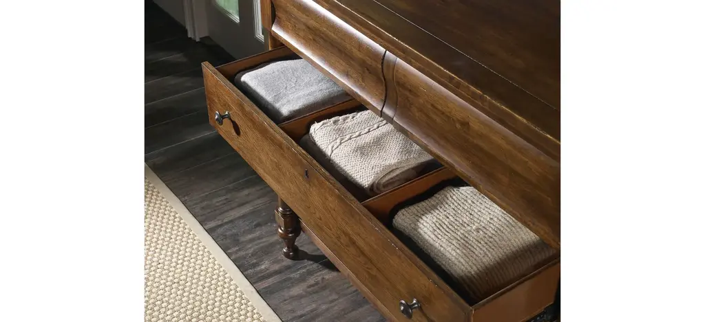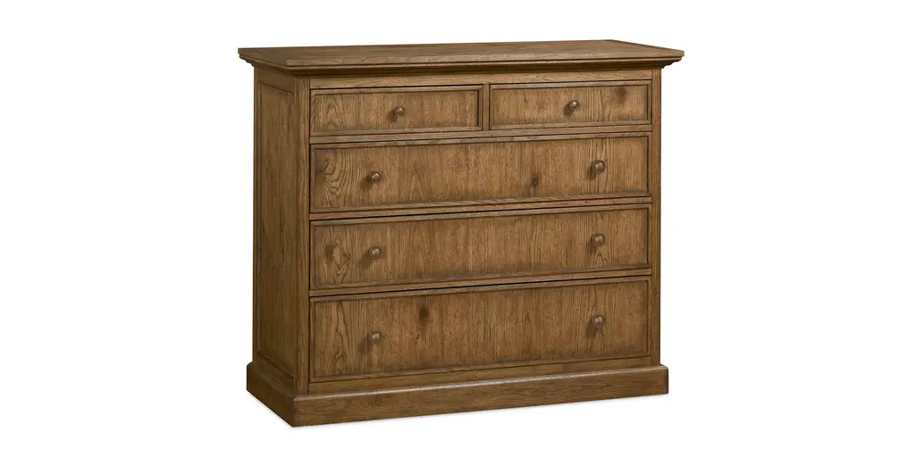 Make your bedroom a cozy retreat for movies at midnight with the TV and media-ready Archivist Bureau featuring a drop-down drawer to accommodate wire management and component storage. Inspired by epic European and American style elements, the bureau is comfortable and inviting with a world-traveled pedigree. Five drawers with the top left drawer offering a ventilated back and a front that flips back for component usage. The top right drawer is felt lined with a jewelry tray, and the bottom 3 drawers have 2 removable dividers. The bottom drawer is cedar lined. Featured in a soft casual finish over Pecky Pecan Veneers for a rustic, authentic look.