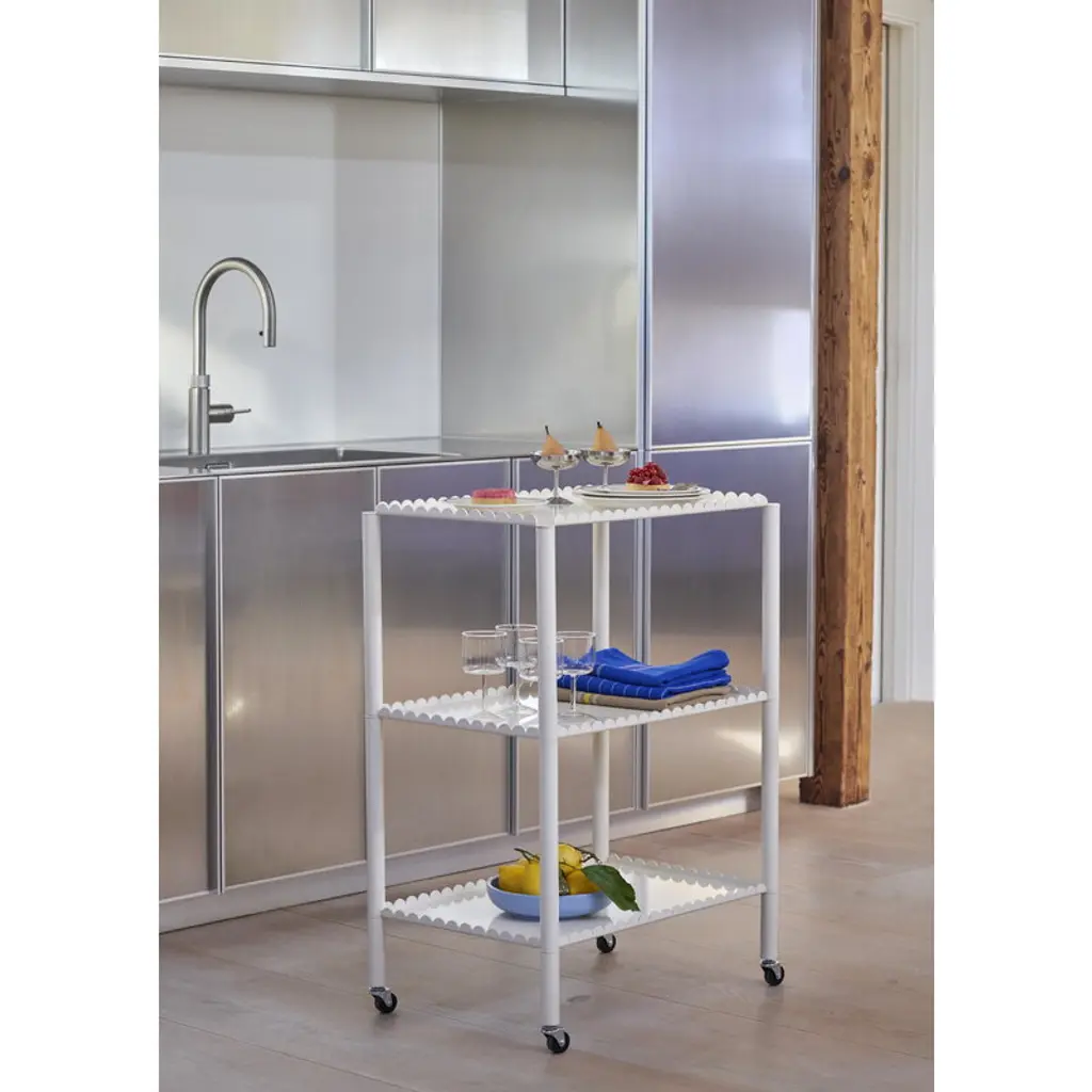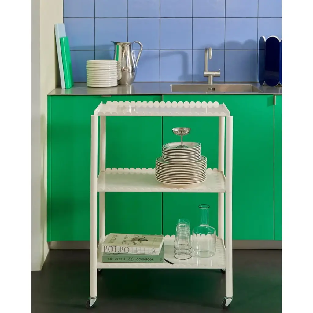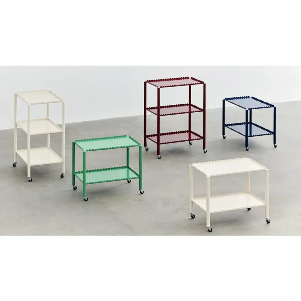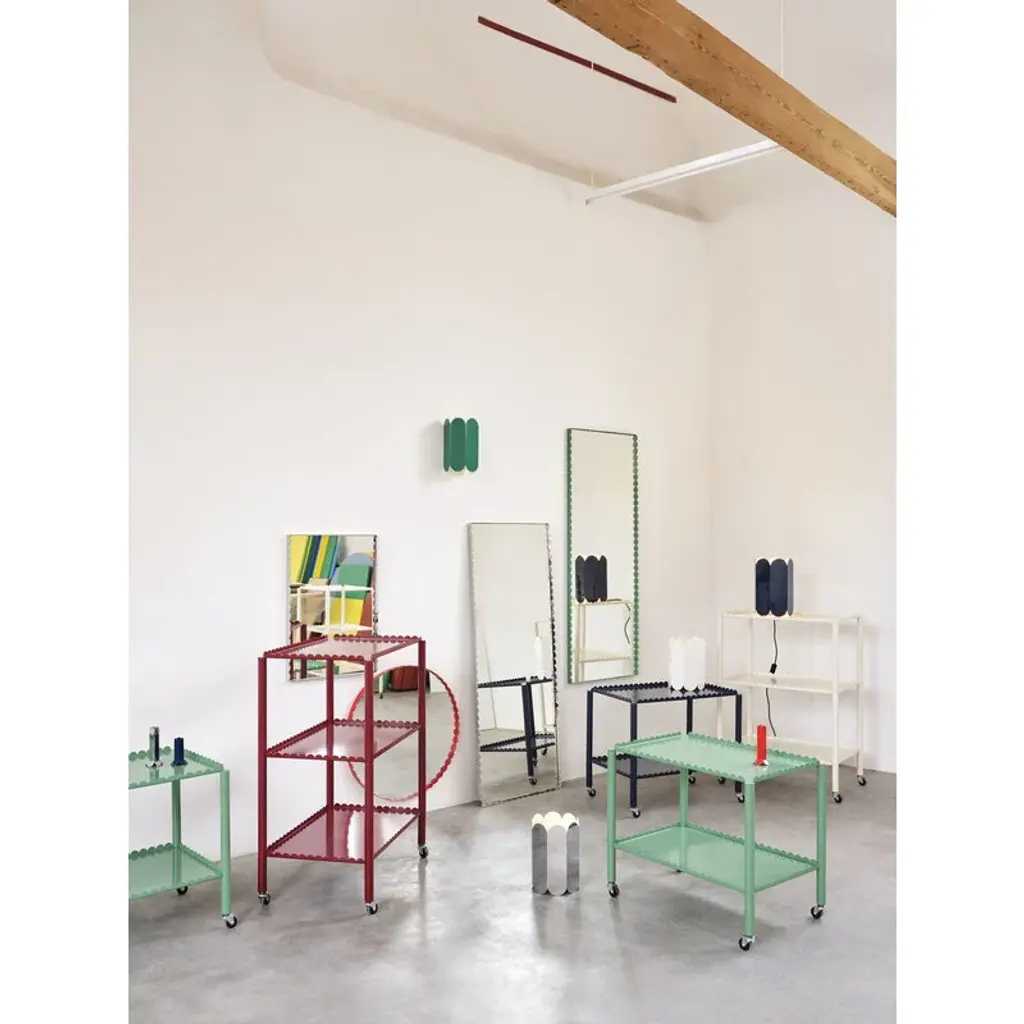 The Arcs trolley is decorated with scalloped frames around each of its three tiers. Mounted on castors, the trolley can be used as a storage solution, display shelf or as a contemporary drinks trolley. Designed by Muller Van Severen, the Arcs series is based on simple oval shapes: when joined together, the pieces create captivating silhouettes where soft and straight lines meet. The objects in the collection are available in a variety of finishes, so you can create a vibrant but coherent whole by mixing different shades and finishes together.