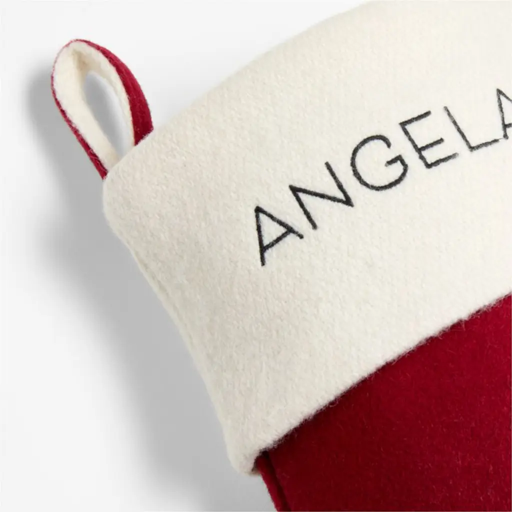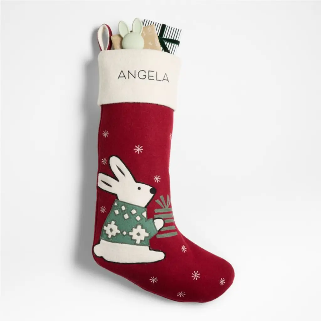 A sweet arctic bunny poses amidst a flurry of snowflakes on our cranberry-red stocking, clutching a carefully wrapped present to bring to the party. We love the way the green Fair Isle sweater and striped gift add festive details to the adorably modern and minimalist illustration by Joan Anderson. Finished with a snow-white cuff perfect for personalizing, the wool-blend Christmas stocking coordinates with the rest of our Arctic Friend holiday collection.For 32 years, our exclusive whimsical designs by artist Joan Anderson have been collectible favorites that sell out fast.
