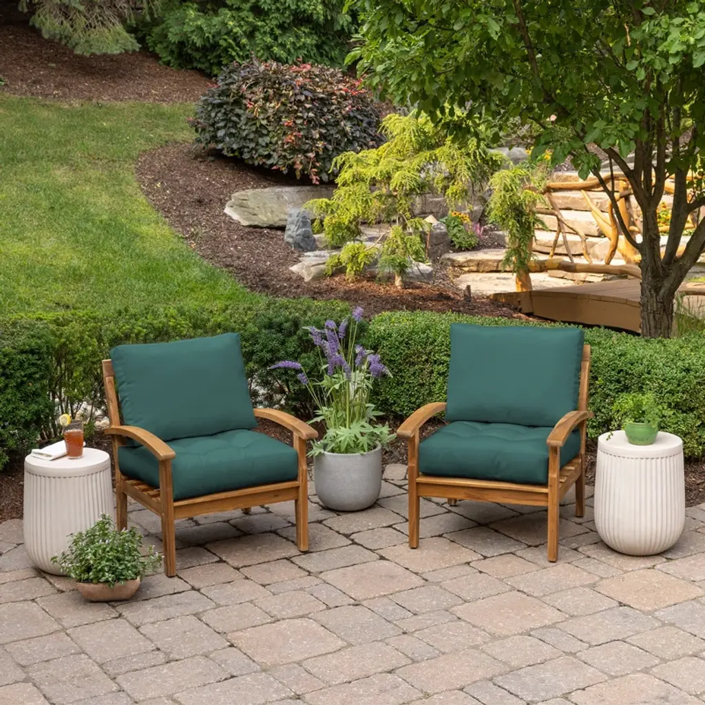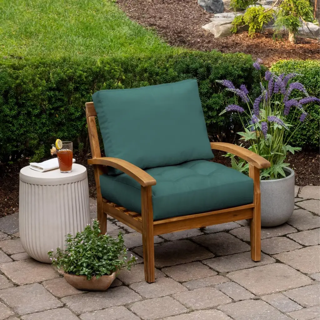 The ARDEN Plush Blowfill Deep Seat Set is made with soft polyfiber fill and long-lasting outdoor polyester fabric with PFAS-Free C0 treatment. Creating an ultra-comfortable outdoor deep seat cushion that is also eco-friendly and skin safe for your family. This outdoor conversation cushion has one pillow that measures 24in W x 18 in L x 7 in T and one seat that measures 24 in W x 24 in H x 5.5 in T. The 100% printed polyester outdoor fabric resists fading, so your patio cushion looks vibrant for longer. Skin-safe C0 water protection helps your dining cushion withstand continued outdoor use, while easy cleaning with just soap and water for low-maintenance upkeep. Two sets of ties on the seat bottom make sure your outdoor deep seat cushion stays firmly in place. This set includes a banded pillow back and a seat with 4 tufts to add a decorative touch. Inside this outdoor deep seat cushion set is 100% polyfiber blowfill to help it retain shape and provide long-lasting comfort during outdoor use. Made from 100% recycled plastic bottles, the polyfiber fill provides an environmentally friendly and durable option for your backyard patio. Although this deep seat cushion set is both water and UV-resistant, we recommend bringing it indoors when it rains or when not in use to preserve its lifespan and keep it looking beautiful.