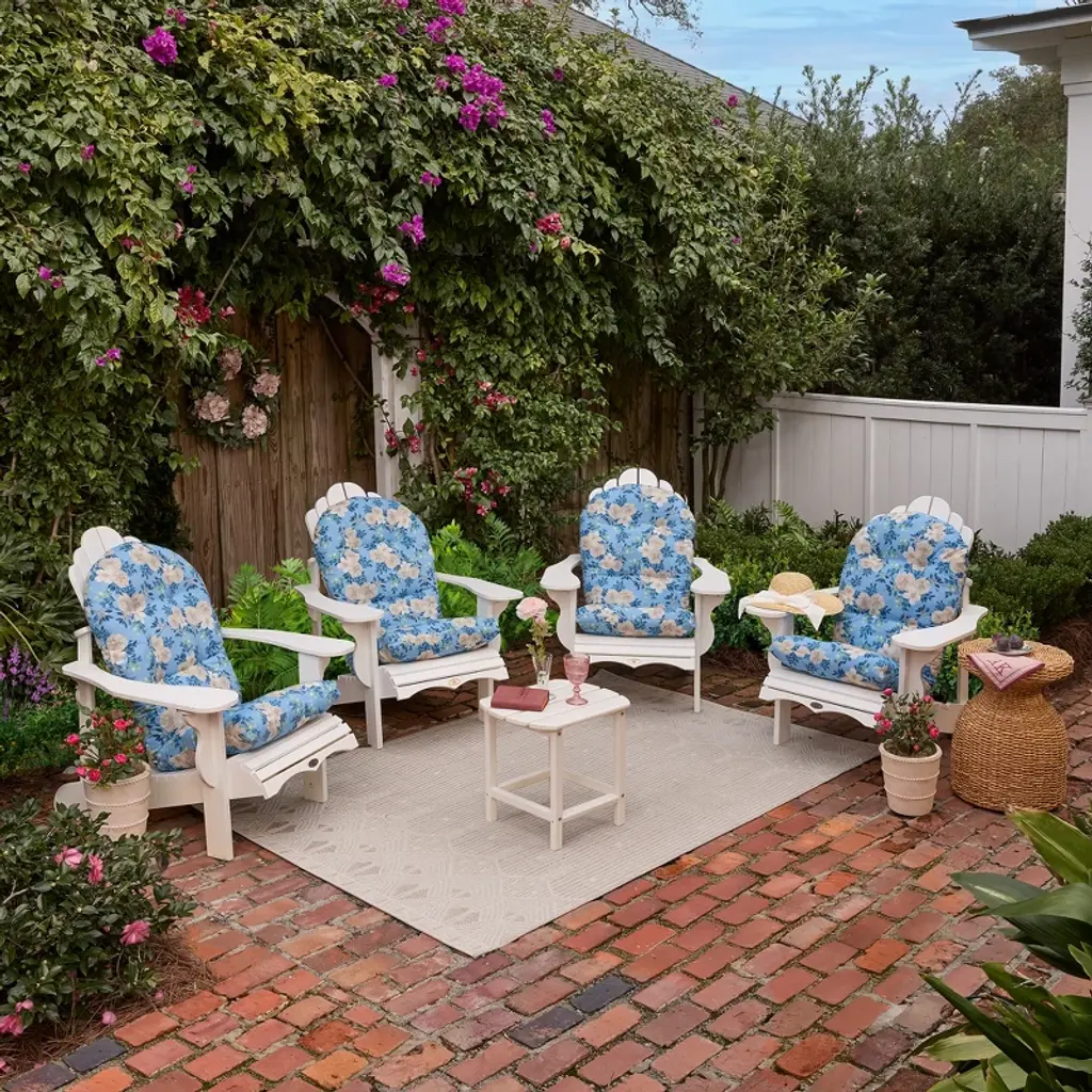 The Arden x Alexandra Kay Plush Blowfill Adirondack Chair Cushion 2-Pack is made with soft polyfiber fill and long-lasting outdoor polyester fabric with PFAS-Free C0 treatment. Alexandra Kay collaborated with the Arden design team to bring her palette and style to this ultra-comfortable outdoor Adirondack cushion that is also eco-friendly. This outdoor cushion measures 21.5 in W x 48 in L x 5 in T (Back: 21.5 in W x 30 in H and Seat: 20 in W x 18 in L). The 100% printed polyester outdoor fabric resists fading, so your patio cushion looks vibrant for longer. Skin-safe C0 water protection helps your Adirondack cushion withstand continued outdoor use, while cleaning easily with just soap and water for low-maintenance upkeep. Two sets of ties make sure your outdoor cushion stays firmly in place, while 6 tufts add a decorative touch. Inside this outdoor chair cushion is 100% polyfiber blowfill to help it retain shape and provide long-lasting comfort during outdoor use. Made from 100% recycled plastic, the polyfiber fill provides an environmentally friendly and durable option for your backyard patio. Sink into the plush design and enjoy your adirondack chair cushion set while sipping coffee with family or cocktails with your friends.