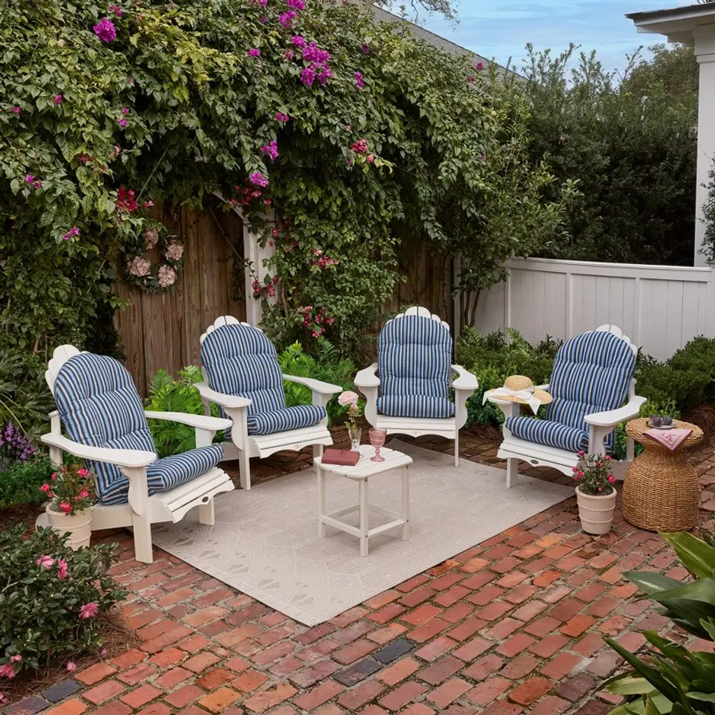The Arden x Alexandra Kay Plush Blowfill Adirondack Chair Cushion 2-Pack is made with soft polyfiber fill and long-lasting outdoor polyester fabric with PFAS-Free C0 treatment. Alexandra Kay collaborated with the Arden design team to bring her palette and style to this ultra-comfortable outdoor Adirondack cushion that is also eco-friendly. This outdoor cushion measures 21.5 in W x 48 in L x 5 in T (Back: 21.5 in W x 30 in H and Seat: 20 in W x 18 in L). The 100% printed polyester outdoor fabric resists fading, so your patio cushion looks vibrant for longer. Skin-safe C0 water protection helps your Adirondack cushion withstand continued outdoor use, while cleaning easily with just soap and water for low-maintenance upkeep. Two sets of ties make sure your outdoor cushion stays firmly in place, while 6 tufts add a decorative touch. Inside this outdoor chair cushion is 100% polyfiber blowfill to help it retain shape and provide long-lasting comfort during outdoor use. Made from 100% recycled plastic, the polyfiber fill provides an environmentally friendly and durable option for your backyard patio. Sink into the plush design and enjoy your adirondack chair cushion set while sipping coffee with family or cocktails with your friends.