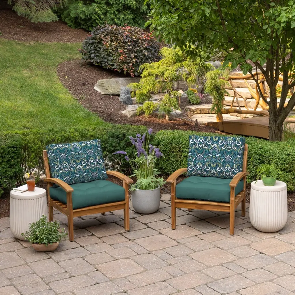 The ARDEN Plush Blowfill Deep Seat Set is made with soft polyfiber fill and long-lasting outdoor polyester fabric with PFAS-Free C0 treatment. Creating an ultra-comfortable outdoor deep seat cushion that is also eco-friendly and skin safe for your family. This outdoor conversation cushion has one pillow that measures 24in W x 18 in L x 7 in T and one seat that measures 24 in W x 24 in H x 5.5 in T. The 100% printed polyester outdoor fabric resists fading, so your patio cushion looks vibrant for longer. Skin-safe C0 water protection helps your dining cushion withstand continued outdoor use, while easy cleaning with just soap and water for low-maintenance upkeep. Two sets of ties on the seat bottom make sure your outdoor deep seat cushion stays firmly in place. This set includes a banded pillow back and a seat with 4 tufts to add a decorative touch. Inside this outdoor deep seat cushion set is 100% polyfiber blowfill to help it retain shape and provide long-lasting comfort during outdoor use. Made from 100% recycled plastic bottles, the polyfiber fill provides an environmentally friendly and durable option for your backyard patio. Although this deep seat cushion set is both water and UV-resistant, we recommend bringing it indoors when it rains or when not in use to preserve its lifespan and keep it looking beautiful.