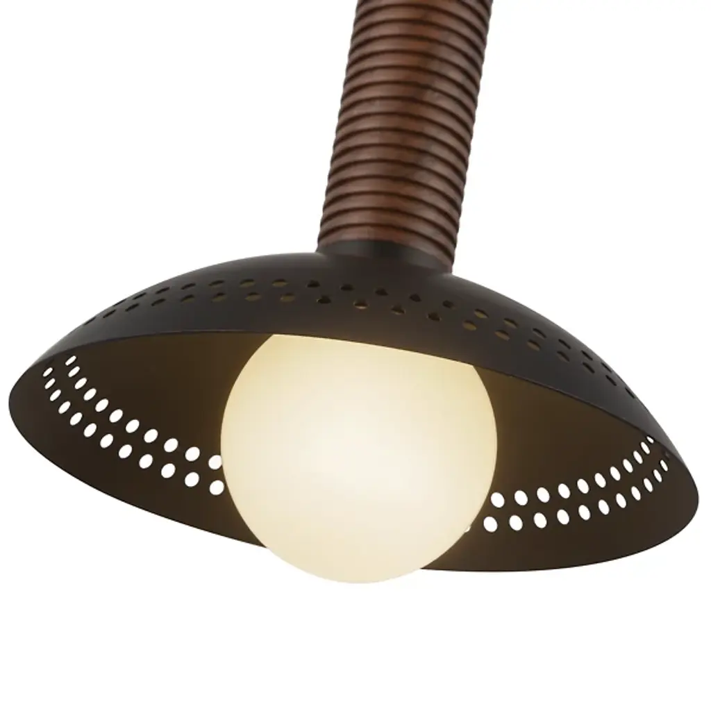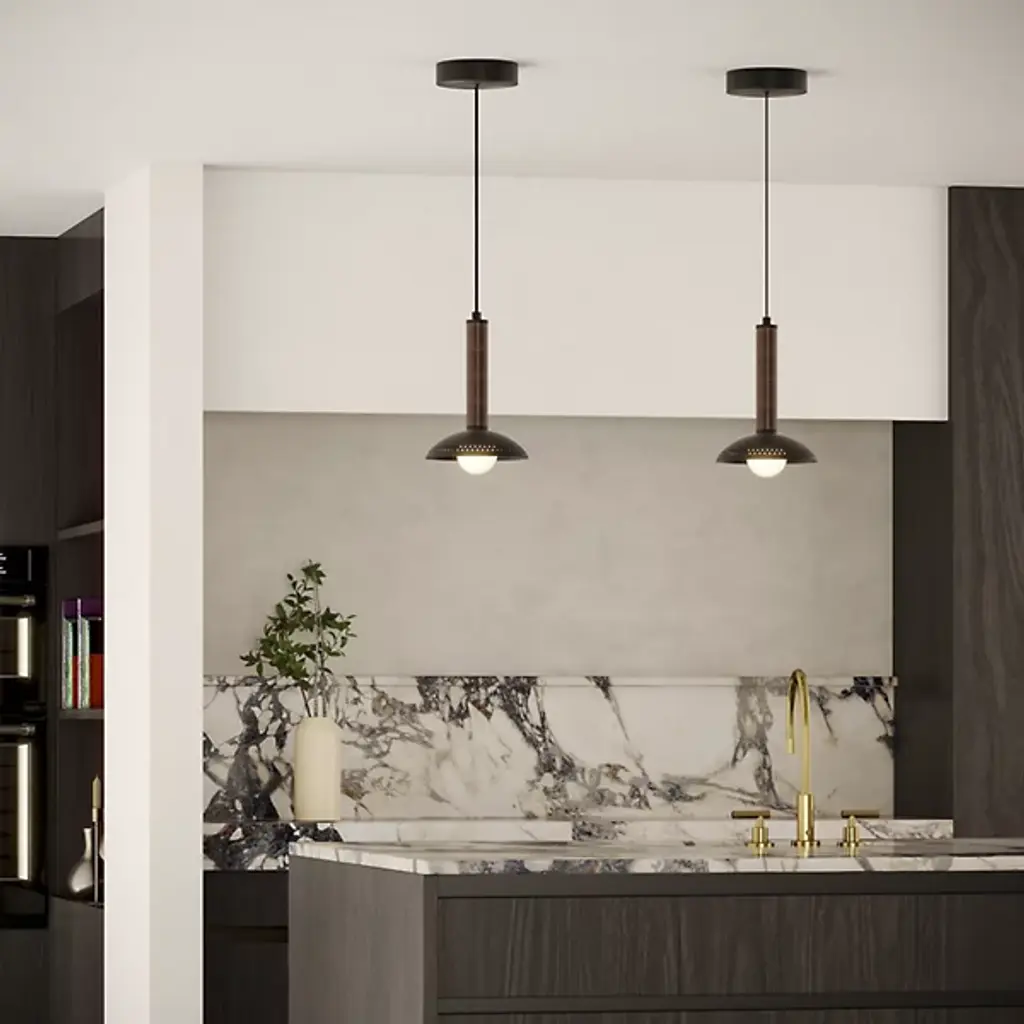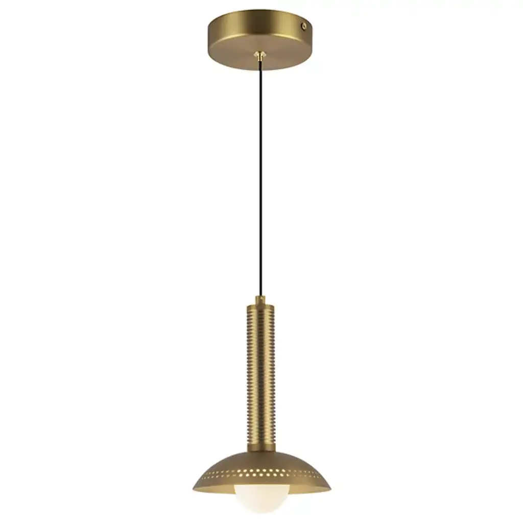 The Arden Shade LED Mini Pendant from Alora Mood adds refined texture and soft illumination to compact spaces. Designed by Hae Jung Roe, this pendant features a ribbed housing offset by a pinhole-pierced bowl-shaped shade that surrounds a glowing opal glass diffuser. The integrated LED casts a warm white light, creating a cozy, modern atmosphere. Clean lines and a subtle industrial influence make it perfect for hanging solo over small tables or in multiples above counters, bringing thoughtful detail to contemporary interiors.