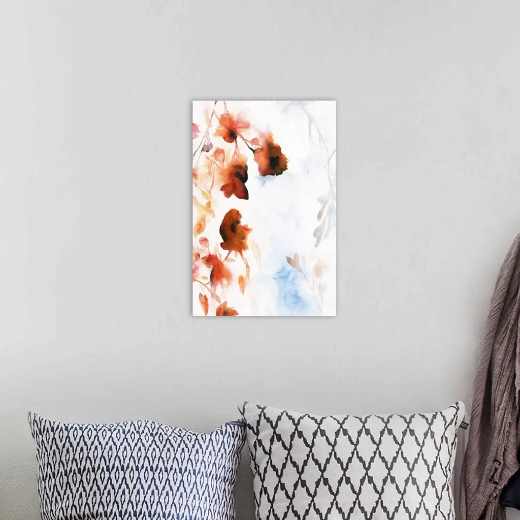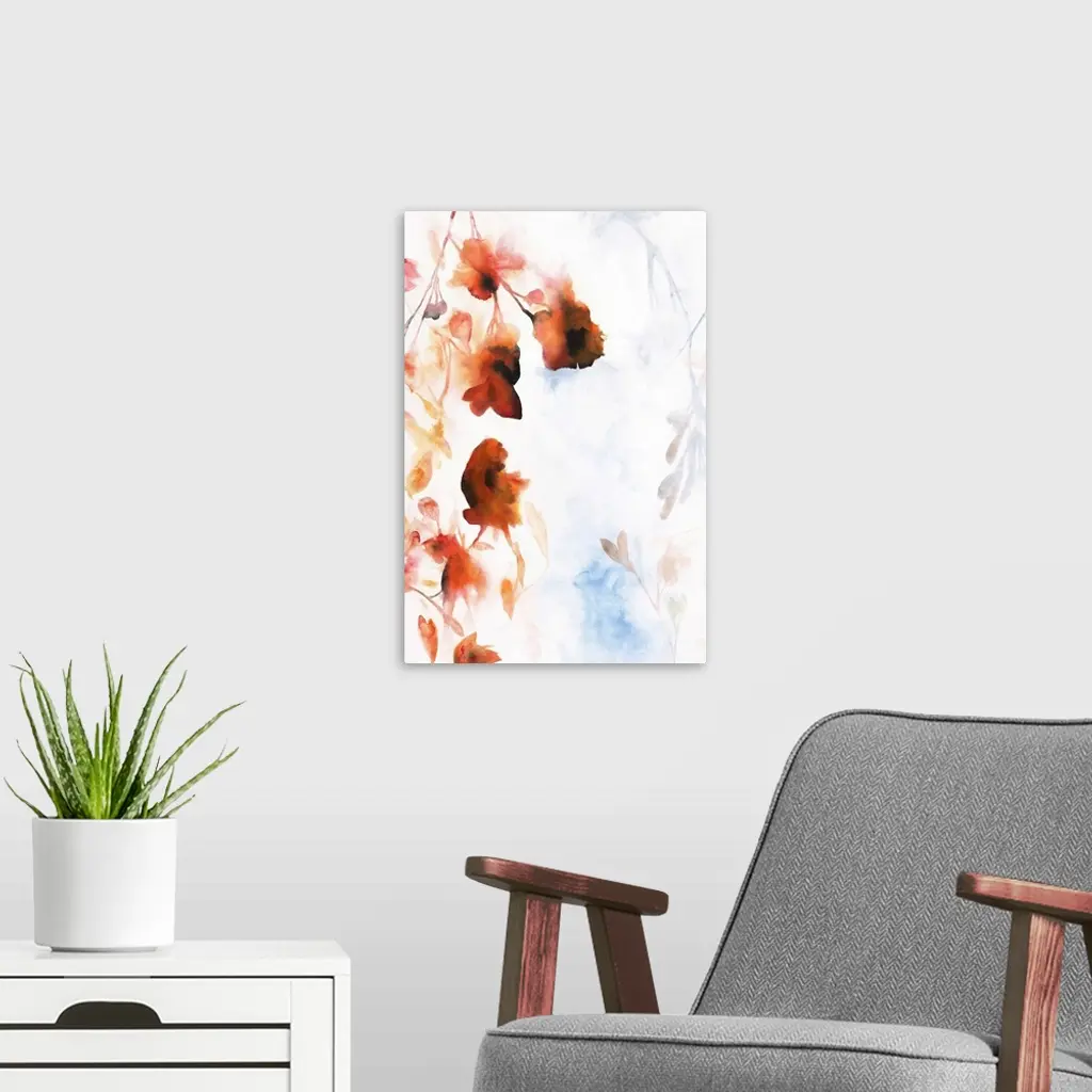 Silhouettes of orange toned flowers lining the left side of the canvas on a white background with faint colors underneath resembling leaves and branches.