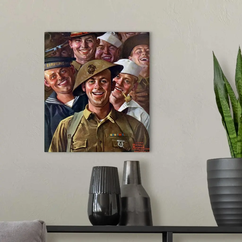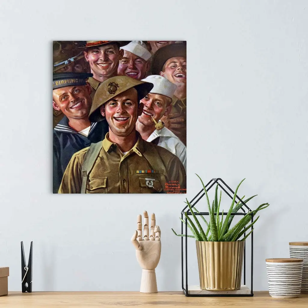 Distant from the activities of the war raging in Europe, Norman Rockwell was challenged to record his interpretation of the effects of World War II on servicemen, and on Americans at home. Alternate Title: Group of Smiling Soldiers' Faces. Approved by the Norman Rockwell Family Agency
