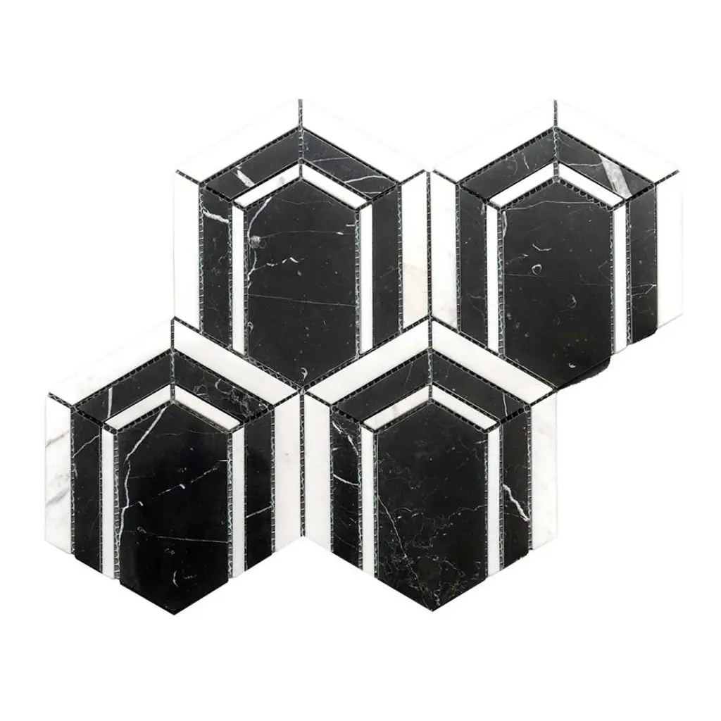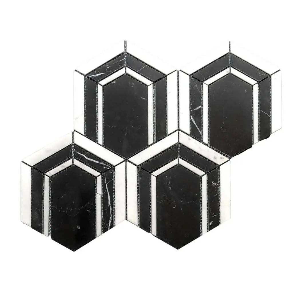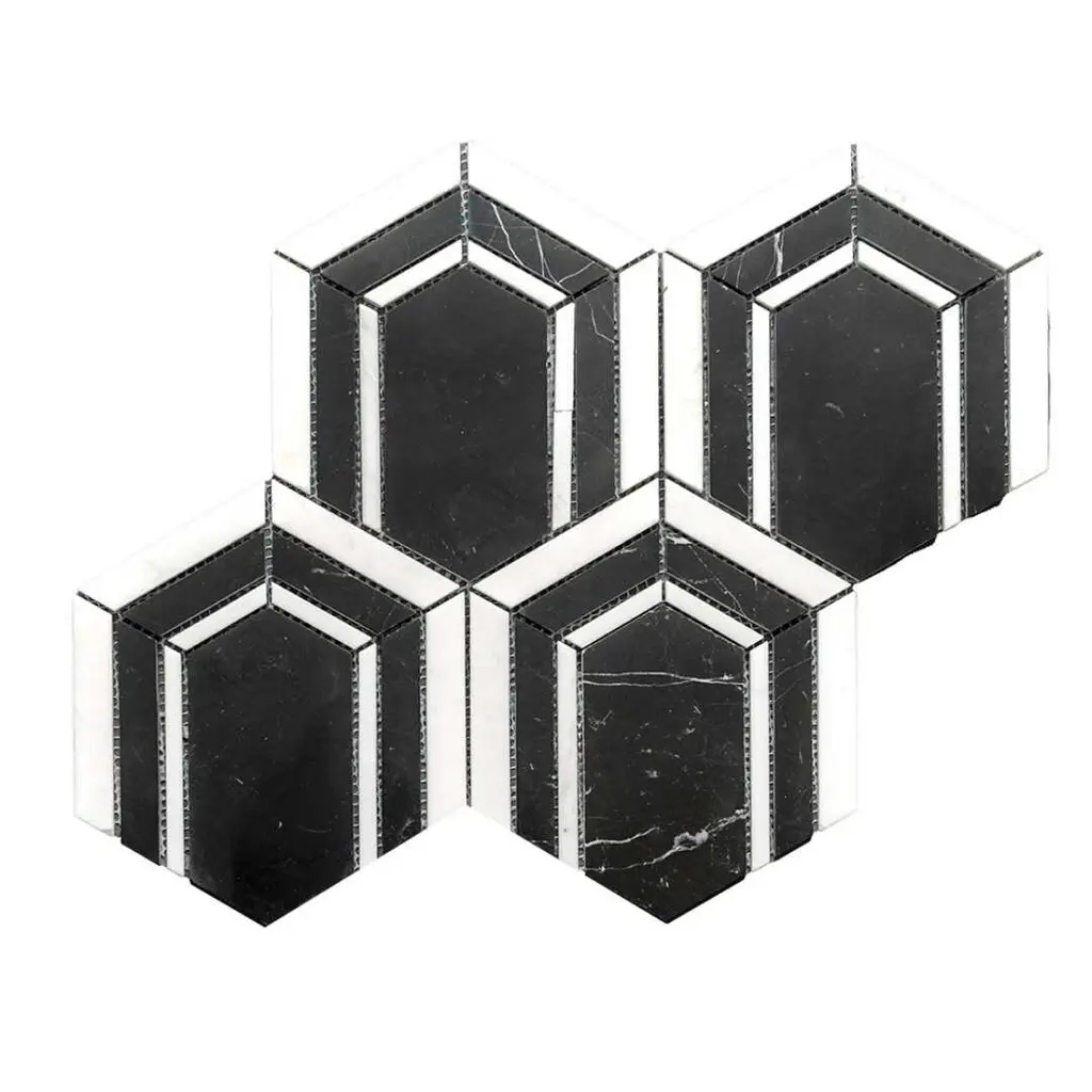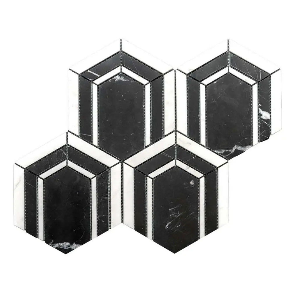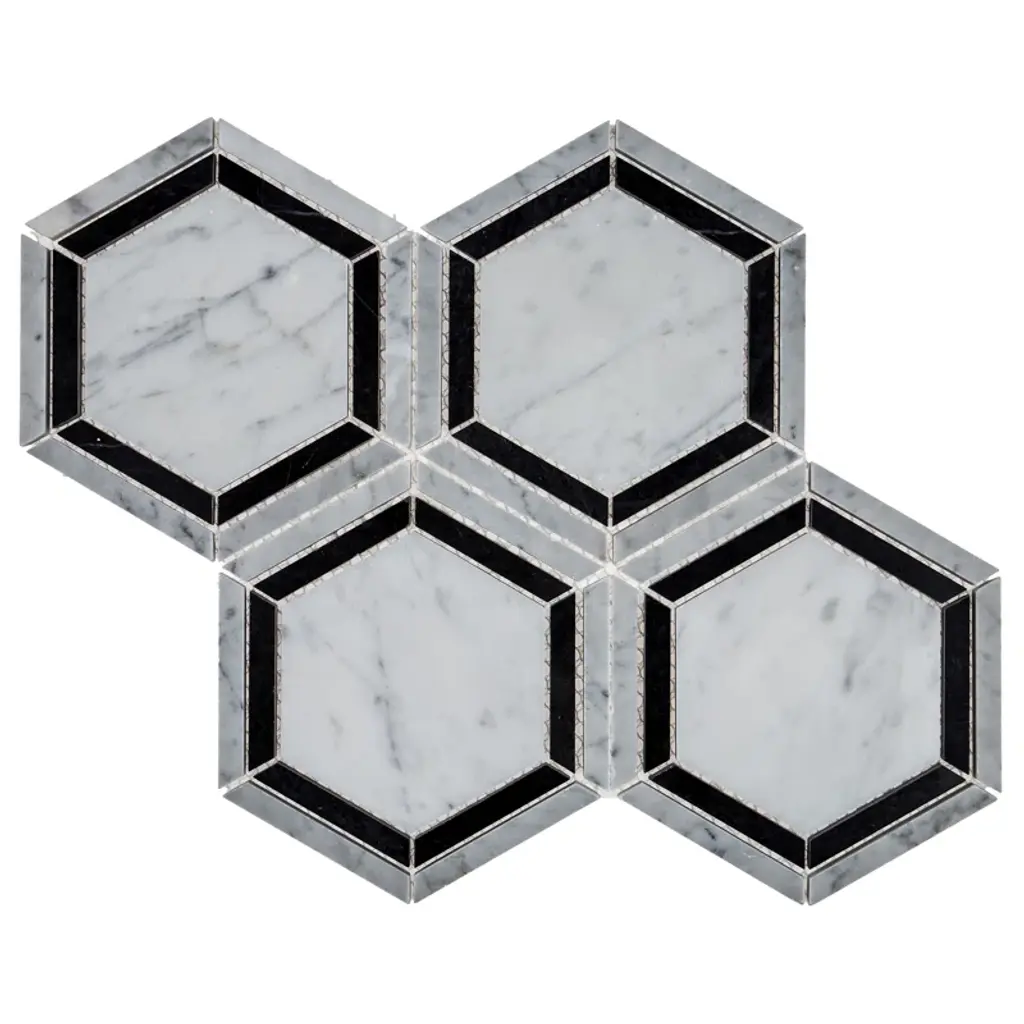 Argos Peak presents a chic tile collection featuring three hexagon mosaic designs in classic black and white. With a blend of modern geometry and timeless style, Argos Peak enhances the ambiance of any room. Each mosaic offers a bold yet balanced pattern that adds visual interest without overwhelming the space. Crafted from durable polished marble, these versatile tiles are perfect for floors, walls, or backsplashes in both residential and commercial spaces. FEATURES: Each mosaic sheet covers 0.83 square foot (approx.) Marble, meshed backed, hexagon, mosaic, polished, rectified edge tile for floor and wall use Impervious and waterproof; Not suitable for outdoor use but are resistant to most elements Polished finish with a shade 1 rating/ variation - V1 uniform appearance High-quality marble look with porcelain's easy maintenance Shiny polished finish Mesh-mounted, creating a seamless pattern and easy installation Modern geometric hexagon shape in a monochromatic color palette Perfect for commercial or residential installations Great for backsplashes, kitchens, bathrooms, or feature walls Easy to install 12" x 14" decorative porcelain mosaic floor and wall tiles Available in three colors: Nero, Carrara, and Carrara & Thassos DIMENSIONS: Mosaic sheet: 12 inches L x 14 inches W Surface area per piece: 0.83 square feet