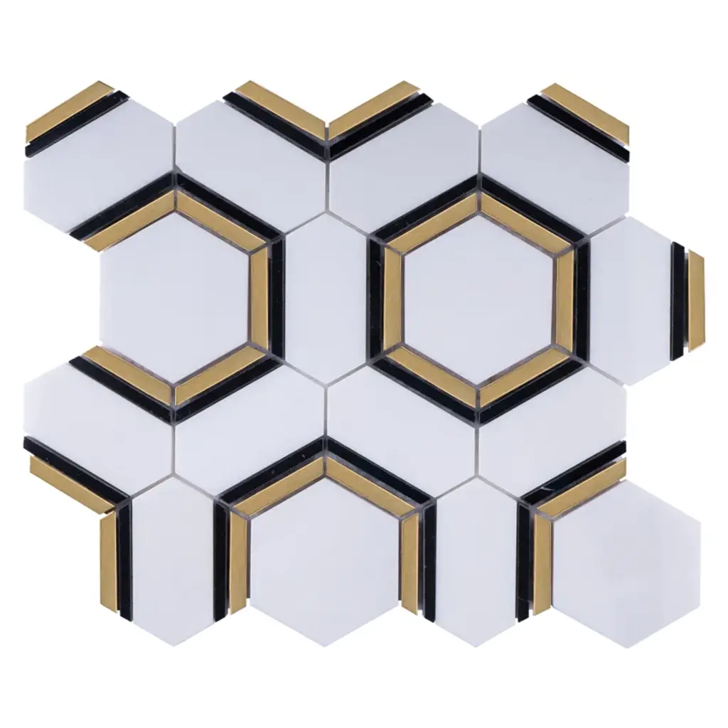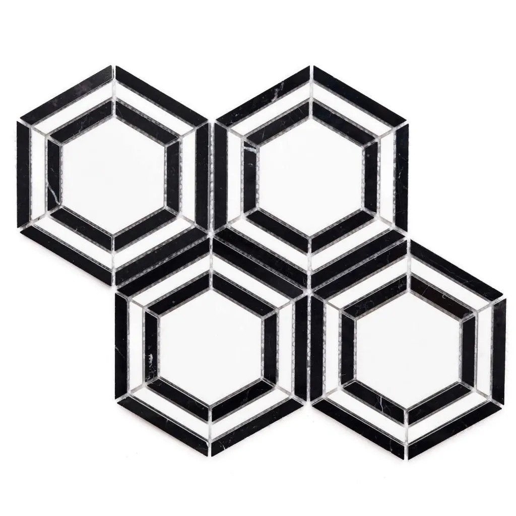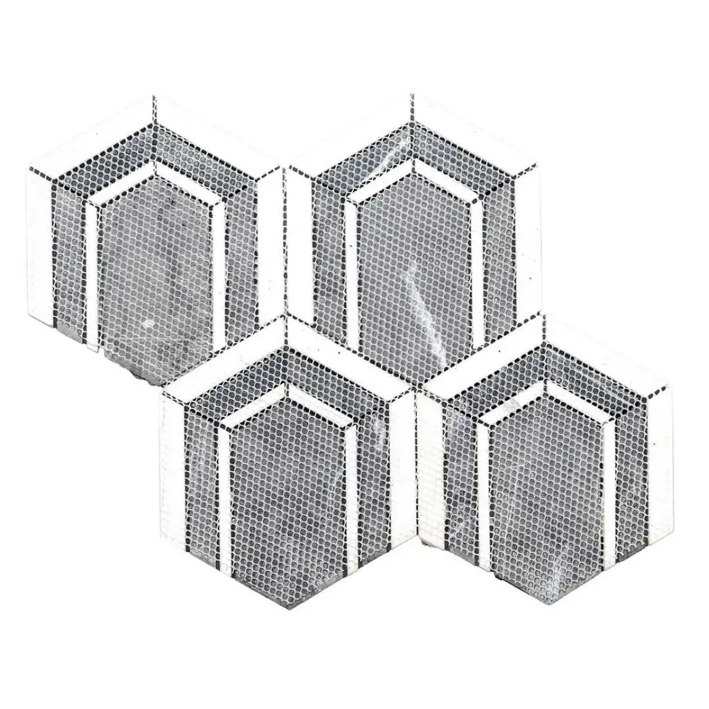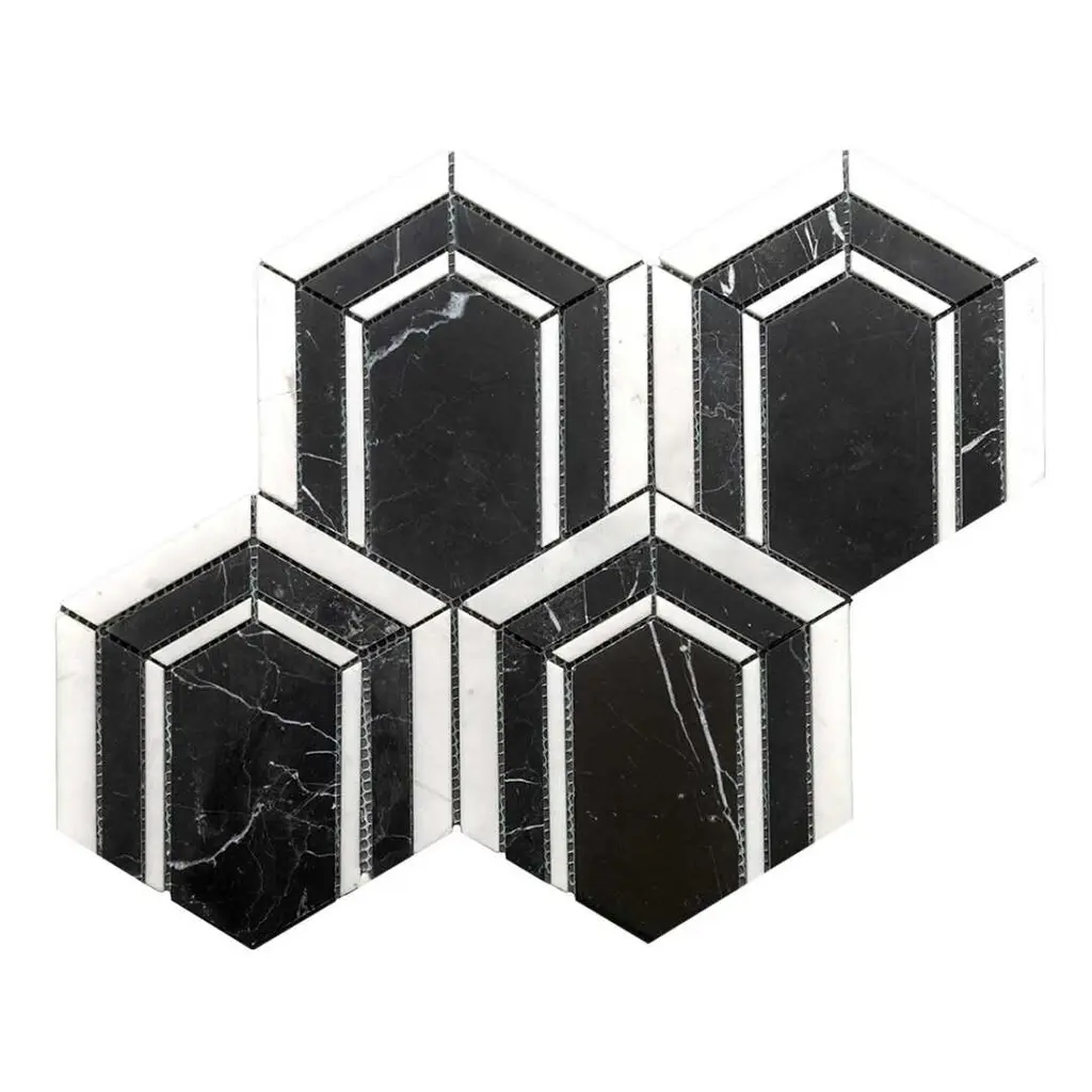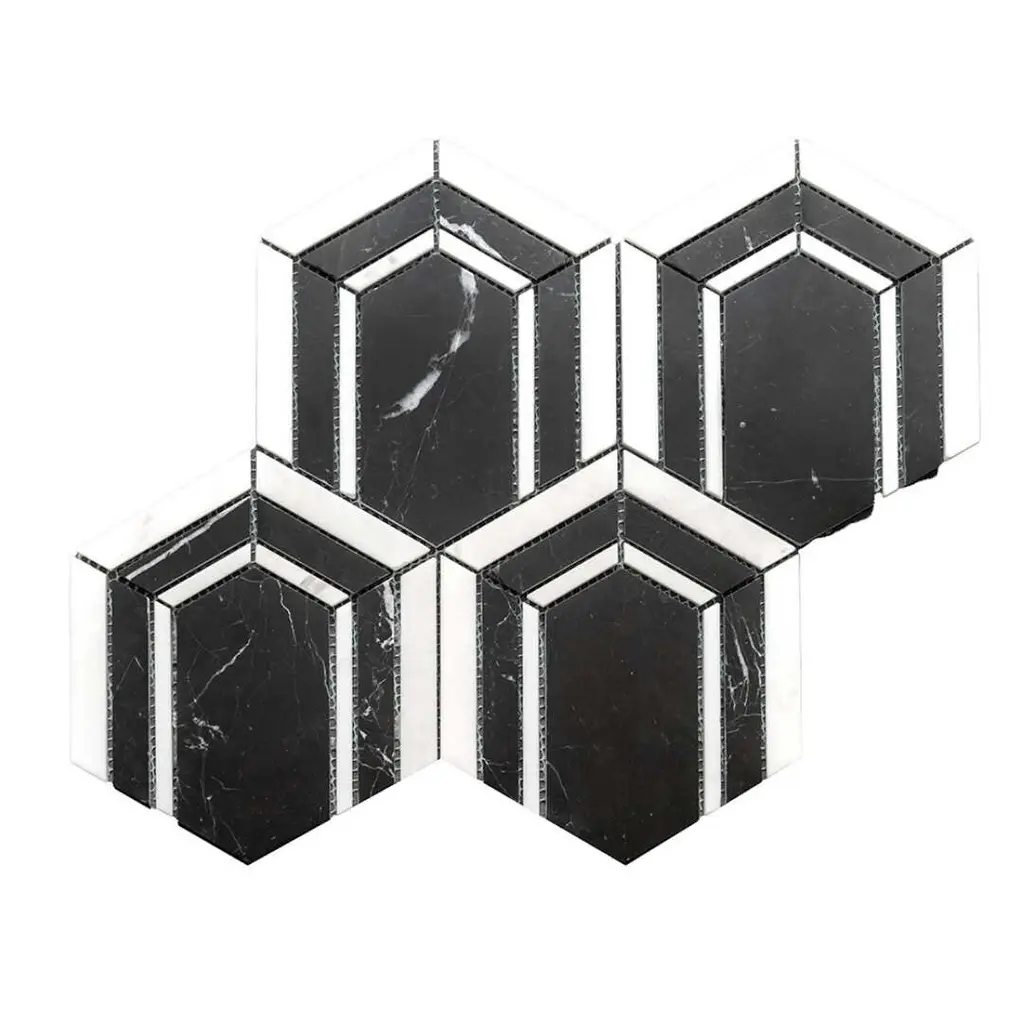 Argos Peak presents a chic tile collection featuring three hexagon mosaic designs in classic black and white. With a blend of modern geometry and timeless style, Argos Peak enhances the ambiance of any room. Each mosaic offers a bold yet balanced pattern that adds visual interest without overwhelming the space. Crafted from durable polished marble, these versatile tiles are perfect for floors, walls, or backsplashes in both residential and commercial spaces. FEATURES: Each mosaic sheet covers 0.83 square foot (approx.) Marble, meshed backed, hexagon, mosaic, polished, rectified edge tile for floor and wall use Impervious and waterproof; Not suitable for outdoor use but are resistant to most elements Polished finish with a shade 1 rating/ variation - V1 uniform appearance High-quality marble look with porcelain's easy maintenance Shiny polished finish Mesh-mounted, creating a seamless pattern and easy installation Modern geometric hexagon shape in a monochromatic color palette Perfect for commercial or residential installations Great for backsplashes, kitchens, bathrooms, or feature walls Easy to install 12" x 14" decorative porcelain mosaic floor and wall tiles Available in three colors: Nero, Carrara, and Carrara & Thassos DIMENSIONS: Mosaic sheet: 12 inches L x 14 inches W Surface area per piece: 0.83 square feet