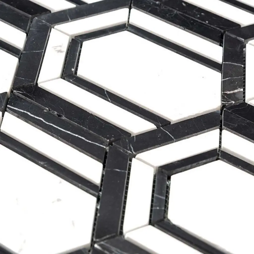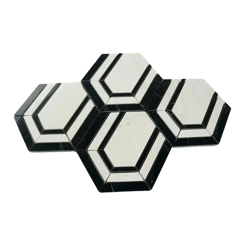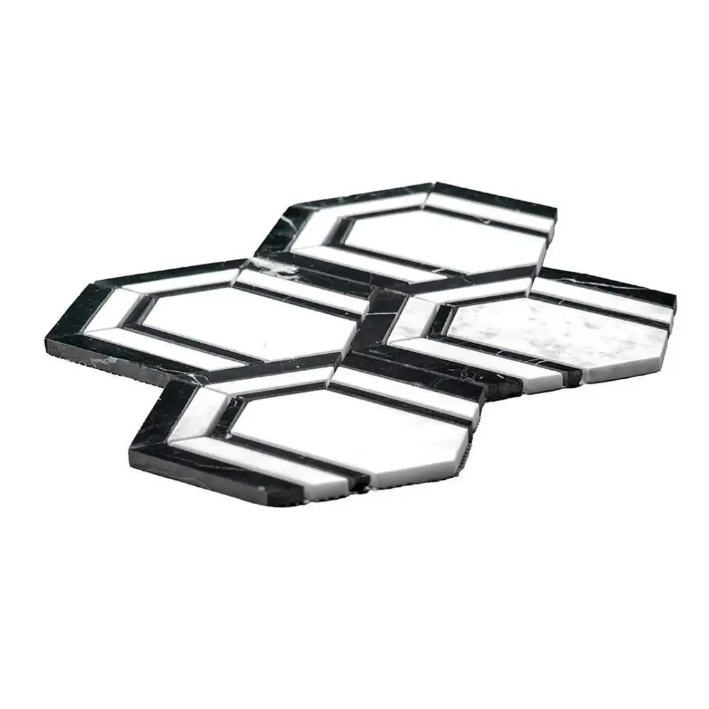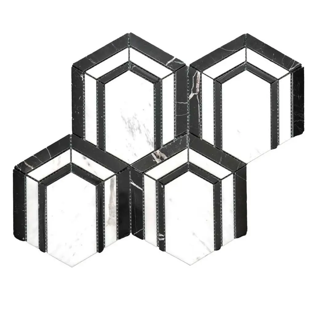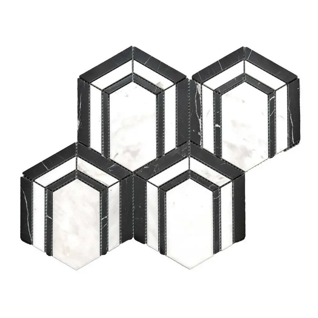 Argos Peak presents a chic tile collection featuring three hexagon mosaic designs in classic black and white. With a blend of modern geometry and timeless style, Argos Peak enhances the ambiance of any room. Each mosaic offers a bold yet balanced pattern that adds visual interest without overwhelming the space. Crafted from durable polished marble, these versatile tiles are perfect for floors, walls, or backsplashes in both residential and commercial spaces. FEATURES: Each mosaic sheet covers 0.83 square foot (approx.) Marble, meshed backed, hexagon, mosaic, polished, rectified edge tile for floor and wall use Impervious and waterproof; Not suitable for outdoor use but are resistant to most elements Polished finish with a shade 1 rating/ variation - V1 uniform appearance High-quality marble look with porcelain's easy maintenance Shiny polished finish Mesh-mounted, creating a seamless pattern and easy installation Modern geometric hexagon shape in a monochromatic color palette Perfect for commercial or residential installations Great for backsplashes, kitchens, bathrooms, or feature walls Easy to install 12" x 14" decorative porcelain mosaic floor and wall tiles Available in three colors: Nero, Carrara, and Carrara & Thassos DIMENSIONS: Mosaic sheet: 12 inches L x 14 inches W Surface area per piece: 0.83 square feet