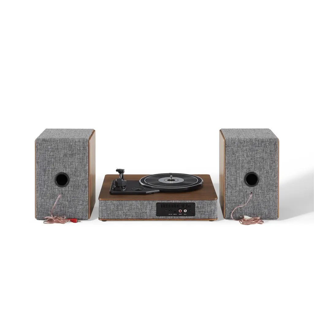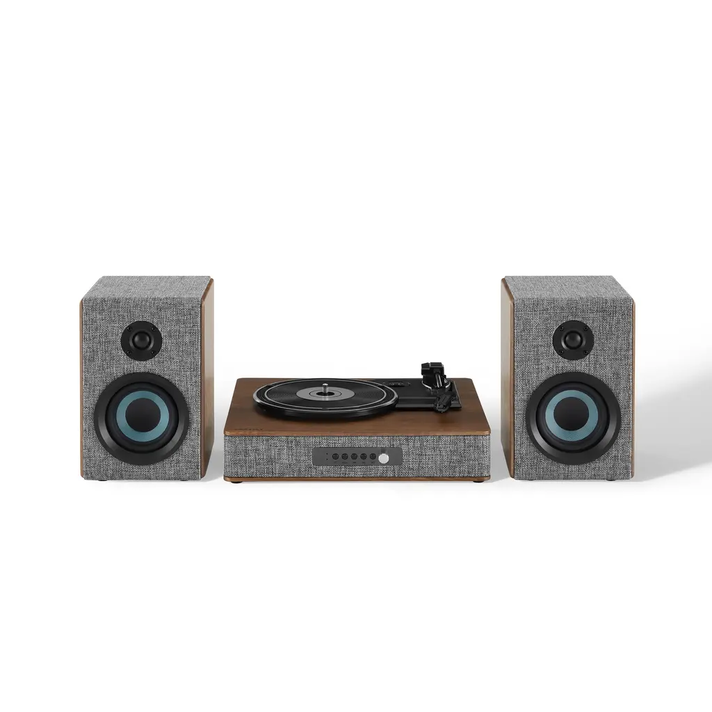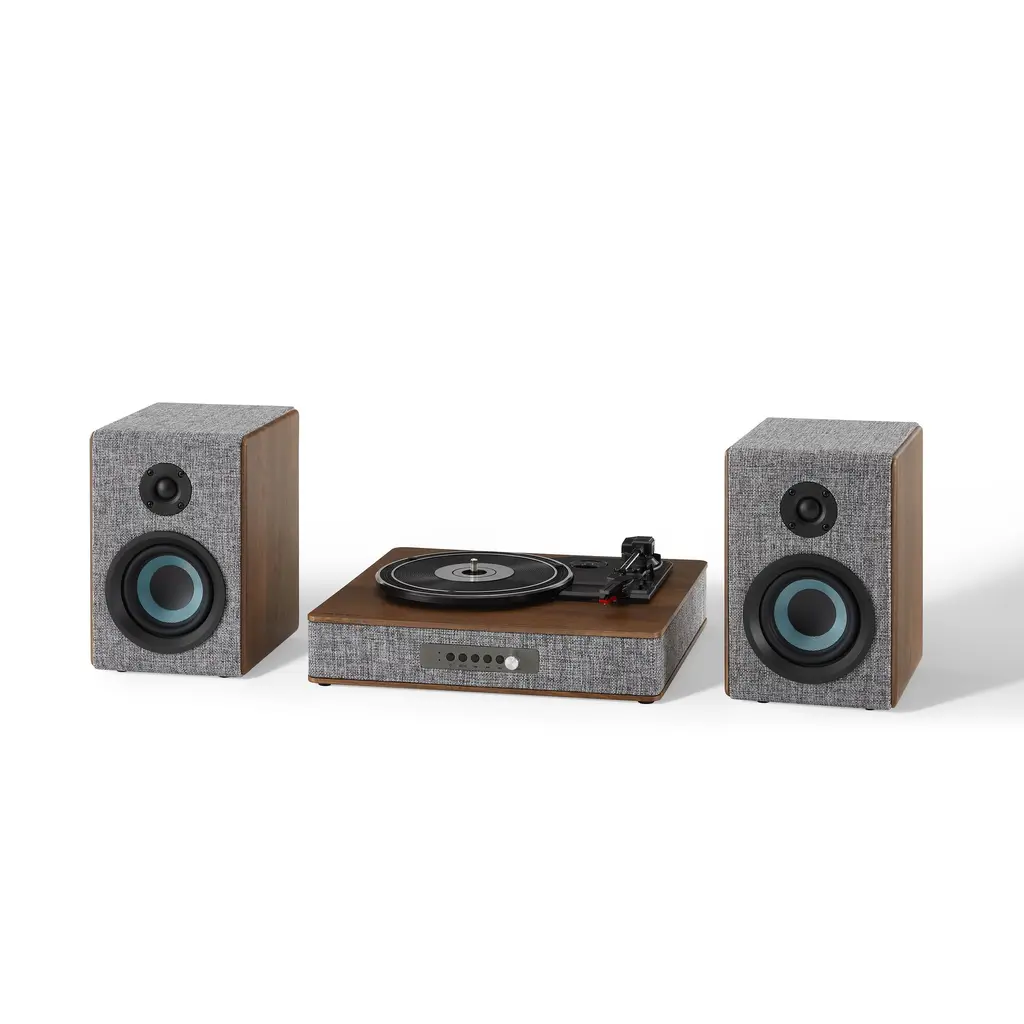They say clothes make the person, but in this case, they also make the stereo. With eye-catching heather grey fabric accented with walnut wood and silver, the Aria Record Player with Speakers is dressed for success. But this vinyl record player is much more than its charming exterior - the three-speed turntable boasts a built-in Bluetooth receiver and FM radio. Plus, the included bookshelf speakers deliver 100 watts of heart-thumping sound. With capabilities that are impossible to resist, the Aria aligns with the refined tastes of the stylish audiophile.Features: