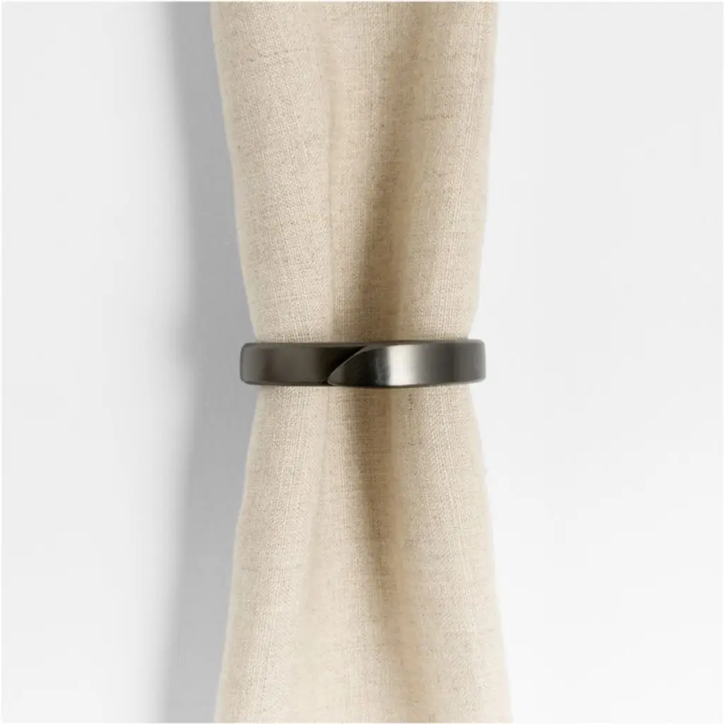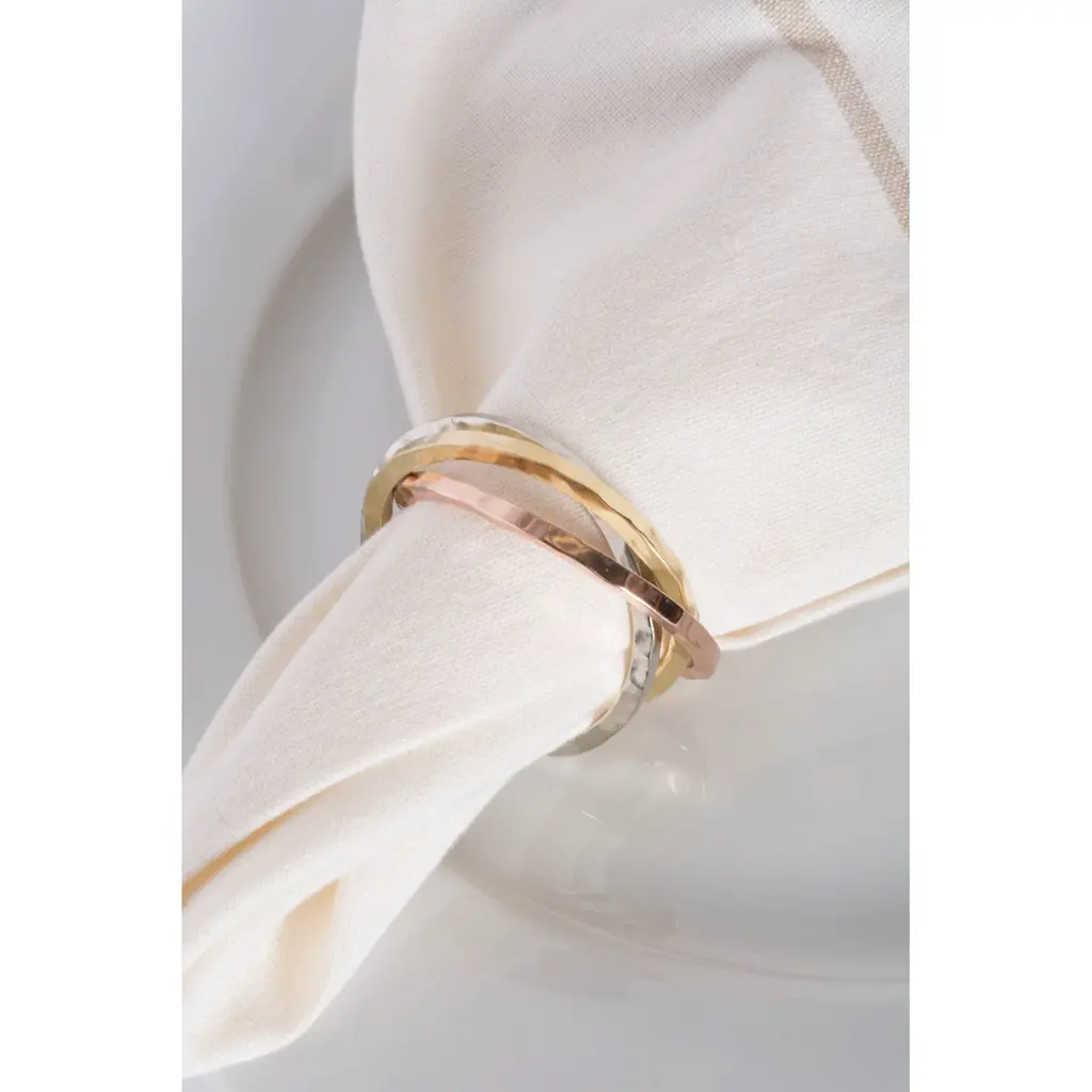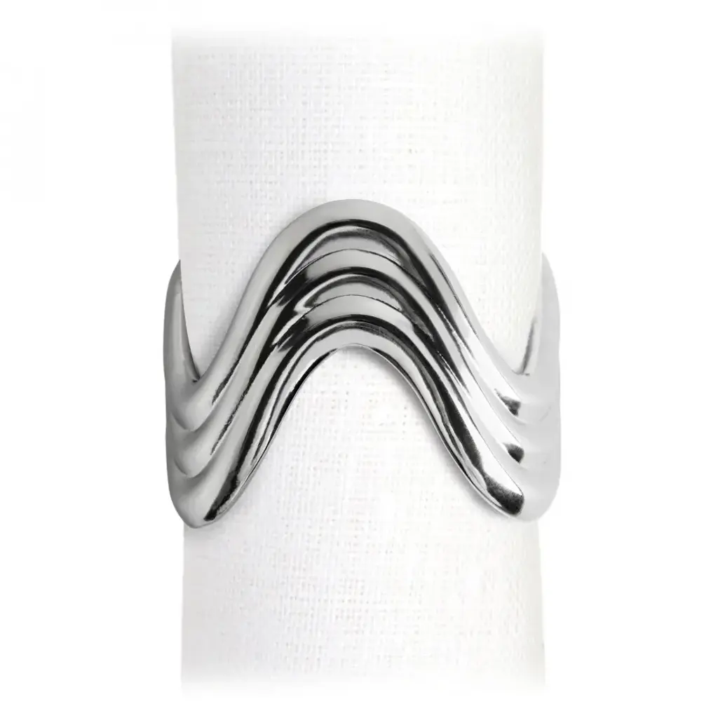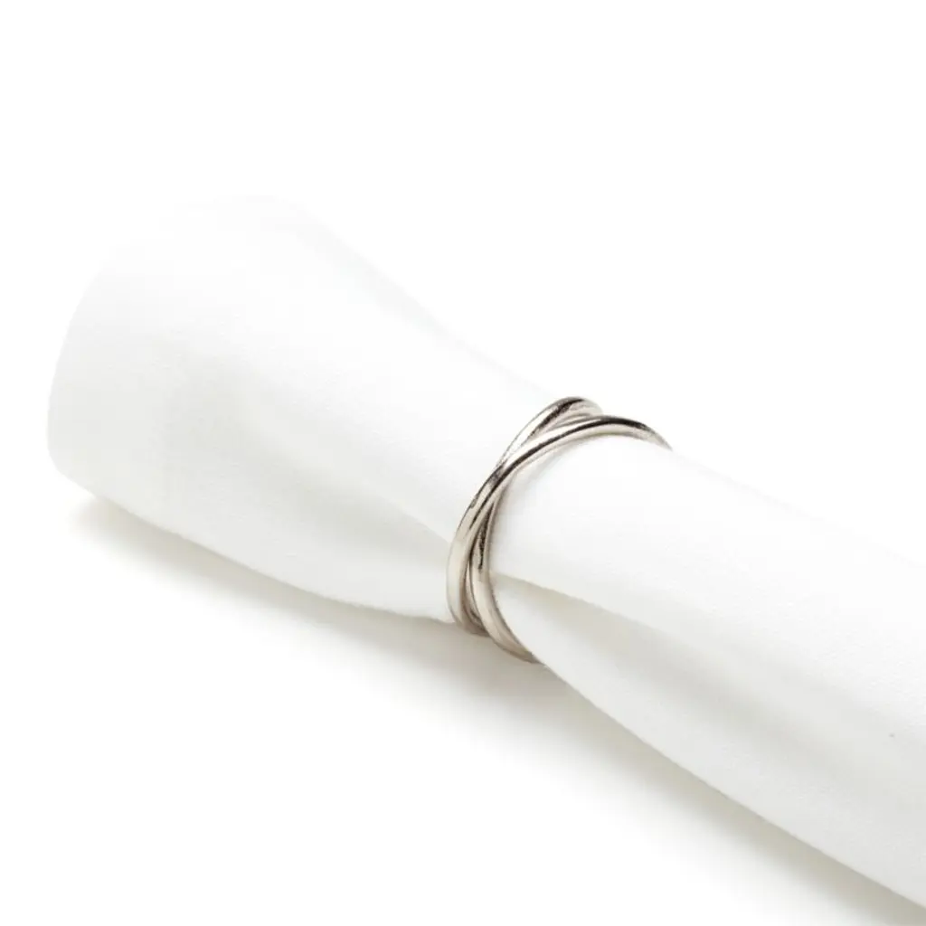 A simple, organic shape entwines silver bands with a soft, lustrous finish to form a beautiful napkin ring for elegant table settings and special occasions. Made of stainless steel with a silver finish, the two-ring design looks elegant with formal dinnerware and adds sparkle to casual linen and cotton napkins for everyday meals. We love the hint of glimmer with all-white or monochromatic place settings. Napkin rings can secure napkins in a range of folded designs, from the simple roll to the fan fold or double candle fan fold.