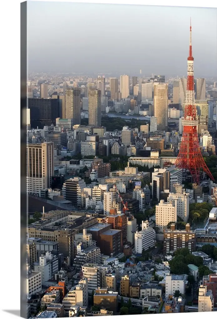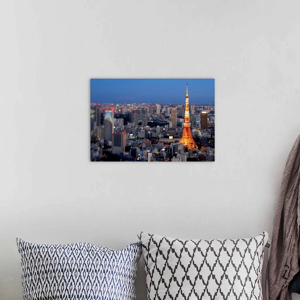 Arial view of Tokyo at dusk sign on illuminated Tokyo Tower. wall art for home and office decor. Discover canvas art prints, photos, mural, big canvas art and framed wall art in GreatBigCanvas.com's varied collections.