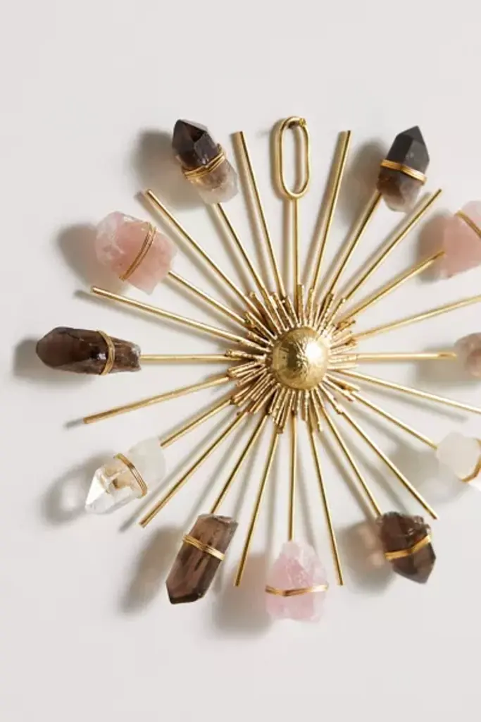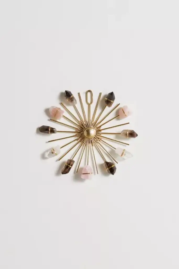 Elegant metal sunburst handmade by Ariana Ost, featuring spires accented with fuchsite, blue calcite, pyrite, clear quartz, citrine and rose quartz crystals bound around edges for a pretty boho touch. Crystals are genuine and ethically sourced - each may vary slightly in size and tone. **Features** \- Ariana Ost Rainbow Sunburst Crystal Wall Hanging \- Sunburst silhouette with assorted crystals around the edges \- One-of-a-kind crystal variance **Content + Care** \- Fuchsite, blue calcite, pyrite, clear quartz, citrine, rose quartz, brass \- Wipe clean \- Made in the USA **Size** \- Dimensions: 8"dia