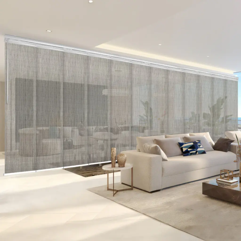 Central Design Products is pleased to introduce a new innovative panel track that offers easy 2-way installation, adding an alluring style and refined touch to your home decor. The double rail design of the track is sleek, compact, and reduces the overall footprint and weight of the installation, eliminating bulky, intrusive window treatments. Adjusting the panel height is a breeze � simply trim the panel, re-attach the liner, and install the panel weight. Detailed instructions are included.The panel track also features a patented slider design, made with aluminum and fitted with bearings that allow for durable and smooth operation. The sliders are stacked closer together than conventional panel tracks, reducing light bleed coming from the gaps between panels. This track has endless uses from dividing rooms, garages, offices, and closets to decorating windows and patios. Available in smaller sizes including 3, 4, 5, 6, and 7 panels. Extends from 140-260� wide. Each panel measures 23.5" wide and 116" tall, with a total installation height of 118.5" (includes the 2.5" rail track). The track can be wall or ceiling mounted. The panels can stack on the left or the right. The clearance from the wall is extendable from 1.25� to 3.25� and projection from the wall is extendable from 3� to 4.25�. Arias panel is made from 85% Vinyl 15% Polyester, with a light filtering shade that blocks 40% of the light.