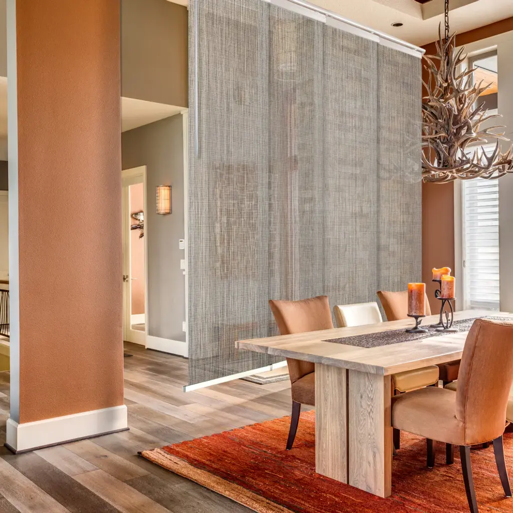 Central Design Products is pleased to introduce a new innovative panel track that offers easy 2-way installation, adding an alluring style and refined touch to your home decor. The single rail design of the track is sleek, compact, and reduces the overall footprint and weight of the installation, eliminating bulky, intrusive window treatments. Adjusting the panel height is a breeze � simply trim the panel, re-attach the liner, and install the panel weight. Detailed instructions are included.The panel track also features a patented slider design, made with aluminum and fitted with bearings that allow for durable and smooth operation. The sliders are stacked closer together than conventional panel tracks, reducing light bleed coming from the gaps between panels. This track has endless uses from dividing rooms, garages, offices, and closets to decorating windows and patios. Available in larger sizes including 8, 10, and 12 panels. Extends from 48-88� wide. Each panel measures 23.5" wide and 116" tall, with a total installation height of 118.5" (includes the 2.5" rail track). The track can be wall or ceiling mounted. The panels can stack on the left or the right. The clearance from the wall is extendable from 1.25� to 3.25� and projection from the wall is extendable from 3� to 4.25�. Arias panel is made from 85% Vinyl 15% Polyester, with a light filtering shade that blocks 40% of the light.
