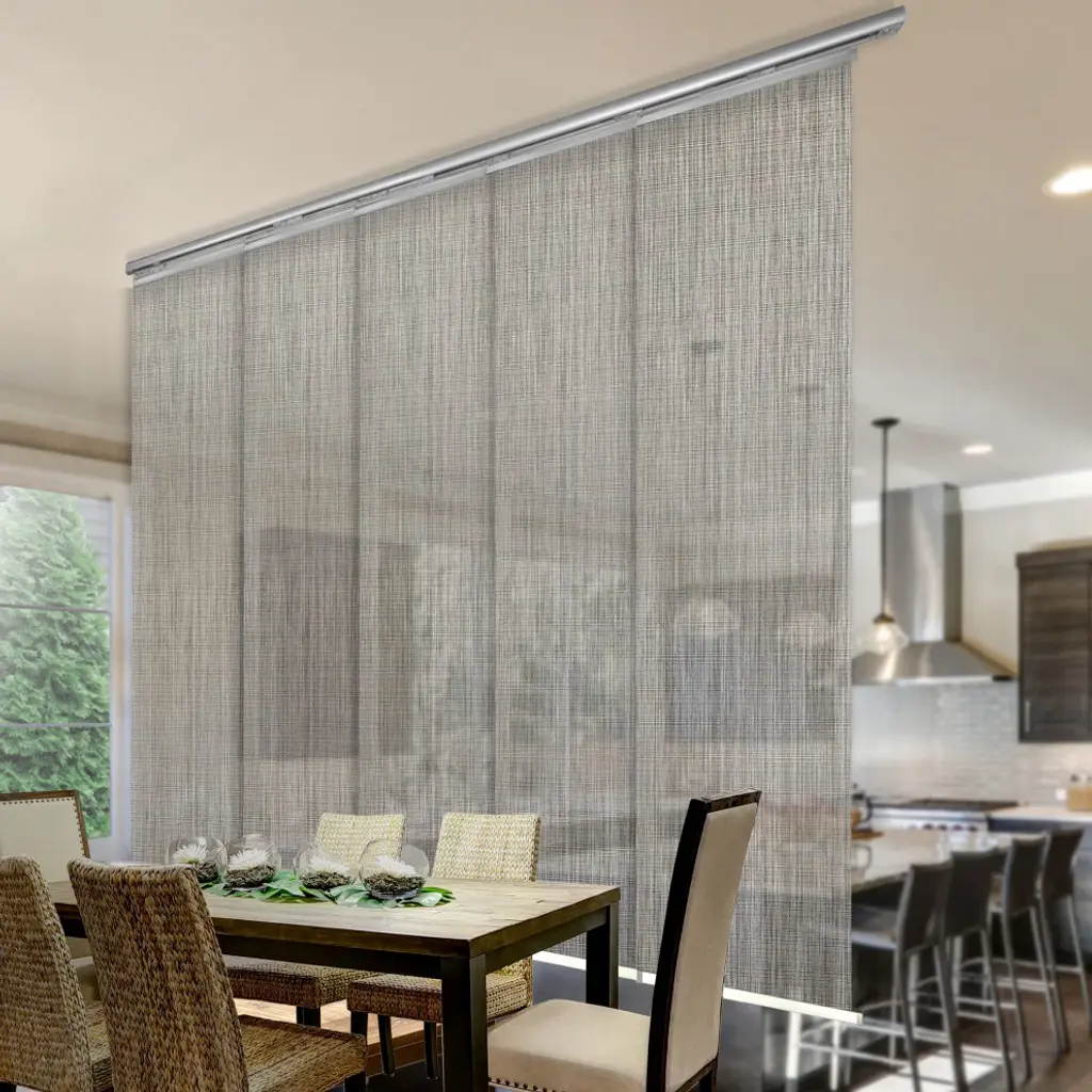 Central Design Products is pleased to introduce a new innovative panel track that offers easy 2-way installation, adding an alluring style and refined touch to your home decor. The single rail design of the track is sleek, compact, and reduces the overall footprint and weight of the installation, eliminating bulky, intrusive window treatments. Adjusting the panel height is a breeze � simply trim the panel, re-attach the liner, and install the panel weight. Detailed instructions are included.The panel track also features a patented slider design, made with aluminum and fitted with bearings that allow for durable and smooth operation. The sliders are stacked closer together than conventional panel tracks, reducing light bleed coming from the gaps between panels. This track has endless uses from dividing rooms, garages, offices, and closets to decorating windows and patios. Available in larger sizes including 8, 10, and 12 panels. Extends from 58-110� wide. Each panel measures 23.5" wide and 91.5" tall, with a total installation height of 94" (includes the 2.5" rail track). The track can be wall or ceiling mounted. The panels can stack on the left or the right. The clearance from the wall is extendable from 1.25� to 3.25� and projection from the wall is extendable from 3� to 4.25�. Arias panel is made from 85% Vinyl 15% Polyester, with a light filtering shade that blocks 40% of the light.
