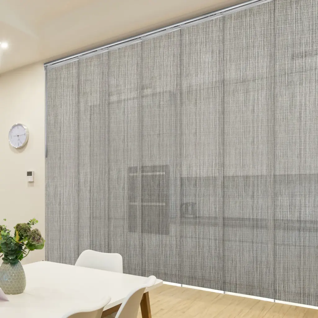 Central Design Products is pleased to introduce a new innovative panel track that offers easy 2-way installation, adding an alluring style and refined touch to your home decor. The single rail design of the track is sleek, compact, and reduces the overall footprint and weight of the installation, eliminating bulky, intrusive window treatments. Adjusting the panel height is a breeze � simply trim the panel, re-attach the liner, and install the panel weight. Detailed instructions are included.The panel track also features a patented slider design, made with aluminum and fitted with bearings that allow for durable and smooth operation. The sliders are stacked closer together than conventional panel tracks, reducing light bleed coming from the gaps between panels. This track has endless uses from dividing rooms, garages, offices, and closets to decorating windows and patios. Available in larger sizes including 8, 10, and 12 panels. Extends from 110-153� wide. Each panel measures 23.5" wide and 116" tall, with a total installation height of 118.5" (includes the 2.5" rail track). The track can be wall or ceiling mounted. The panels can stack on the left or the right. The clearance from the wall is extendable from 1.25� to 3.25� and projection from the wall is extendable from 3� to 4.25�. Arias panel is made from 85% Vinyl 15% Polyester, with a light filtering shade that blocks 40% of the light.