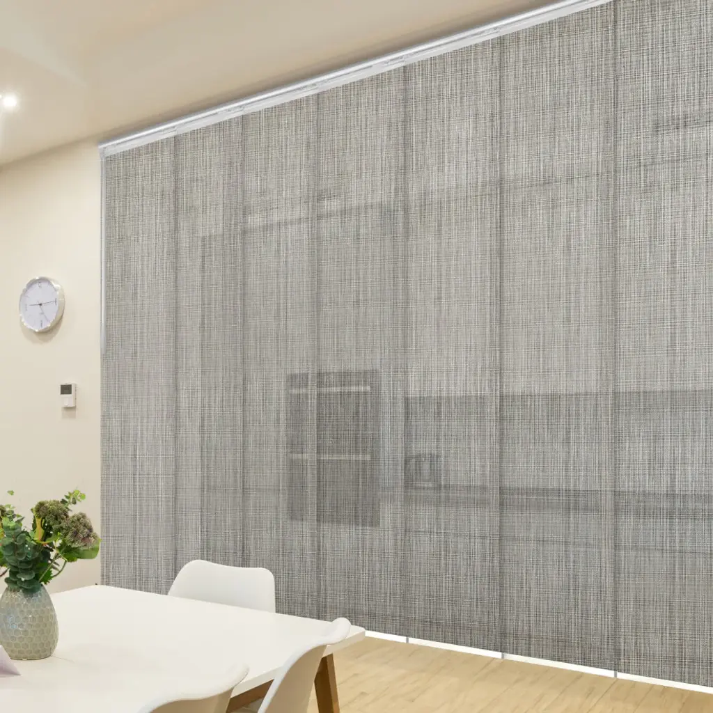 Central Design Products is pleased to introduce a new innovative panel track that offers easy 2-way installation, adding an alluring style and refined touch to your home decor. The single rail design of the track is sleek, compact, and reduces the overall footprint and weight of the installation, eliminating bulky, intrusive window treatments. Adjusting the panel height is a breeze � simply trim the panel, re-attach the liner, and install the panel weight. Detailed instructions are included.The panel track also features a patented slider design, made with aluminum and fitted with bearings that allow for durable and smooth operation. The sliders are stacked closer together than conventional panel tracks, reducing light bleed coming from the gaps between panels. This track has endless uses from dividing rooms, garages, offices, and closets to decorating windows and patios. Available in larger sizes including 8, 10, and 12 panels. Extends from 110-153� wide. Each panel measures 23.5" wide and 116" tall, with a total installation height of 118.5" (includes the 2.5" rail track). The track can be wall or ceiling mounted. The panels can stack on the left or the right. The clearance from the wall is extendable from 1.25� to 3.25� and projection from the wall is extendable from 3� to 4.25�. Arias panel is made from 85% Vinyl 15% Polyester, with a light filtering shade that blocks 40% of the light.