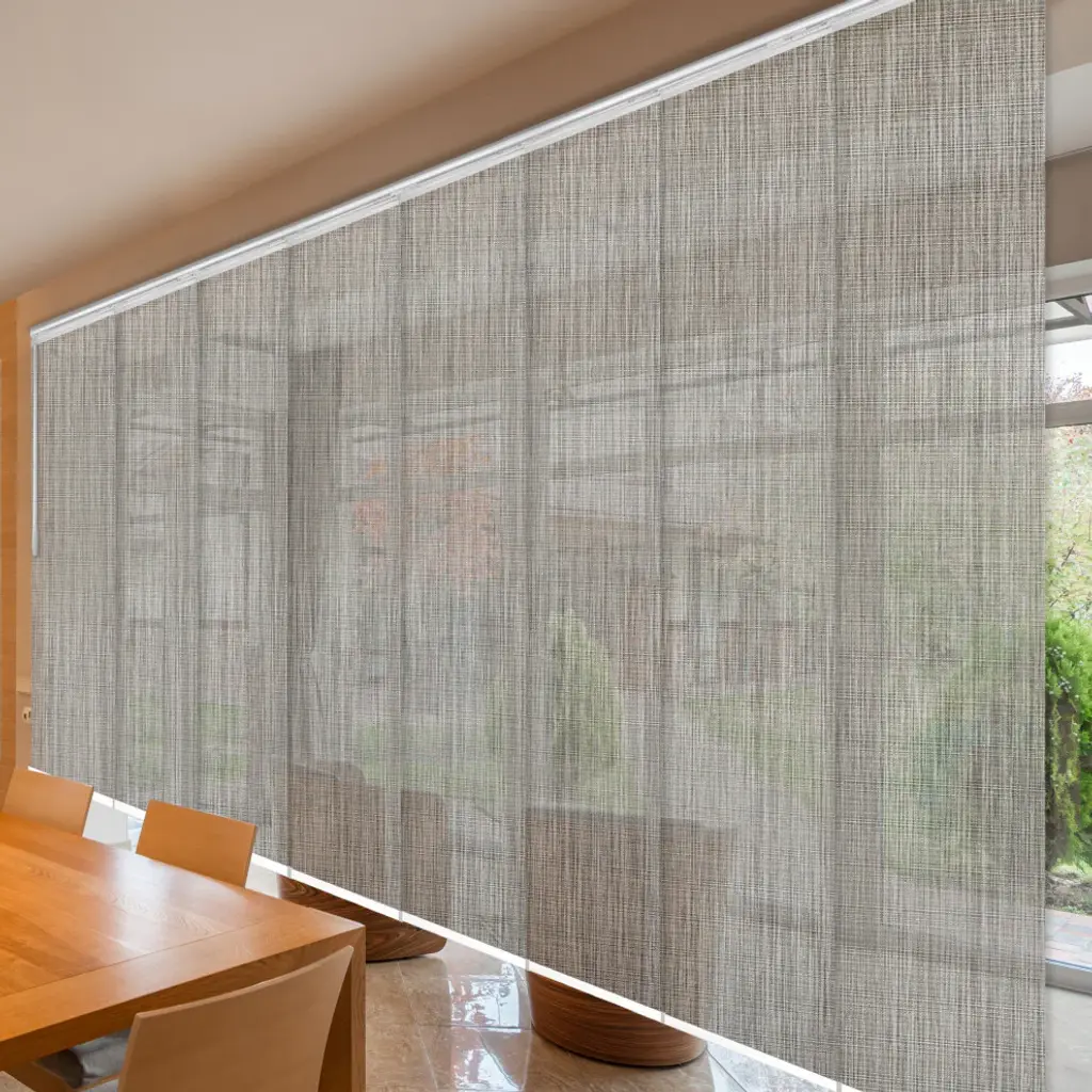 Central Design Products is pleased to introduce a new innovative panel track that offers easy 2-way installation, adding an alluring style and refined touch to your home decor. The double rail design of the track is sleek, compact, and reduces the overall footprint and weight of the installation, eliminating bulky, intrusive window treatments. Adjusting the panel height is a breeze � simply trim the panel, re-attach the liner, and install the panel weight. Detailed instructions are included.The panel track also features a patented slider design, made with aluminum and fitted with bearings that allow for durable and smooth operation. The sliders are stacked closer together than conventional panel tracks, reducing light bleed coming from the gaps between panels. This track has endless uses from dividing rooms, garages, offices, and closets to decorating windows and patios. Available in smaller sizes including 3, 4, 5, 6, and 7 panels. Extends from 130-175� wide. Each panel measures 23.5" wide and 91.5" tall, with a total installation height of 94" (includes the 2.5" rail track). The track can be wall or ceiling mounted. The panels can stack on the left or the right. The clearance from the wall is extendable from 1.25� to 3.25� and projection from the wall is extendable from 3� to 4.25�. Arias panel is made from 85% Vinyl 15% Polyester, with a light filtering shade that blocks 40% of the light.