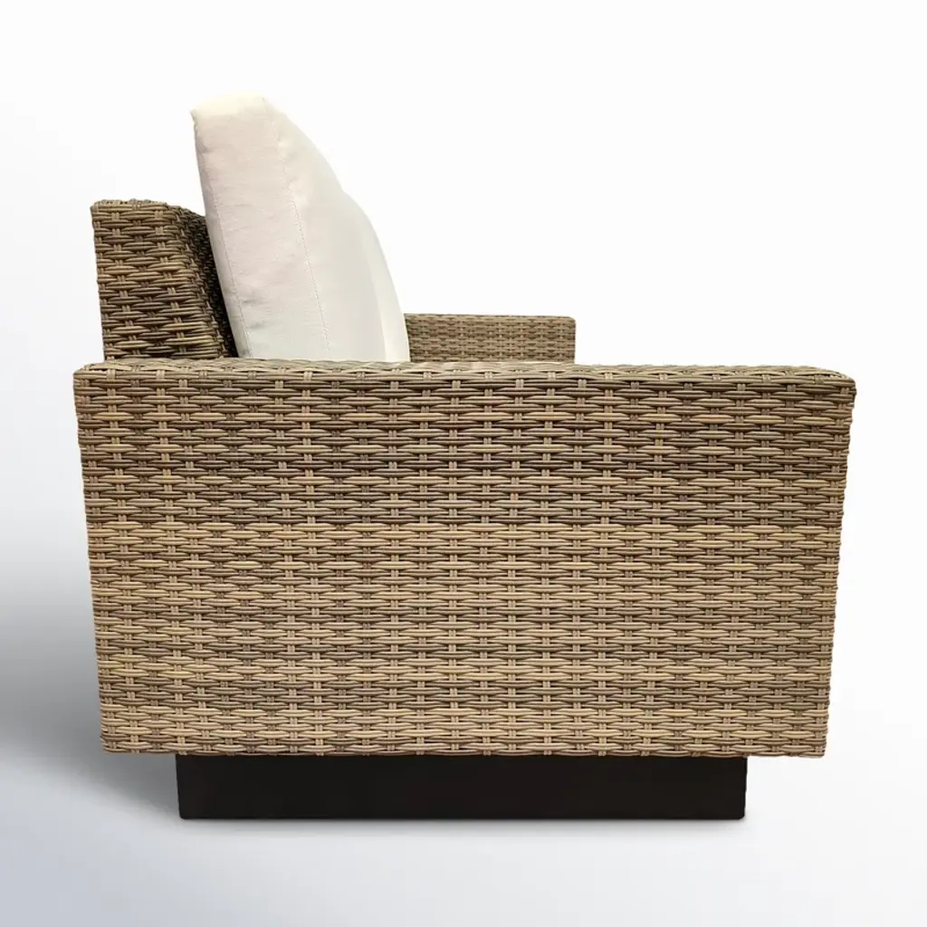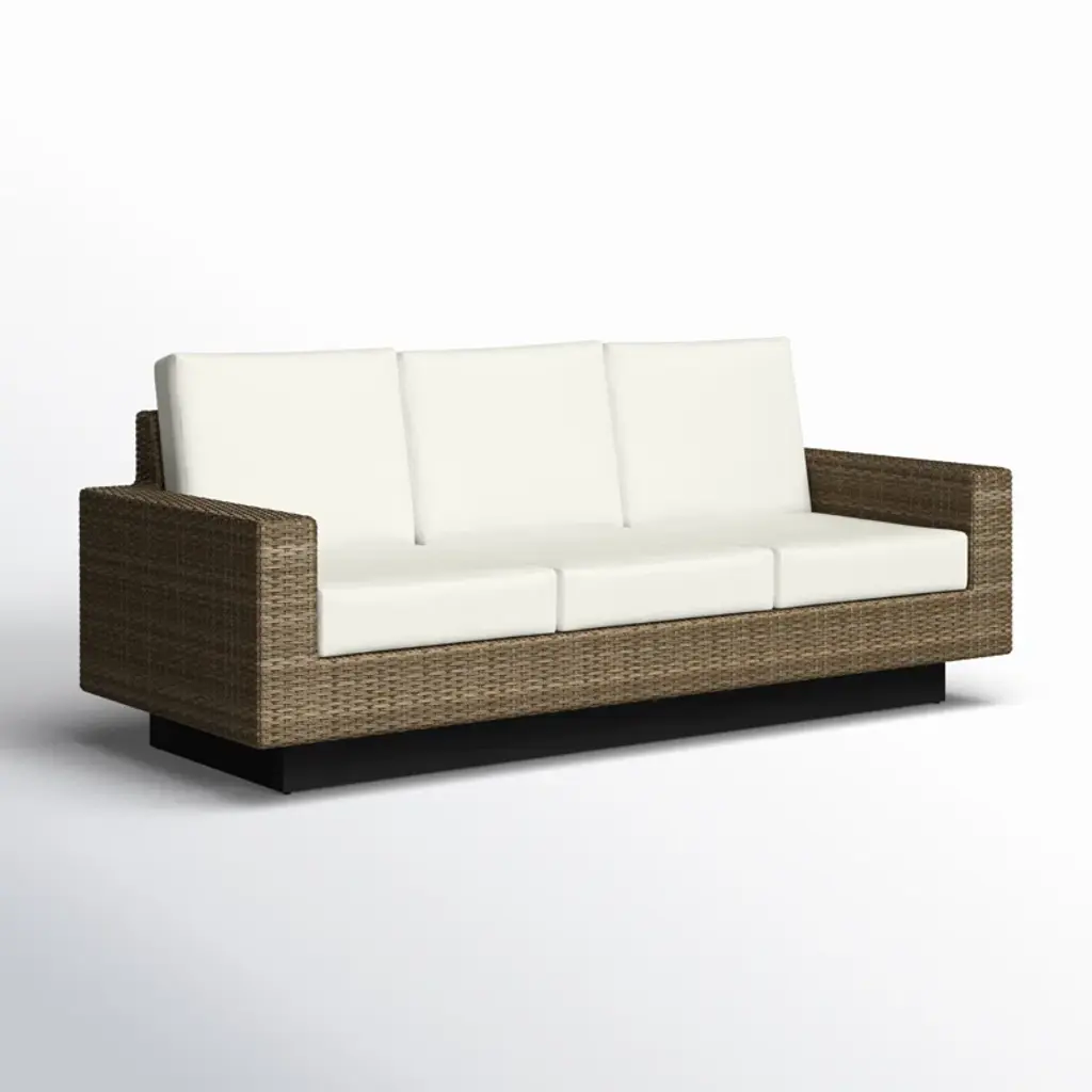 This wicker patio sofa brings a minimal design to your backyard, providing seating for three in style. The brown exterior material is made from breezy woven wicker, offering a natural look that blends well with any outdoor space, and it rests on a black plinth base. This sofa comes with UV-resistant white Sunbrella® fabric cushions, so they maintain their color even in the sunniest spots. We love that the cushion covers are removable and machine-washable, making maintenance a breeze.