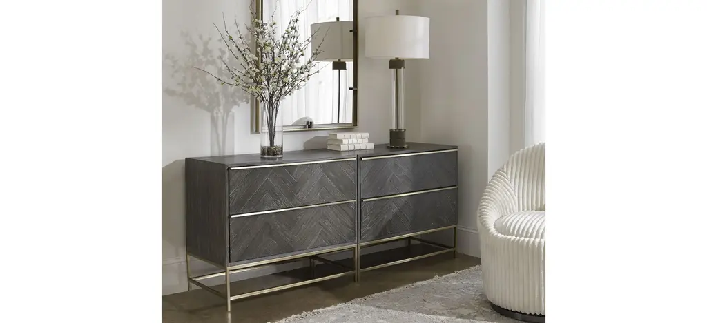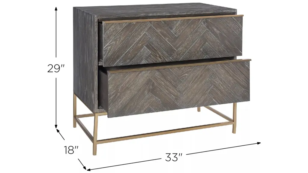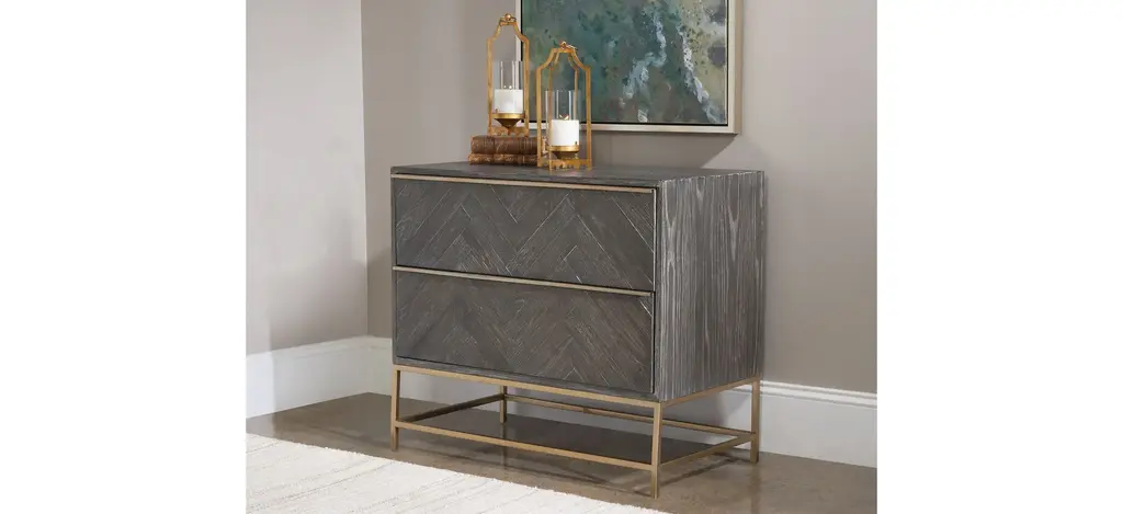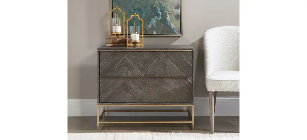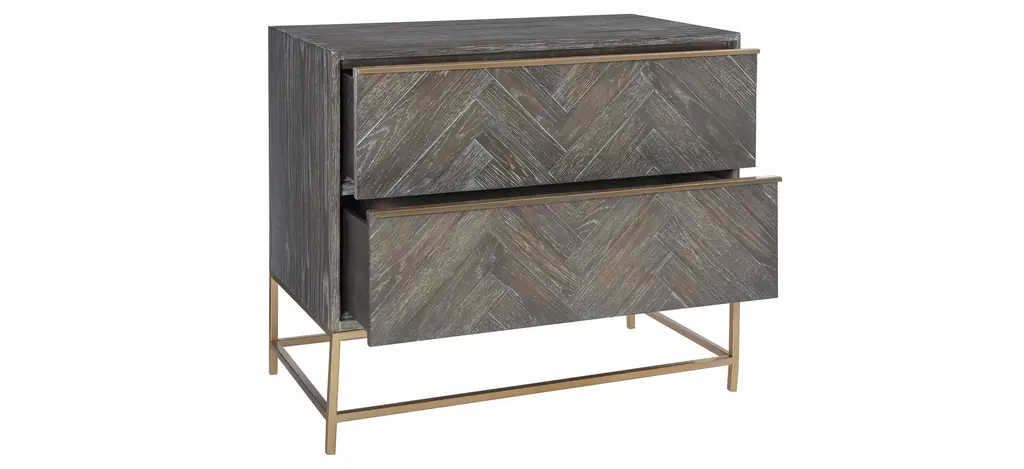 Showcasing understated style, this two drawer Armistead Drawer Chest is layered in a dark walnut finished oak veneer accented with herringbone drawer fronts. Rests on a steel base in plated brushed brass with coordinating drawer pulls.