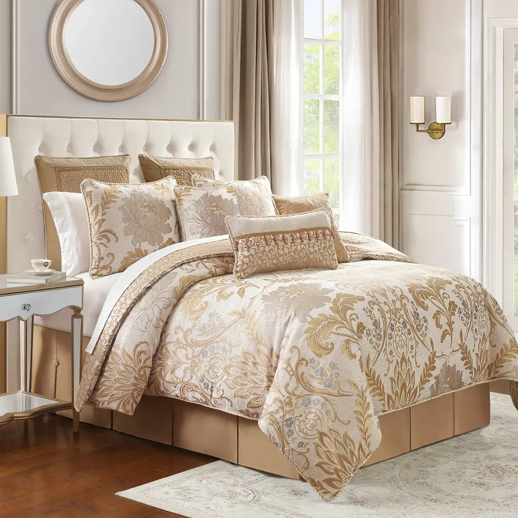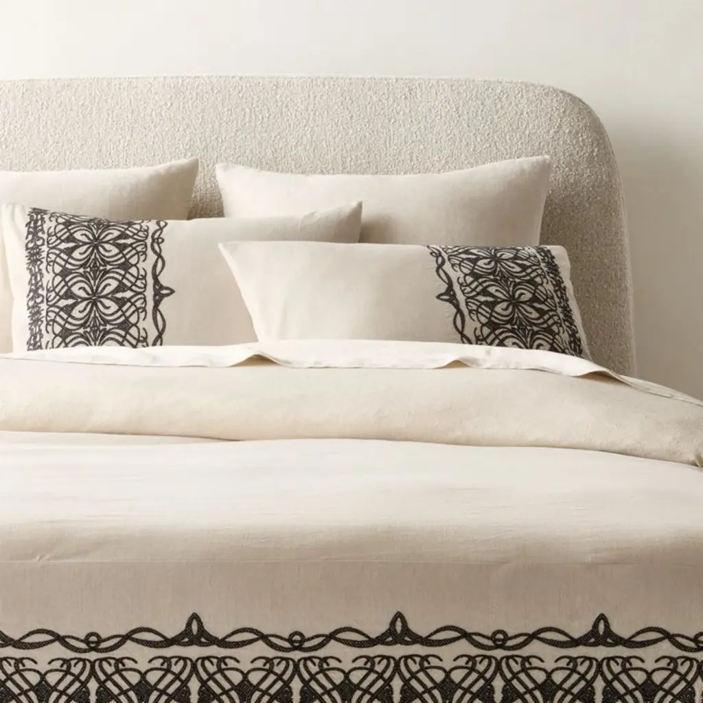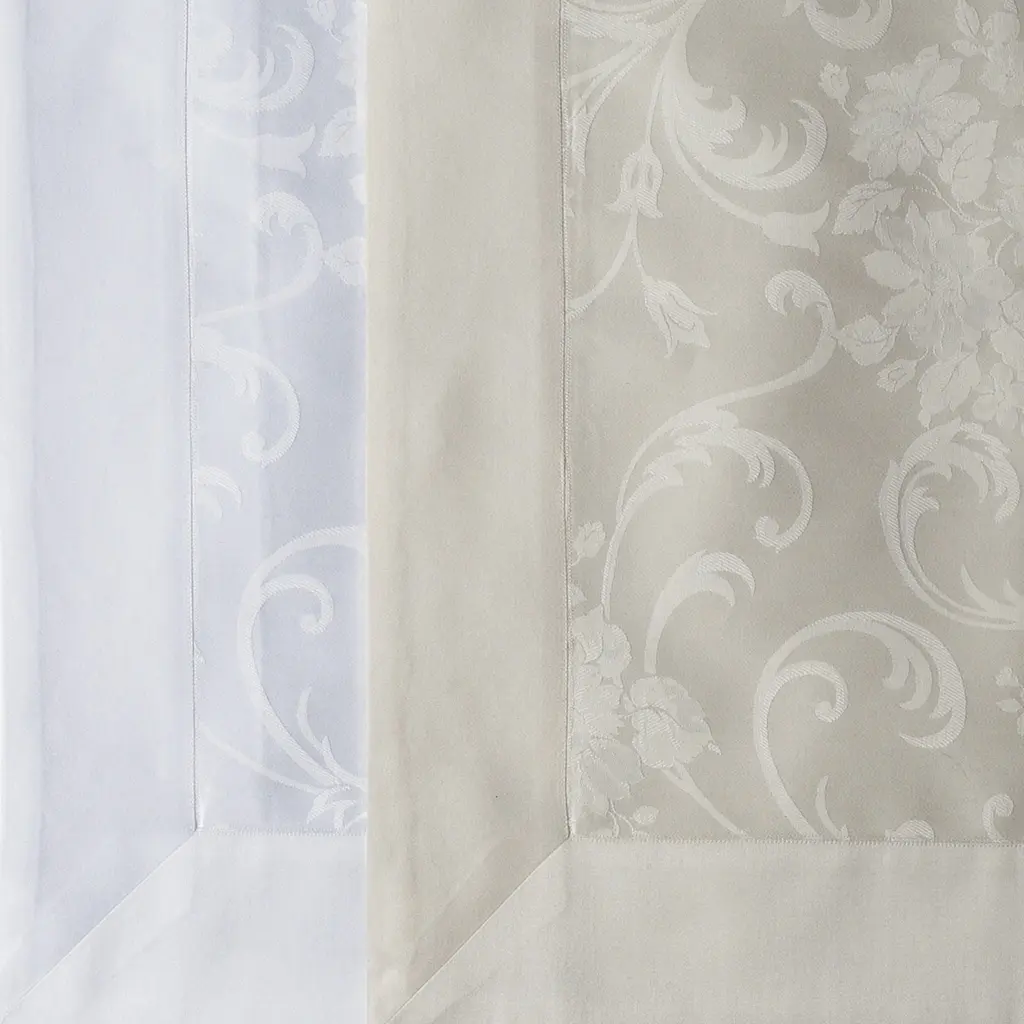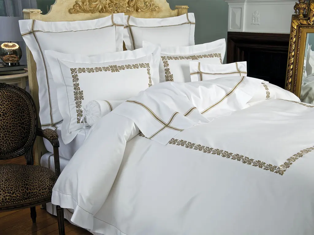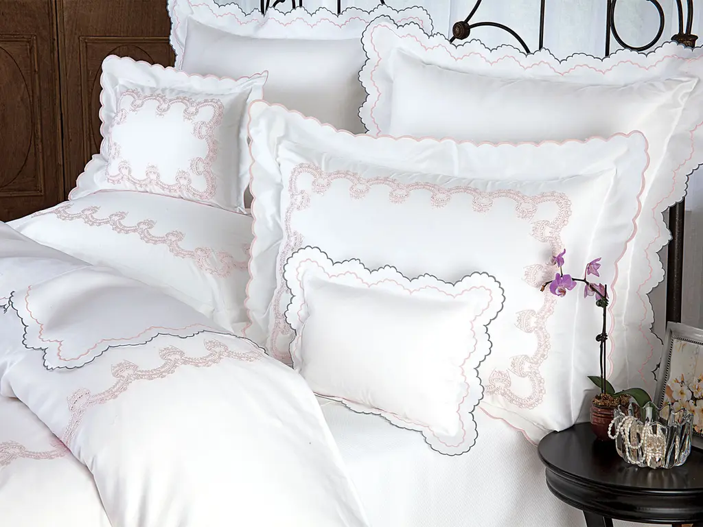 Reflecting the palatial splendor of priceless Persian carpets, lustrous 480 thread count, 100% Egyptian cotton damask is elegantly woven with a sumptuous floral motif in Mocha, Ivory, White or Smoke Blue. Superbly crafted in Italy with flanged edges and mitered corners, it will bring a wealth of beauty into your home.