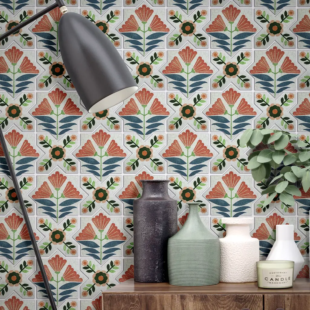 A vibrant mix of colors and shapes defines the Armony ceramic tile composition. Coral blossoms paired with green foliage and blue leaves pop against a soft matte gray backdrop, creating a striking, vintage-inspired look. Each tile is meticulously hand-painted, making it a perfect choice to bring a lively, artistic touch to both walls and floors. Crafted from terracotta, this design includes 32 star and 32 cross-shaped tiles per square meter. Price is per square meter. Contact the Concierge for more details.